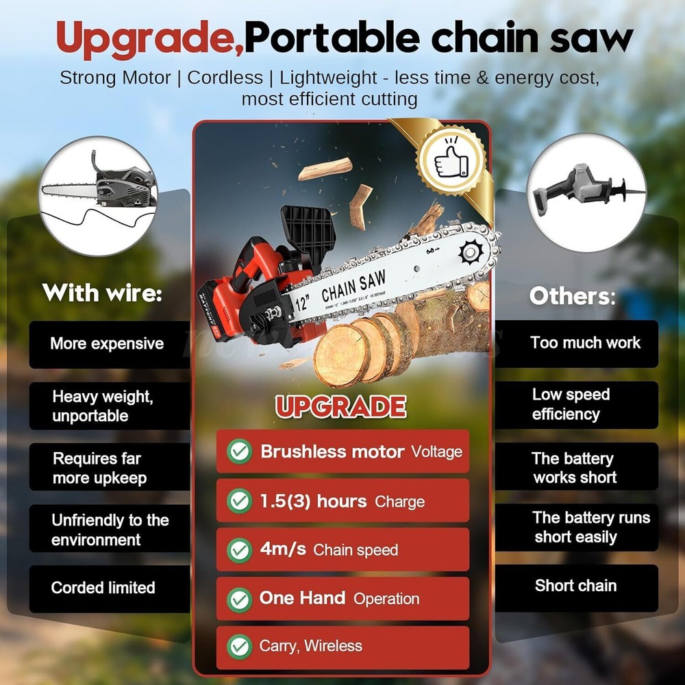Welcome to NewBeeGoods feedback | contact us Location United States Hours Open 24/7 Support Feel free to Contact us Electronics Motors Supplies Home & Garden Pet Supplies Business & Industrial Newbeegoods USD 55.56 12" Cordless Chainsaw 21V Brushless Electric Handheld Chain Saw w/Battery&Charge 【 High Power Brushless Motor 】our 12inch chainsaw adopts brushless motor with higher torque and stability, and has less vibration and heat than brushed motor, which reduces wear and makes the work more comfortable, extending the life of the tool. The chain speed can be up to 23 FT/S. Ideal tool for cutting firewood and felling trees with a much higher efficiency. Besides, This chainsaws build with lightweight technology and it avoid tiring to operate. 【 Premium Chain and Bar 】battery operated chain saw features 12inch low-kickback bar & chain. The chain is sharp, smooth, and easily got tension. With low kickback performance, it cuts through thick limbs, woods, tree branches and boughs, firewood fast and smoothly. 【 Tool-Less Chain Tensioning & Auto Oiling 】The electric chain saw is with convenient and ergonomic design. Just twist the knobs on the side to mount and tension the chain. No additional tools are required. Our battery chainsaw features a automatic oiler to keep the chain lubricated. The chain lubrication system not only makes for smoother, more efficient cuts, but also helps to prolong the life of the tool. 【 Safety Protection 】This power chain saw ceases running within 0.1s after releasing the brake, greatly reducing chances of injury. The brake plate is both recoil protection and prevents cutting debris from flying. Press swith and safty lock to start work. Non-slip rubber-wrapped handles offer multi-position grip with maximum convenience and comfort. 【 3.0Ah High-efficiency Battery 】The electric chainsaw can run for 1 hour in fully charged.The large capacity 3.0Ah Lithium-ion battery provides a continuous cutting 40-50min . A full charge only takes 100 minutes by using the fast charger we provided. Battery powered chain saw is more eco-friendly, less vibration, more lightweight and much safer while using. our 21V power tools are compatible with all Makita 21V batteries and chargers. Specifications Color: Red Product name: 12inch electric chainsaw Voltage: 21V Battery capacity: 3000mAh Output Power: 900w Battery Life:40-50MIN Chain Size: 12inch Chain Speed: 23ft/s (7M/S) Weight: 6.6lbs (3KG) Motor Driven: Pure Copper brushless motor Material: ABS + Soft Rubber + Metal What's in the Box 1 x Main Unit 1 x Chain 1 x Guide Bar 1 x Charger 1 x Thick Gloves 1 x Safety Glasses 1 x Lithium Battery 1 x Screwdriver 1 x Guard Plate 1 x Manual 1 x Oil Bottle Shipping Returns Payment We only support transactions through the eBay, not other channels. We support all payment methods recommended by ebay. We promise to protect all the private information of our customers. It will take about 1-5 working days to reach you within USA. If your item develops a fault due to a manufacturing defect please contact us and we guarantee a satisfactory solution. If you return your item for any other reason within 30 days from receipt we will refund you. 100% Feedback - we're proud of our 100% record and aim to keep it that way! Please contact us if you're not entirely happy with your order and we'll try to rectify it ASAP! Our aim is to ship within 24 hours. All of our products are shipped locally from USA, with warehouses in PA and CA. But most of our inventory is in CA, so 90% of our products are packaged and delivered to you at our CA warehouse. We recommend using economy and standard shipping for shipping, such as FedEx and USPS. Due to various traffic and policy limited, express shipping sometimes does not deliver in time. Normaly, you will take the item within 1-5 days after you place it. other products Consumer Electronics BGPS, Video, Camera, Radio, and other Smart Electronics Motors Supplies LED Headlighs, Fog Lights, Seat Belt, Jump Starter Home & Garden Home Storage, Cleaning, Lighting, and Other Tools Pet Supplies Training, Grooming, Living, Eating for Pet About Newbeegoods Newbeegoods was born in Nov 11, 2022. We have been deeply involved in the auto and motorcycle parts industry for decades, and since 2020 we have been creating our e-commerce company, as well as expanding our business into other industries. Newbeegoods is already one of our 24 e-commerce subsidiaries and we trade in European countries including the USA, UK and Germany, and have established our independent warehouses in each country of sale. We have the confidence and ability to provide consumers with 100% product quality assurance and after-sales service. quick links Listings About Us Feedback Contact Us On Feb 13, 2025 at 08:21:49 PST, seller added the following information: