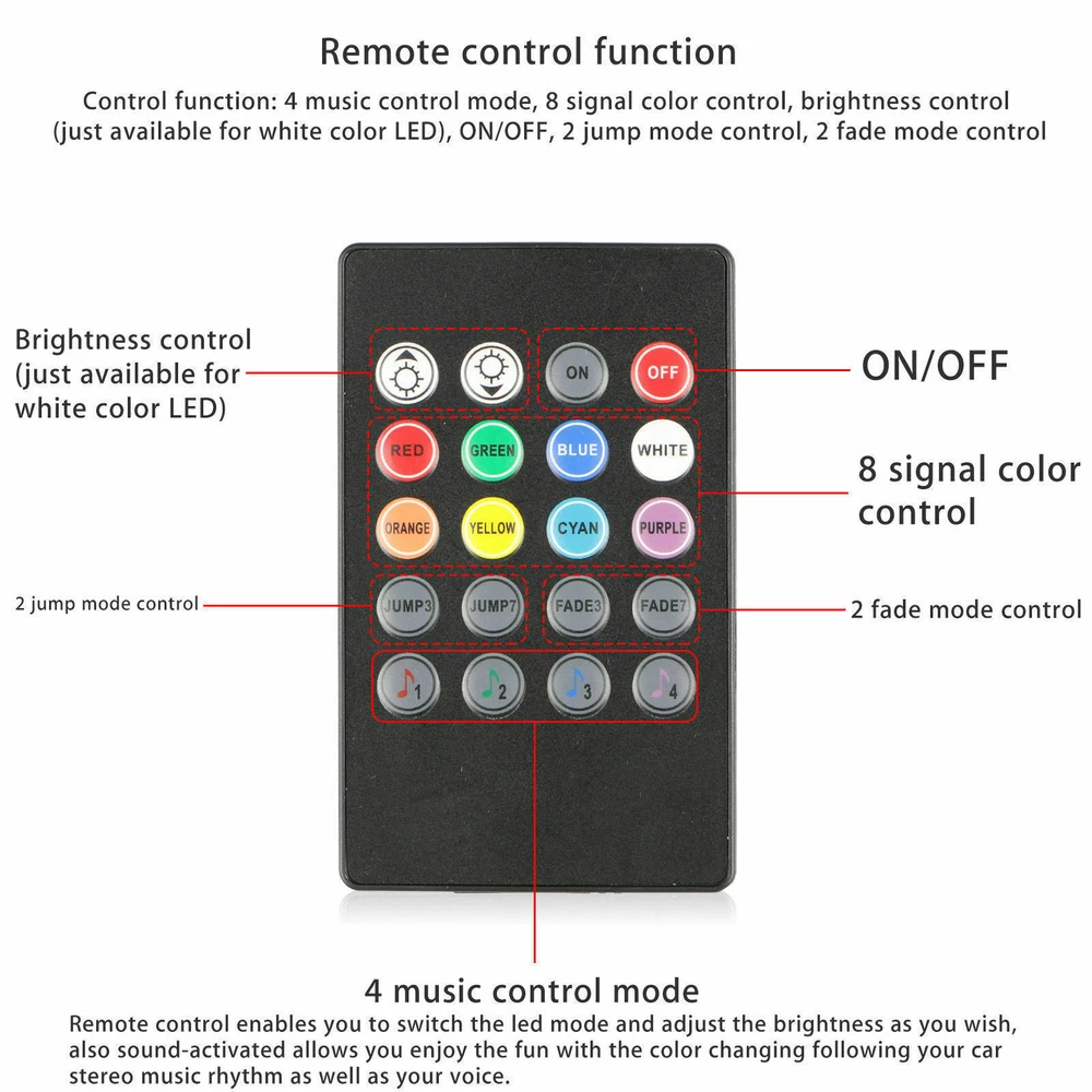 Product Description: Decorative your car by this RGB LED Strip Lights, changing the atmosphere with different color and lighting mode. Enjoy a beautiful, exotic and romantic atmosphere tonight. Product Features:Music Control LED Strip Lights 100% Brand new and high quality. Music Sync : Syncs with music rhythms, adding dynamism and vitality to your car's interior Romantic Atmosphere : Easily change the ambiance with exquisite LED decoration for romantic nights. Product Specifications: LED Type: 5050 SMD, ensuring high quality1. LED Quantity: 48 pcs (4 tubes, 12 LEDs per tube)1. Compatible Vehicles: All cars with DC 12V power supply1. Smart Control: Wireless Remote: Adjust 8 basic colors, brightness, speed, and patterns with ease. Plug-and-Play: Built-in switch on the cigarette lighter socket, no wiring modifications needed Installation & Usage: Easy Installation: Double-sided adhesive tape for quick setup on the car's interior floor or dashboard1. Versatile Applications: Suitable for car decoration, homes, bars, and other venues Note: The Total 16 colors includes 8 bright cyan/red/green/blue/white/orange/yellow/purple colors and 8 deeply cyan/red/green/blue/white/orange/yellow/purple colors. Easy to Install No need to modify the wiring, simply peel off the double-sided tape behind each strip and apply them under the seats or in the footwell area. A built-in switch on the cigarette lighter socket, easy to turn it on/off, no need plug and pull frequently. Specification Device Type: RGB Car Decorative Light Strip Strip Light Quantity: 4pcs LED Type: 5050SMD LED Quantity: 12pcs for one strip light Strip Light Size: 8.66" L x 0.55" W x 0.2" H (222 x 14 x 6 mm) Applicable: With cigarette lighter head, no need to modify the circuit. Material: PVC Voltage: DC 12V Power: 6W Power Cable Length: 2 cables: 6.3ft (1.92m), Other 2 cables: 4.6ft (1.42m) Weight: 7.83 oz (222g) Colo r: white/red/blue/green/ice blue/orange/yellow/pink purple Package Includes 4* Music Control LED Atmosphere strip light 1* Remote Controler 1* USB