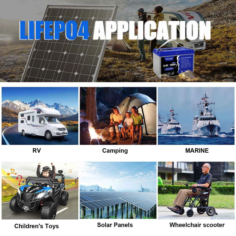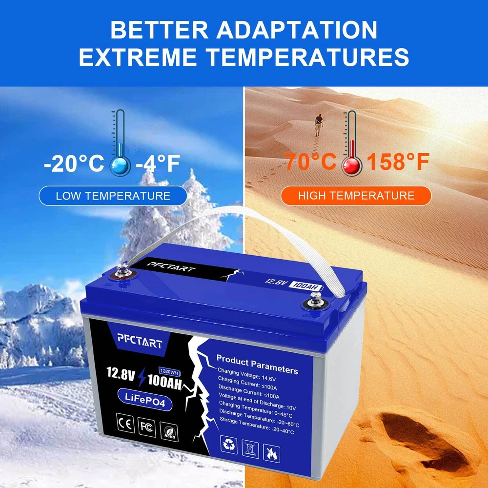 Features: BORN FOR RV LIFE An Affordable 12V 100Ah Deep Cycle LiFePO4 Battery.Your optimal & adequate LiFePO4 Battery for Camper Van, Travel Trailer, Caravan, Hauler, Motor Home, etc. 1/2 LIGHT WEIGHT IN 14.2KG Easily Pick up and go! Weighs 11.6kg, 1/2 lighter than 12V 100Ah lead-acid battery in 25kg.Effortlessly Install the 12V 100Ah LiFePO4 battery in your RVs, no any burden to you and your RVs. 1280Wh ENERGY STORAGE Provides100% 1.28kWh energy, a 2X increase in power output efficiency over lead-acid batteries (approx. 50% usable capacity in a 12V100Ah AGM SLA Lead-acid battery at 1C discharging rate).Timeusb LiFePO4 battery delivers the ideal result on stronger energy storage that users of RVs expected. 100% SAFE WITH SUPERIOR BMS 100A Battery Management System (BMS), protects the battery from safety hazards by providing five types of protection: overcharging, overdischarging, overcurrent, short circuit, and high-temperature environment above 60°C/140°F. It’s a 100% green energy that is free of heavy metals and rare metals, non-toxic, and non-polluting. EFFICIENT DELIEVERY & 24Hrs SERVICE PFCTART provides customers with a responsive and professional customer service team that provides targeted battery solutions within 24 hours of question receipt.Given Timeusbahighly effective after-sales and delivery team, our customers in the United States can receive PFCTART products within 2-7 working days. ATTENTION It is an energy storage battery rather than a start-up battery, and it CAN NOT be used for any kind of golf carts, trolling motor or starting. Package Included : 1 * 12V 100Ah LiFePO4 Battery Pack Please be noted : battery charger is not included. Specifications: Battery type: LIFEPO4 MODEL: 100Ah 12.8V(4S1P) Rated capacity: 100Ah(1280WH) Normal voltage: 12.8V Discharge termination voltage: 10.0V Charging voltage: 14.6V Internal resistance: ≤180mΩ Single cell: IFR 3.2V 100Ah Standard charging. Continuous current: 0.2C5A Continuous voltage: 14.6V Cut-off current: 0.01 C Standard discharge: Constant current 0.2C5A end voltage 10.0V Max. charging continuous current: 100A Maximum discharge continuous current: 100A Operating temperature range. Charge: 0~45℃ Discharge: -20~70℃ Product size: 329*171*235mm Weight : 11.6kg BMS protection: Cell overcharge detection voltage:3.90V±50mV Cell overcharge recovery voltage:3.80V±100mV Cell over-discharge detection voltage:2.00V±100mV Cell over-discharge recovery voltage:2.30V±100mV Rated operational charge current:100A Over current detection:150±30A PCM impedance:≤50mΩ Please note : BMS it supports a maximum of 48V series or 4 batteries of the same voltage and the same capacity in parallel installation, please fully charge the batteries before series/parallel installation to ensure that each battery is at the same voltage and the same capacity.