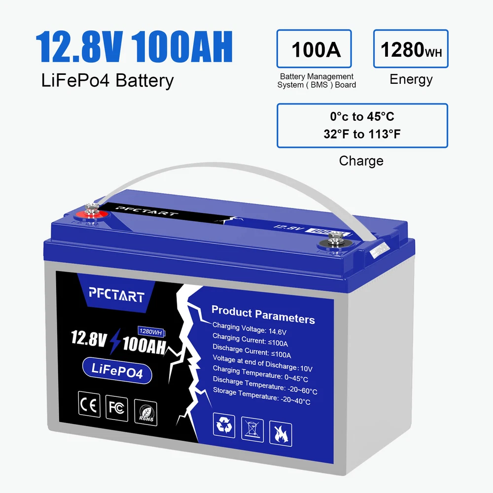 Application: On/Off Grid Solar System, RV Battery Water Protection Class: IP65 Manufacturer Warranty: 10 Years UPC: Does not apply Type: Lithium Battery Battery Technology: Lithium-Ion (Li-Ion) Max. Charge Current: 100A Item Weight: 25.57 lbs Battery Capacity: 100 Ah Voltage: 12 V gtin13: Does not apply BMS Board: 100A Max. Load Power: 1280W Working Temperature Range: Charge: 0°C-50°C Discharge: -20°C-60°C Max. Continues Discharge current: 100A Energy: 1280Wh Amp Hours: 100 Ah Brand: PFCTART Size: 13 * 6.73 * 9.25 inches (L*W*H) Battery Size: 12 V Chemical Composition: Lithium Iron Phosphate (LiFePO4)