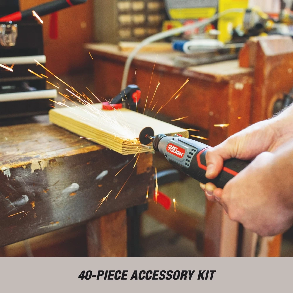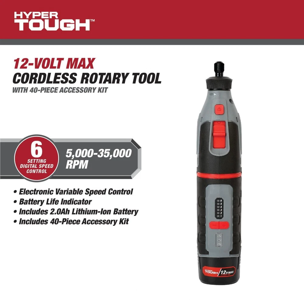 12V Max Cordless Rotary Tool is perfect for detailed work, offering versatility with its 40-piece accessory kit. Powered by a 12V 2.0Ah lithium-ion battery, it delivers variable speeds from 5,000 to 35,000 RPM with a max setting for more demanding tasks. The tool features a battery capacity indicator and LED speed controls, allowing easy adjustments via Add & Subtract buttons. Weighing just 1.32 lbs, it’s lightweight and comfortable to use for extended periods. The kit also includes a charger, making it ideal for any project requiring precision and control. 12V Max Cordless Rotary Tool with 40-Piece Accessory Kit Includes 12V 2.0Ah Lithium-Ion Battery and Charger Variable speeds (6 + MAX setting) Battery capacity indicator LED indicator for variable speed via Add & Subtract button