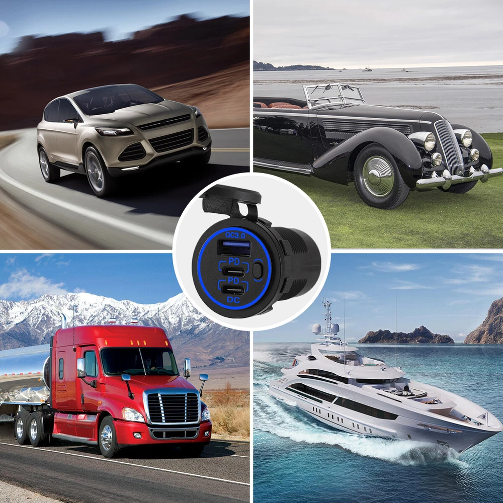12V-24V Fast Car Charger Socket QC3.0 + PD36W USB C Outlet for Boat RV Marine US FEATURES: 👍 Dual USB-C 36W PD3.0 Car Charger: Charge your devices at maximum speed with dual USB-C ports, delivering20W for 12V vehicles or 36W for 24V cars in a single port. 👍 18W QC3.0 USB Port: The QC3.0 12V USB outlet charges 80% of compatible devices in just 35 minutes, providing 4 times faster charging than conventional methods and compatibility with most QC versions. 👍 Button ON/OFF Switch: The multi-port car USB charger includes a switch to control 3 USB port LED lights and the battery. Turn it off when not in use to prevent battery drain. (Note: The 12V outlet socket is OFF by default; press the switch to charge your devices when your car is started. ) 👍Upgraded USB Outlet Sockets: Designed with an extended body for faster charging, the USB-C outlet adapter boasts a total power output of 58W. The included wire features a 10A fuse for added safety. 👍Wide Application: Compatible with 12V/24V vehicles and various devices, including cellphones, tablets, MP3/MP4 players, GPS, cameras, and more. Ideal for cars, trucks, boats, RVs, motorcycles, and more. SPECIFICATION: Type:Car Charger Material:Plastic Number of port :3 Wire Harness Length:60cm Voltmeter Color:Blue Maximum Output Power:QC3.0 (18W)+PD20W+PD20W Voltage:12V-24V PACKAGE INCLUDED: 🎁1 x Car charger Payment Return Warranty Shipping Contact us Payment 1. We accept payment via PayPal. Use PayPal at checkout to pay with credit or debit. 2. Immediate payment is required. Shipping will be arranged within 1 business day once payment is cleared. Return 1. We stand behind our items and offer 60 days warranty. All items are in new and working condition unless specified otherwise elsewhere in the description. 2. All Returns - defective or otherwise - MUST BE PREAUTHORIZED to guarantee refund or exchange. Please contact us to get an authorization and return address. 3. Buyer agrees to pay for the cost of re-shipment for undeliverable or wrong addresses. 4. Buyer is responsible for Return Postage as well as a 20% restocking fee if return/replacement is not a result of our mistake such as wrong item. 5. Replacement or Refund will be made upon receipt of the returned item. Please include tracking number so we can process ASAP. If you do not wish to wait for a replacement, please repurchase the item. 6. ALL REFUNDS will be processed via PayPal. Please double check via PayPal history and transaction for confirmation. PayPal will send it back to whatever you used to pay within 3-5 days. Warranty The warranty shall not apply to the following circumstances: a) Damage caused by undue ware&tear, misuse, improper installation or operation, neglect, accidents. b) Damage caused by natural disaters, flood, fire, lightning or pollution. c) If item was opened, any parts removed or repaired by any unauthorized person. Shipping FREE SAME BUSINESS DAY MONDAY- FRIDAY SHIPPING FROM USA. All orders and payments received before 4PM EST (1PM PST) will be shipped the same business day. All other orders within 1 business day. No shipping on Weekends or US Public Holidays. No responsibility for any custom duty Shipping information will be updated when available. Contact us We have always been trying to provide the best service and reliable products for every customer, however, accident may happen sometimes, please contact us to resolve any issue before leaving a negative feedback.