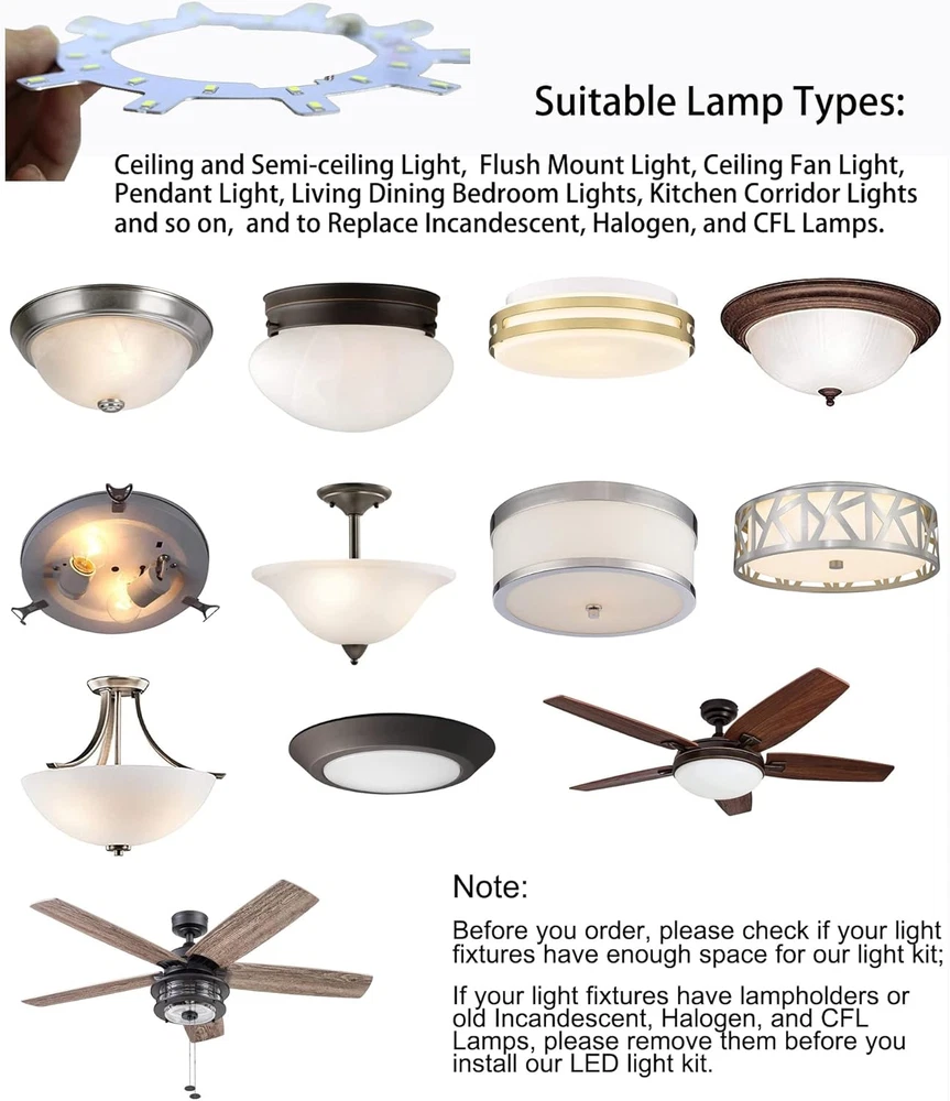 Store New Arrivals Add to Favorite View Feedback Contact 12W LED Ceiling Fan Light Kit Panel for Flush Mount Ceiling Fan Light,Retrofit LED Light Engine Upgrade PCB Light Board, 4500K Natural Light Description Light Source Type LED Number of Items 1 Power Source Corded Electric Incandescent Equivalent Wattage 80 Watts Control Method App Power Consumption 12 Watts Frequency 6E+1 Hz Controller Type Push Button Unit Count 1.0 Count Batteries Required? No Light Type LED Bulb Shape Size B9 Average Life 3E+4 Hours Product Dimensions 6.4"W x 6.4"H Material Aluminum Efficiency High Pattern Name 12W-Gear Model Name 12W LED Ceiling Fan Light Kit Specific Uses For Product Replacement LED Light Kit for Close to Ceiling Light Fixture, Ceiling Fan Light, Pandent, etc. Item Package Quantity 1 White Brightness 900 Lumens Indoor/Outdoor Usage Indoor Light Source Wattage 12 Watts Brightness 1200 Lumen Light Color Natural Light Item Weight 3.52 ounces Connectivity Technology Normal bulb Special Features Energy Efficient Special Feature Energy Efficient Color Rendering Index 85 Bulb Base E26 Number of Lights 24 Color Temperature 1200 Kelvin Color White Wattage 12.00 Accepted voltage frequency 100 to 240 Volts and 50 Hertz to 60 Hertz Shape Round Batteries Included? No Voltage 120 Volts (AC) Shade Material Acrylonitrile Butadiene Styrene, Plastic, Metal, Aluminum, Shell Finish types Metal Included Components Connector 【Easy to Install, Mount, and Wire】This light kit has the built-in magnets, it can be directly attached to the metal base; If the base is not metal, please remove the magnets and install the light kit on the plastic/aluminum base with self-tapping screws;If your lamps have lampholders and you don't want to take them off, just use our specially designed connector to install the light kit, just as simple as changing a bulb. 【Long Lifespan and Energy Saving Technology, Ideal for Bulb 】LED light kit has better performance in heat dissipation, which allows delivers longer life than other LED bulb; It's built to last 50,000 hours lifespan, it's 5 times longer than CFLs(10,000hours). We also offer 3-year warranty; Lowest maintenance, risk-free purchase. Save up to 80% on your energy bill – Energy efficient 12 watt LED light kit to replace your 60 watt bulbs for immediate savings now! 【Perfect Light Distribution, Brighter Than Normal Bulbs】12W light kit has 24 LEDs spreading around the panel evenly, equivalent to 60W incandescent bulb, so the light distribution is perfect and very bright. Instead, the normal LED bulbs has less LEDs, and when it's installed on the ceiling lamp, it's parallel instead of facing down, so the light does't distribute completely down creating some shadow region. 【More Secure Than Normal LED Bulb or Incandescent and Fluorescent Bulbs】This circle LED panel light kit has the latest integral driver and 85~265V AC drive technology; Low-heat radiation,high-end solution for your fancy ceiling lights;.With its gear design aluminum PCB( Printed Circuit Board),the heat dissipation is perfect and much better than normal light bulb, prevents the overheating of the light, reduces the risk of fire. 【Applications】Wide Applications - This LED light kit can upgrade ceiling flush light,ceiling fan Light,T9 fluorescent bulb (removal of original ballast),Pendant light,living dining bedroom lights, kitchen corridor lights and so on, to replace incandescent, halogen, and CFL lamps. 12W is equivalent to 60W incandescent bulb. Product Description LED Light Kit for Flush Mount Ceiling Light and Ceiling Fan Light Convert your existing light fixtures into state of the art LED fixtures. Take advantage of their high lumen output and energy saving LEDs while producing an even light spread. Long-life Rated for 25,000 Hours, 3-Year. Keep your existing decorative fixtures and upgrade to energy efficient LED technology Our LED light kits are suitable for most fixtures and are available in a wide range of sizes and color temperatures, and super easy for do-it-yourself homeowners to install. Simple Wiring for Easy Installation Multiple Applications These LED kits can be used to upgrade a variety a different fixture types in your home or business. For use with ceiling fixtures and ceiling fans in bedrooms, hallways, stairwells, closets, basements, garages, storage areas, porches and more. Our LED Light Kits Family Retrofit Kit for Ceiling Flush Light,Ceiling Fan Light,Pendant,Lantern,Garden Light,etc. The built-in magnets can be directly attached to the metal base; Remove the magnets, you can install it on the plastic base with screws. High Quality Construction Professional Company Makes Professional-grade Lighting Products OLYMSTAR is a lighting products manufacturer, has its own facilities to make professional-grade indoor and outdoor lightings. We offer the most valuable products, affordable prices and a great service to the home owner, builder, and contractor, offer a distinctive array of lighting solutions that reflect your individual personality, tastes and plans, bring you an unparalleled variety of exciting style families, unique handcrafted finishes, and unequaled quality, dramatically enhance your home's safety, security and beauty. ABOUT US We offer the best prices around on high quality products. Our E-store includes media such as books, movies, music and games while offering electronics, toys, sporting apparel, clothing, tools, general home, garden items and more. SHIPPING We are always working hard to ensure your package arrives as soon as possible. Please understand that some factors like weather, high postal traffic, and the performance of shipping companies are outside of our control. We offer free shipping to the lower 48 states and ship within 2 business days of payment, usually sooner. We do not accept P.O. Boxes. Please provide a physical address. For shipping outside of the continental USA, we only use eBay's Global Shipping Program.The item is shipped to KY and then se