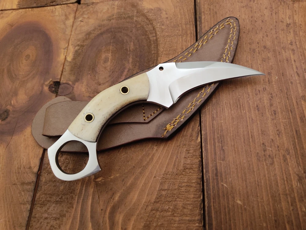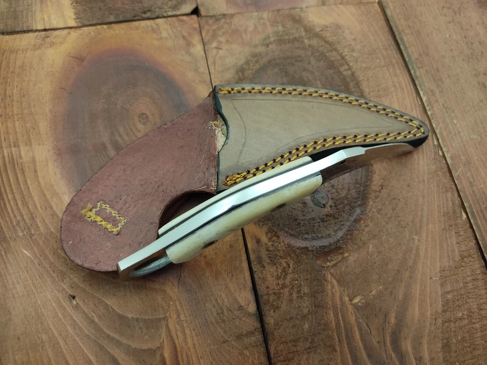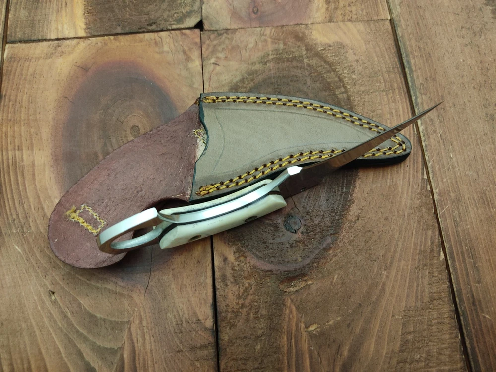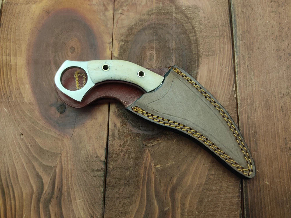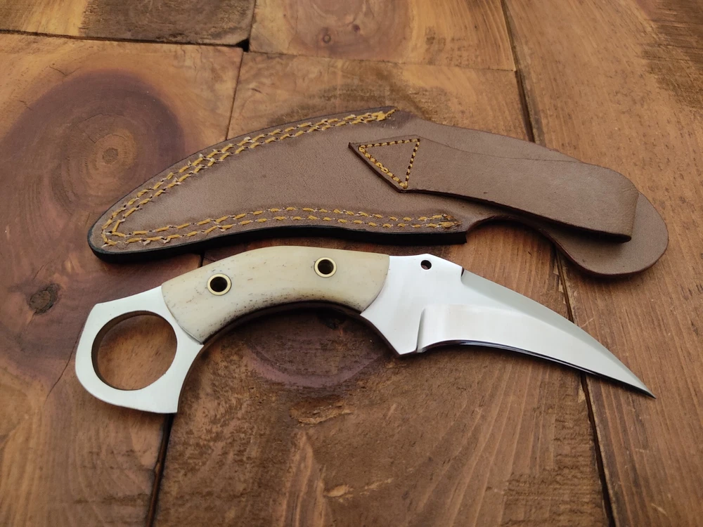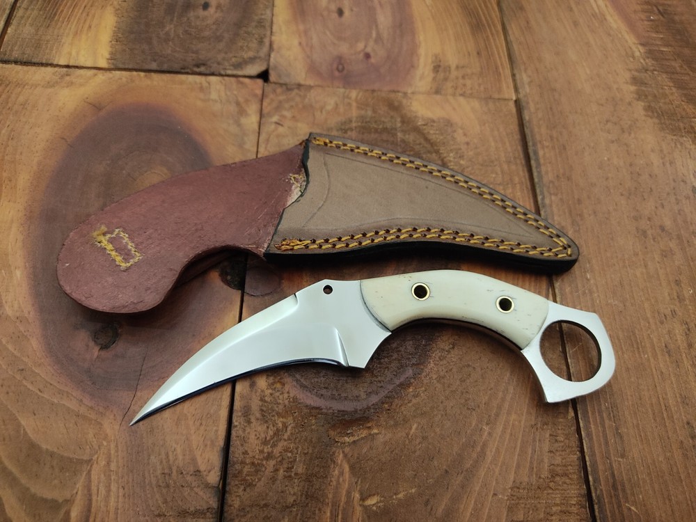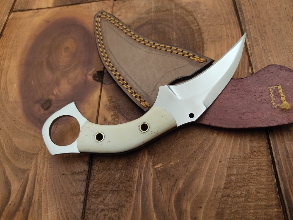 ITEM # HM-134 Fabulous Unique THUNDER STORKE Custom MADE KNIFE Custom Handmade Forged 12c27 Stainless Steel Camping Survival Outdoor Vintage Pocket Hunting Fixed Blade Karambit Knife 12c27 High Carbon Stainless Steel holds an edge very well and is optimum for hunting and skinning use as well as tactical and military tasks. The steel is very corrosive and will tarnish and turn the blade black when blood and acidic liquids or chemicals get onto the blade. The blade will still work fine, but will lose the satin color when it was new. Bone Handle 12c27 High Carbon Stainless Steel Blade RAZOR SHARP Gorgeous Handle & Blade 7.1" Long | Blade is 3.3" Long | Handle is 3.6" 4 mm Thick Blade | Beautiful Worked Blade & Handle WORK OF ART This prestigious unique HUNTING knife was designed and custom made by THUNDERSTORKE . Blade was given excellent heat treatment and Rockwell hardness of the blade 58 to 60 . PAYMENT: As Per Ebay Requirement DISPATCH TIME: 2 to 3 DAYS AFTER RECEIVING YOUR PAYMENT COURIER / SHIPPING: When we print the postage label there is a number that is on the label. This number is called a "Delivery Confirmation Number". The post office is not like UPS or FEDX where they scan the mail at the receipt point and then track it to your door. What the post office does is scan the item when it is delivered (if they choose to) and then you will see that it was delivered. Sometimes they do scan it when you drop it off, but this is rare. If they did scan it at a sorting facility, you see it moving across the USA. But this is very rare. - eBay confuses the buyer with the "tracking number" next to the post offices "delivery confirmation number" when in reality there is not a tracking number. You can ask this at the post office and they will concur. We print labels off the internet using eBay's USPS shipping program and then we drop the packages off at the post office, similar if you were mailing a stamped letter. The post office is supposed to scan it "received" and they do this about 50% of the time. But sometimes they do not scan them. Do not worry, we did mail the item and it is on it's way to you. COMBINE SHIPPING OFFER: We Do Combine Shipping Discount On Multiple Purchase are as Follow. BUYER FEEDBACK AND Detailed Seller Ratings (DSR) SCORES : We spend a lot of time trying to describe our knives 100% perfect in detail, but sometimes we miss things. In the event that we missed something, upon inspection of the item when you receive it, let us know by contacting us via the "Contact Seller" link (next to our user ID profile) and allow us to solve your problem before leaving us low DSR scores (Detailed Seller Ratings) or neutral and negative feedback. - Help us, help ourselves to do better, with our future business on eBay by allowing us to correct our faults and fix the sale with you to a positive. We need to keep our scores high to continue to offer our great knives for sale on eBay. KNIFE CARE and SHEATHS : Leather sheaths pull moisture out of the air and tend to rust knife blades if not stored properly. When you are done using the knife, store it away from the leather sheath and put gun oil, Seal 1, or a similar protectant on the blade and store. Damascus, 1095HC, and D2 can rust and develop stains if not lubricated. AGE RESTRICTION: WE DON'T SELL KNIVES TO ANY ONE WHO IS UNDER AGE . GUARANTEE: If you are not happy with your purchase, we offer you a peace of mind guarantee if you return the product within 7 working days. We will refund your money back immediately ON RECEIVING THE KNIFE BACK IN ORIGINAL CONDITION. DELIBERATE TAMPERING WITH THE PRODUCT OR MISUSE WILL NOT QUALIFY FOR THE REFUND. SHIPPING CHARGES ARE NON-REFUNDABLE. DISCLAIMER: WHEN YOU ARE BIDDING ON THIS KNIFE YOU ARE CONFIRMING US THAT YOUR AGE QUALIFIES FOR THIS PURCHASE AND THIS IS A LEGAL PURCHASE. TAKES NO RESPONSIBILITY FOR ANY ILLEGAL PURCHASE Thank you, - Props in the Photos are NOT INCLUDED. Knife & Sheath ONLY .