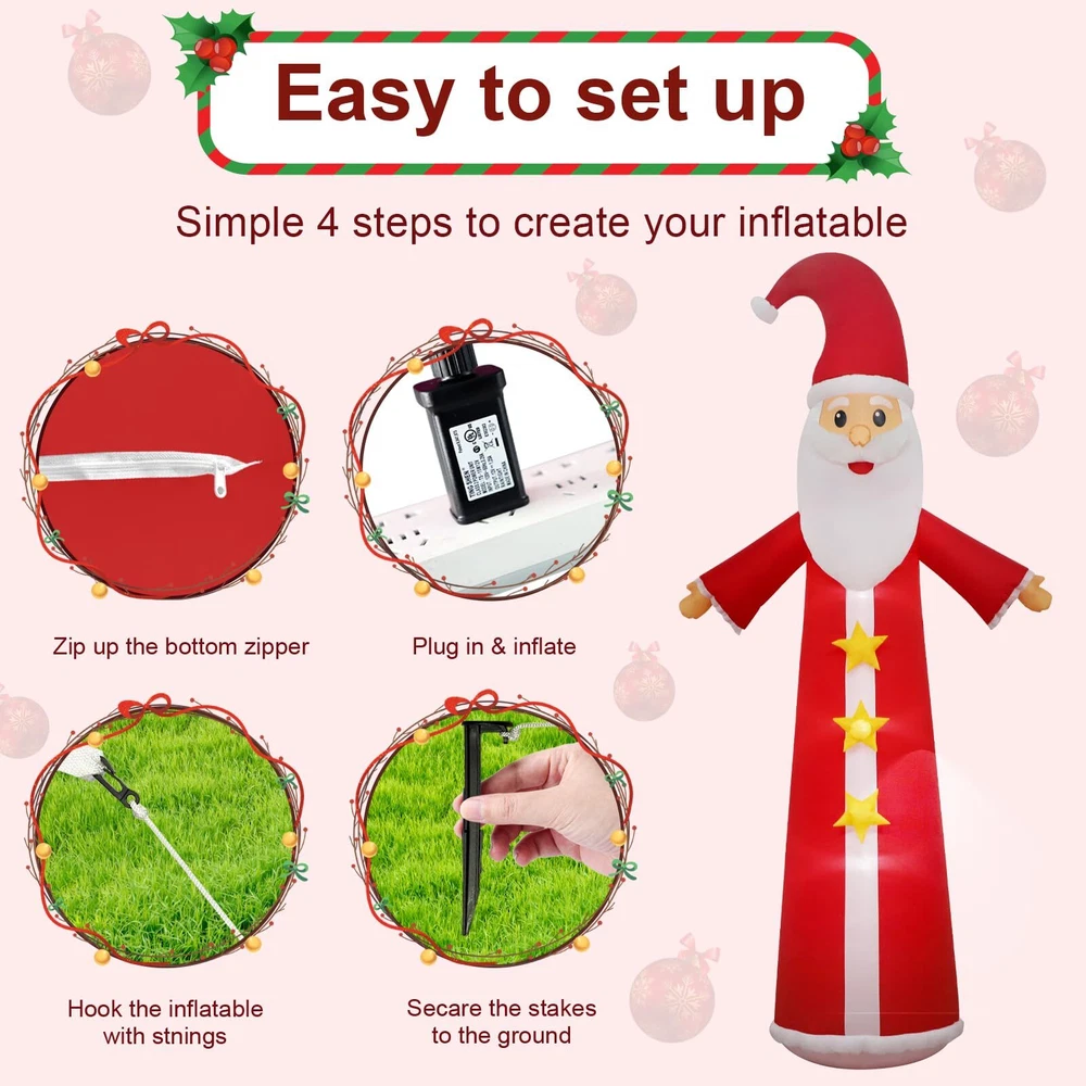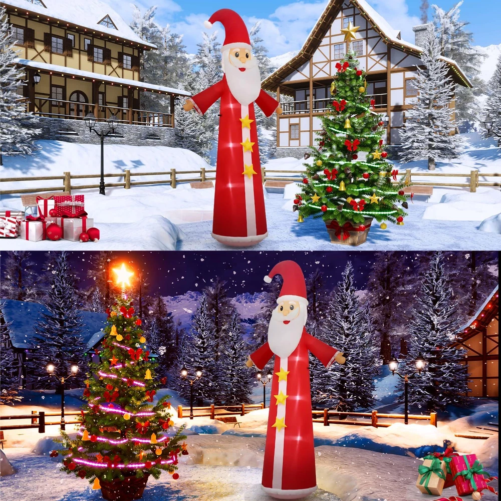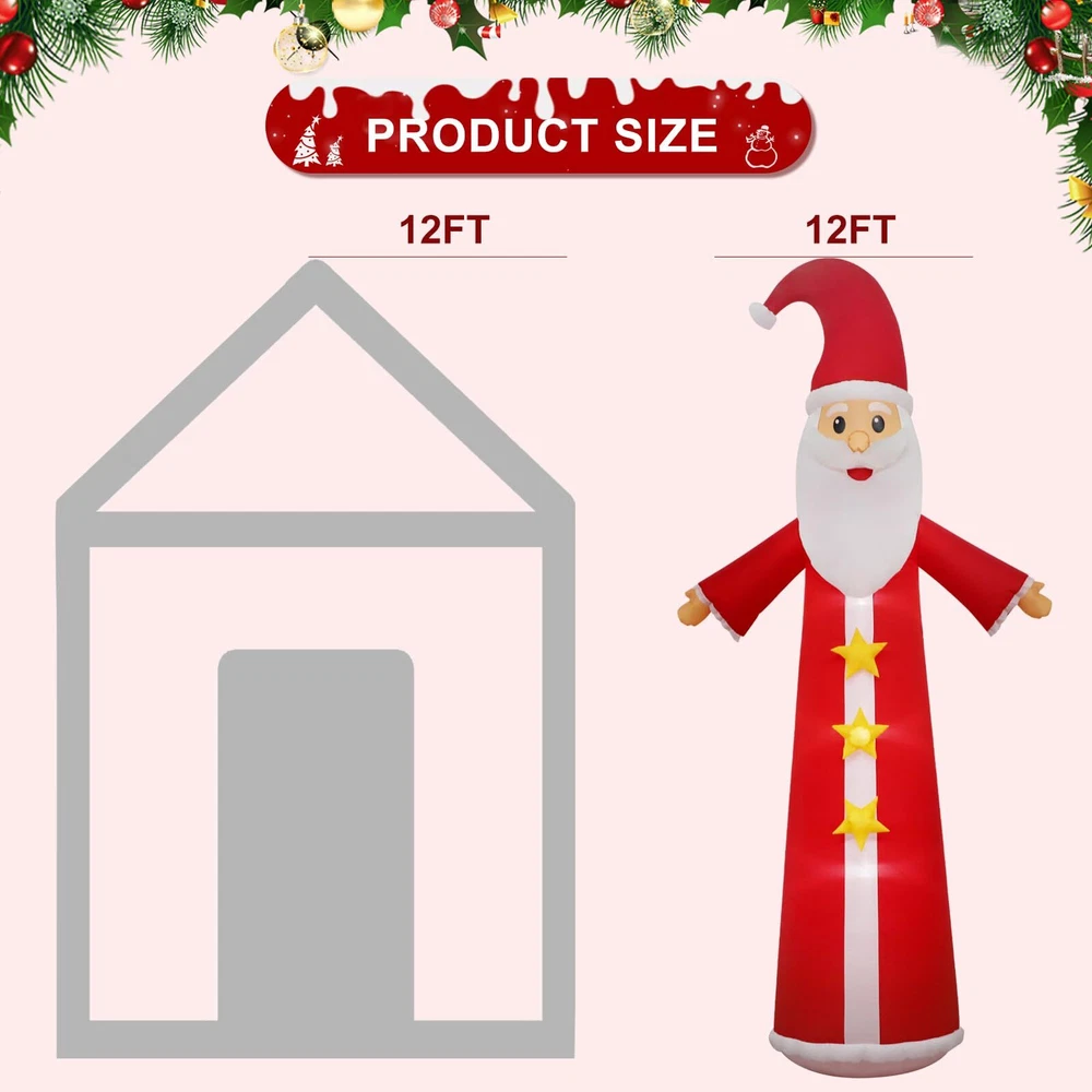 12ft Christmas Inflatable Outdoor Decorations, Slender Santa Claus Inflatable Yard Decoration Adorable Inflatable Snowman Decoration: Perfect for Christmas Outdoor Yard Decoration, Holiday Inflatables, Party Event Decoration, Christmas Decoration for Yard Garden. A jumbo 12ft tall inflatable Santa wearing a magic hat. Bring joy and happiness to your children, kids also love to give them as Christmas gifts to family, friends or loved ones. Make your yard a warm welcome from your neighbors! Built-in bright LED lightS: There are 4 eye-catching LED lights inside the inflatable snowman, creating a bright and cheerful atmosphere. Just light up your lawn or garden for a Christmas party and put your house in a festive mood. 12 feet is large enough to make your yard stand out and you'll get many compliments from neighbors and guests. Give your lovely child a big surprise High stability for outdoor use: No need to worry about the large 8ft long outdoor halloween yard decorations flying away with the wind. Our Christmas inflatable comes with 4 ropes, 4 plastic ground stakes and 2 ground stakes, attach the ropes to the ground stakes and secure it to the ground. Dual stability design to ensure the stability and perfect display of Christmas pumpkin decorations outdoors during the holiday season. Excellent workmanship and durability: This giant inflatable Santa Claus is made of polyester material, which is weatherproof and not easily damaged by sharp and hard objects, excellent stitching enhances durability. When deflated and in good condition and compact, it can be used again. With the long power cord, you can place the Christmas inflatable old man by the door of your house, near the living room. Just add a plug extender to decorate anywhere in your yard and garden Indoor and Outdoor Christmas Decorations: Our inflatable old man is perfect for indoor, outdoor, yard, yard, garden decoration, suitable for Christmas event decoration, Christmas night event, New Year and so on. Create a joyous, memorable scene in your home or lawn during the holidays
