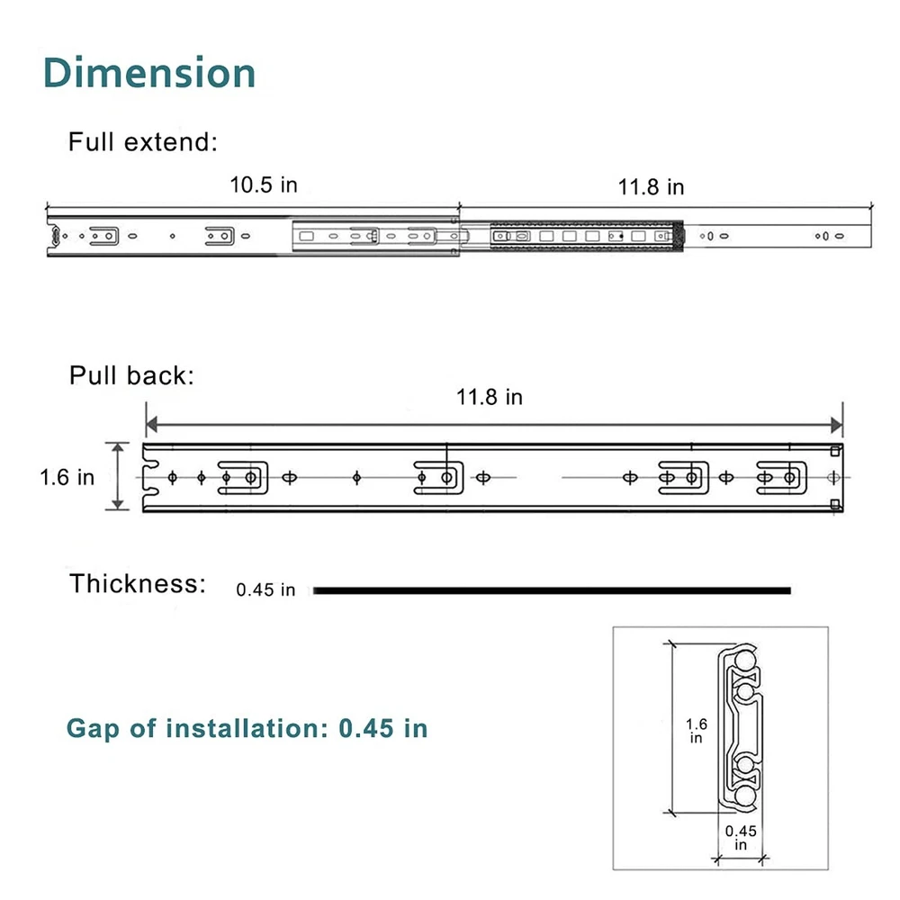 Full Extension Less Noise Drawer Slides 12 Inches, Drawer Slide Kit Fits Most Side-Mounted Drawer Systems,Full Extension Ball Bearing Heavy Duty 100 LB Product Details Size: A Brand: WhiteMyrtle MPN: Cabinet Furniture Drawer Slides 12 UPC: 746740026831 EAN: 0746740026831 Color: Black Material: Steel with Zinc Coating Brand: WhiteMyrtle Product Dimensions: 12"L x 0.5"W x 1.57"Th Finish Type: Steel Mounting Type: Side Mount Weight Limit: 100 Pounds Drawer Type: Side Mount Manufacturer: WhiteMyrtle UPC: 746740026831 Number of Items: 2 Part Number: Cabinet Furniture Drawer Slides 12 Item Weight: 1.06 pounds Product Dimensions: 12 x 1.7 x 0.5 inches Item model number: Cabinet Furniture Drawer Slides Size: A Finish: Steel Shape: Drawer Slide Maximum Weight Capacity: 100 Pounds Included Components: Includes 2 leaves Batteries Included?: No Batteries Required?: No Date First Available: July 26, 2021 Measurements:Length:12inch(300mm);Width:1.7inch(45mm);Thickness: 1/2inch(12.7mm); Load-bearing capacity: 100 LB. EASY INSTALLATION:Ensure the size of selected slides the depth of drawer;Reserve 1/2 inch of clearance for mounting on both sides;The two glides must be mounted in parallel,or will damage the glides;you can do it yourself! Mounting screws are INCLUDED. Full Extension & Ball Bearing Design: Mid-duty movable cabinet, desk drawer, ordinaty funiture, or any applications requiring 100lb load or less and requiring full extension. SPECIFICATIONS: 1 Pair of drawer slides, 12" folded slide length, made from high-grade cold rolled steel that is electrom zinc plated with black color, with load capacity of 100 lbs, mounting screws included. Full Extension & Ball Bearing Design 3-setions fold is convenient to fully open the drawer for easy access.Ball bearing design ensure drawer slides smoothly and silently. Double Anti-Rust Strength & Detachable Zinc Plating finish for anti-rust which is twice the traditional ordinary glides.Snap-on design makes the slides separate Easily,convenient to remove and install the glides.