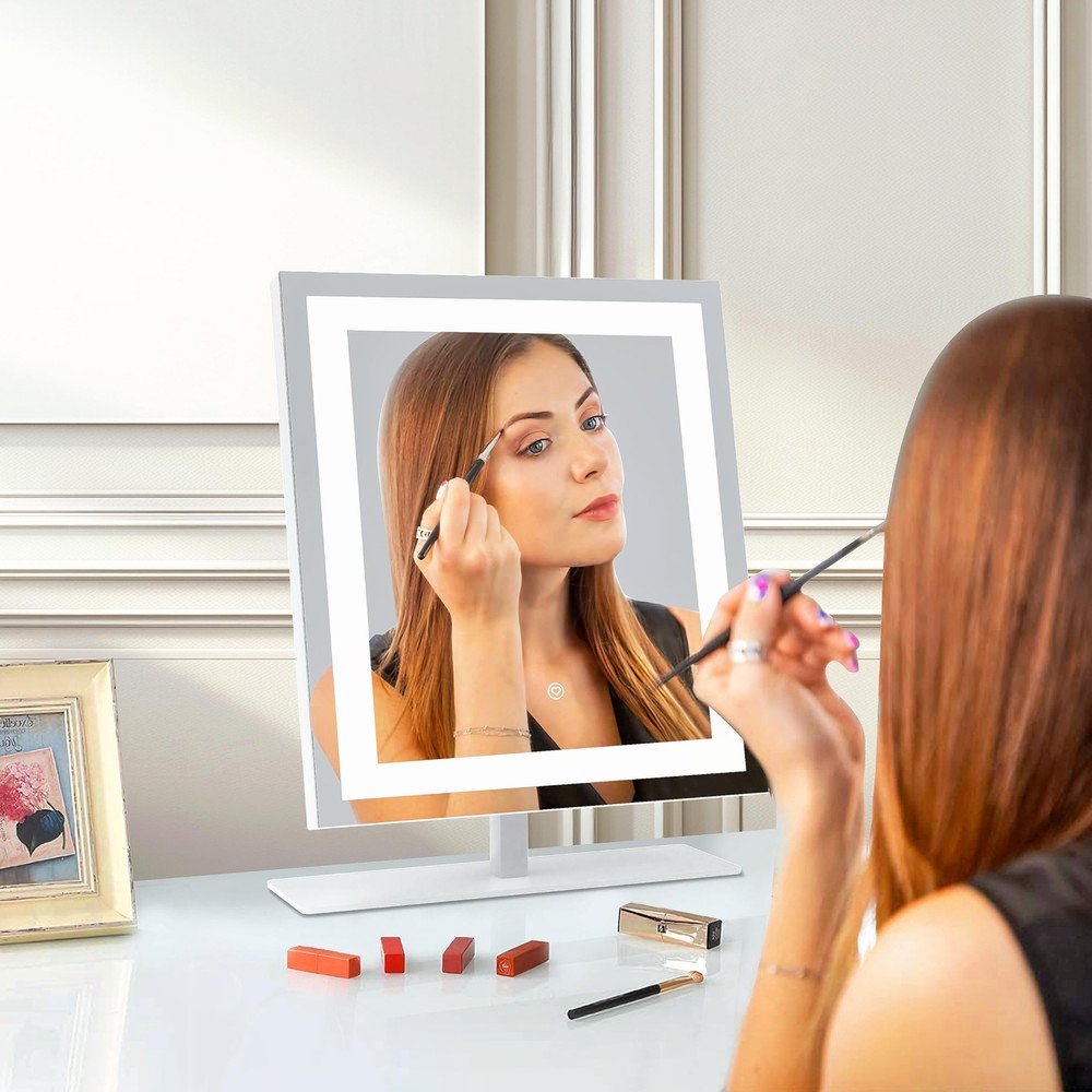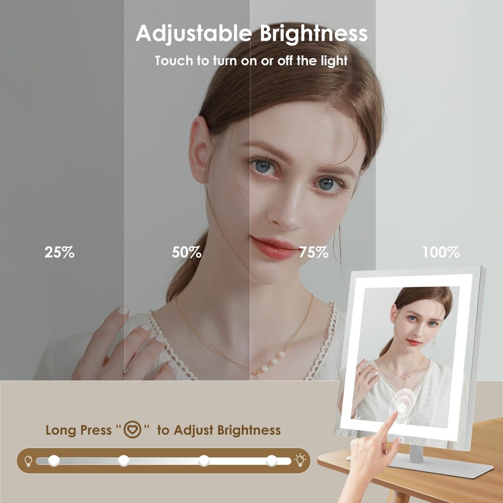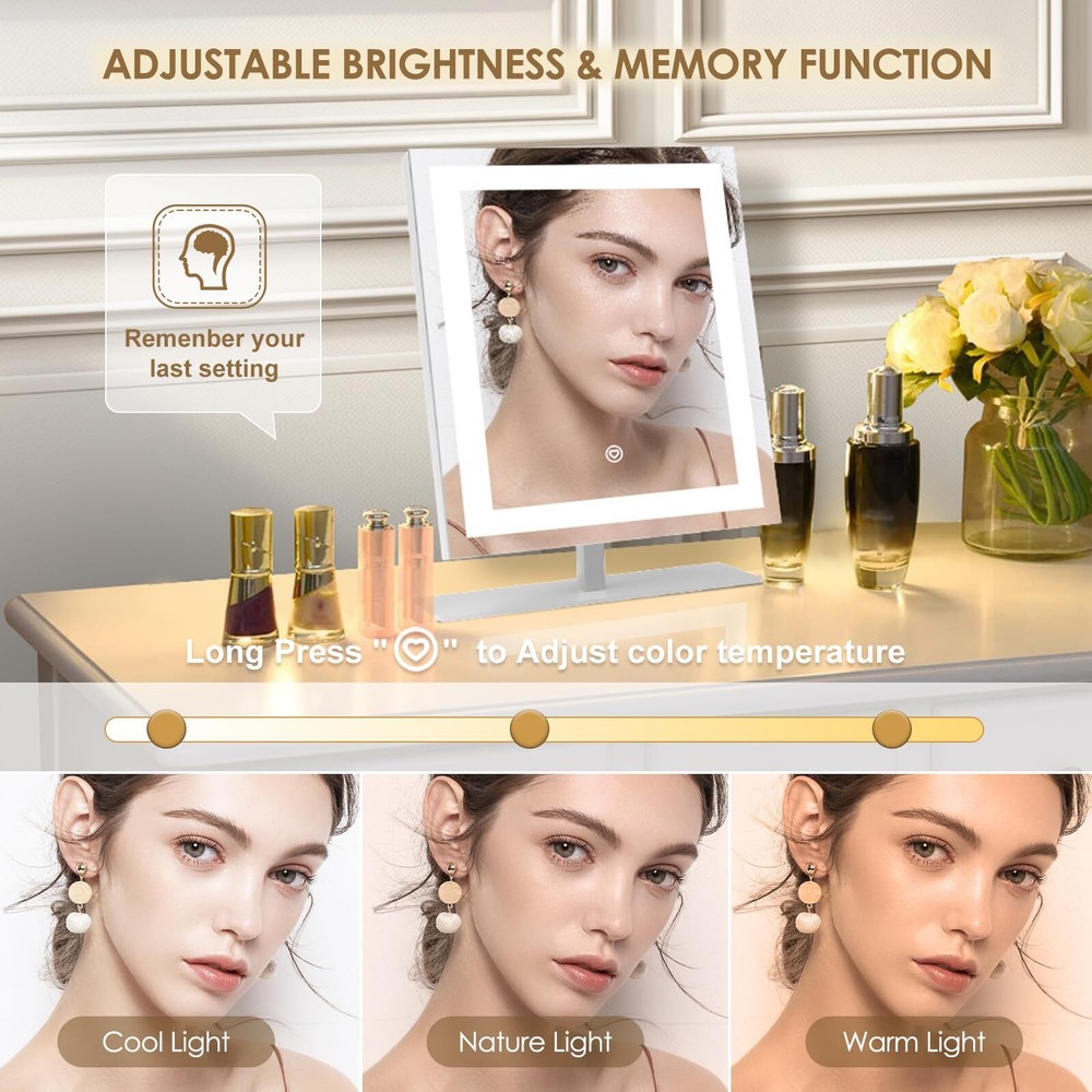 Smart Touch Control: With a simple touch, toggle through 3 colors temperature (Cold, Natural, Warm) and seamless dimming from 10% to 100% (Long press). Our lit-up vanity mirror ensures a true-to-life reflection, capturing every detail from your forehead to your chin. Sturdy Frame & Stand: Enjoy the robust stability of a metal frame and base, ready for daily wear and tear. Our cosmetic mirror boasts premium craftsmanship for enduring clarity, featuring an advanced HD silver coating that enhances visuals with gentle, luminous light. 120° Flexible Rotation: Rotate it smoothly through 120 degrees to find your ideal viewing angle. Accompanied by a versatile 5V DC cable compatible with any USB port, ensuring convenience without recharge hassles. Boasts 30% brighter illumination compared to typical battery-operated mirrors. Illuminate Your Routine: Compact yet generously proportioned, this mirror is a must-have in your luggage. It ensures you're always photo-ready, whether touching up after a long flight or prepping for an important meeting abroad. Stay confidently glamorous no matter where your journey takes you. Versatile Vanity Mirrors: Elevate spaces with this chic mirror to dressers or desks. Ideal for commemorating special days like birthdays, Valentine’s Day, Mother’s Day, and Christmas. As essentials for girls, it imbues her daily life with a sense of sophistication and a touch of self-care indulgence.