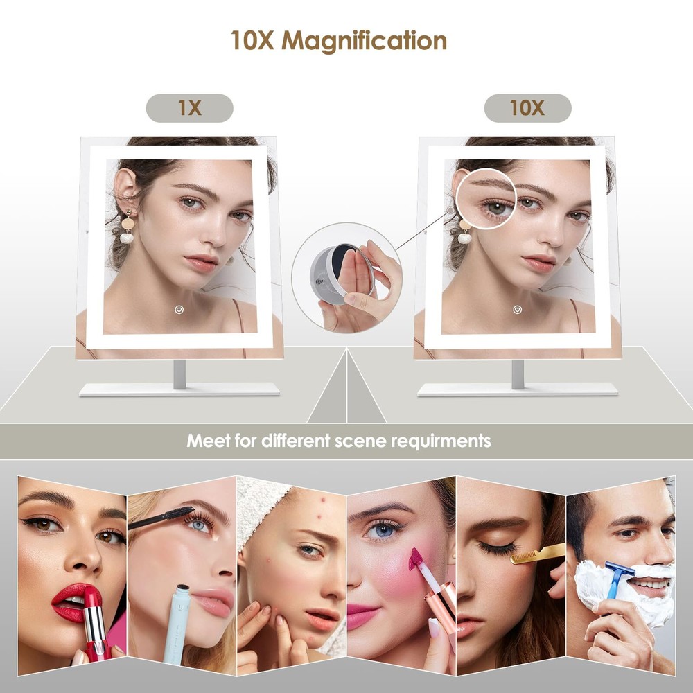 This makeup mirror is a game-changer! The smart touch controls make it super easy to adjust brightness and color temps for flawless makeup anytime. The 10X magnification is crystal clear, and the sturdy metal stand keeps it stable. Love how it lights up my entire face perfectly—no more leaning in close or weird shadows. The sleek Hollywood-style design adds a luxe vanity vibe, and the HD silver coating gives the truest reflection. Perfect for daily glam or skincare routines!