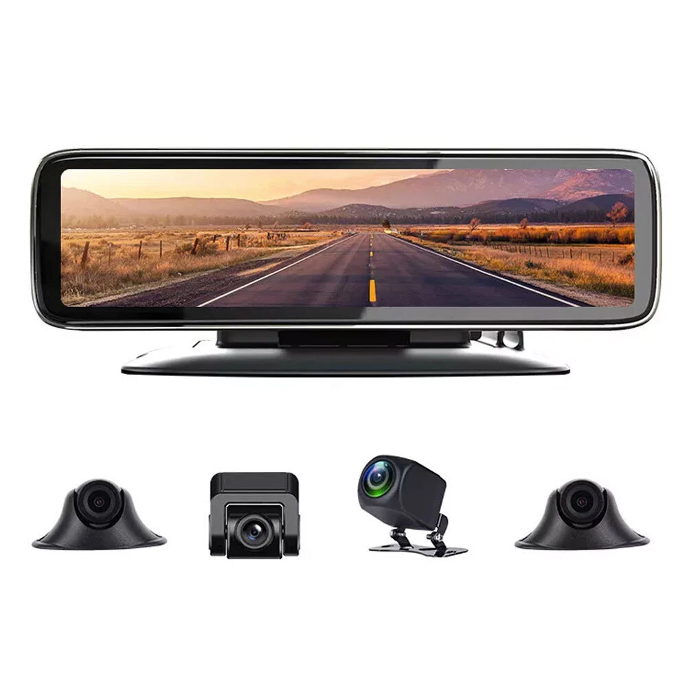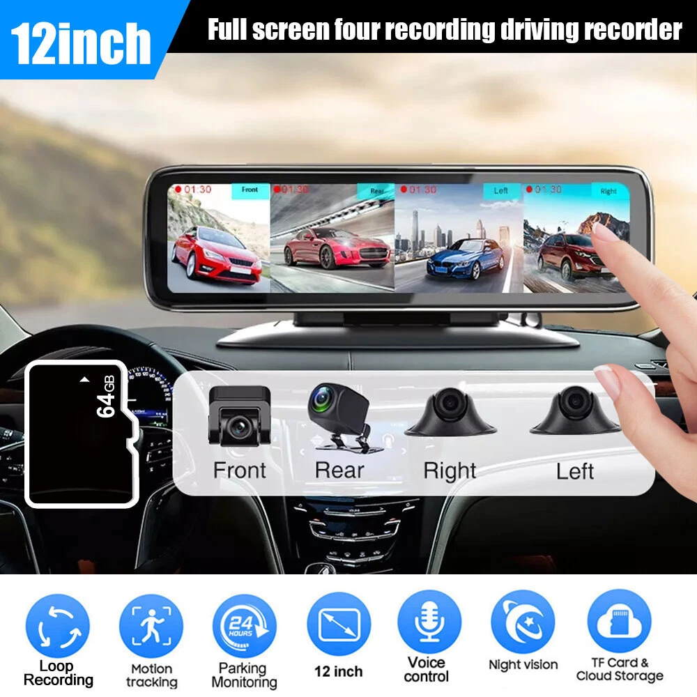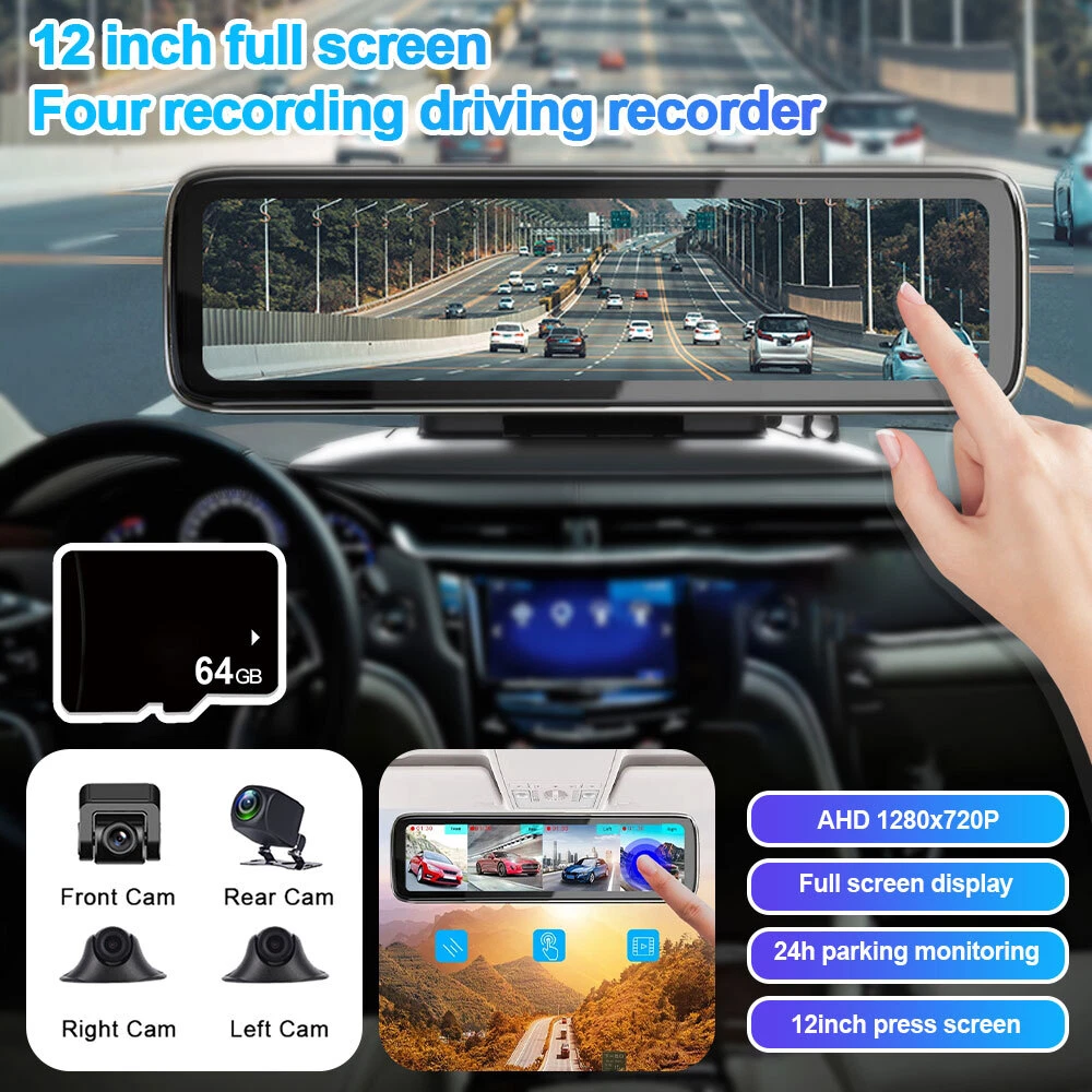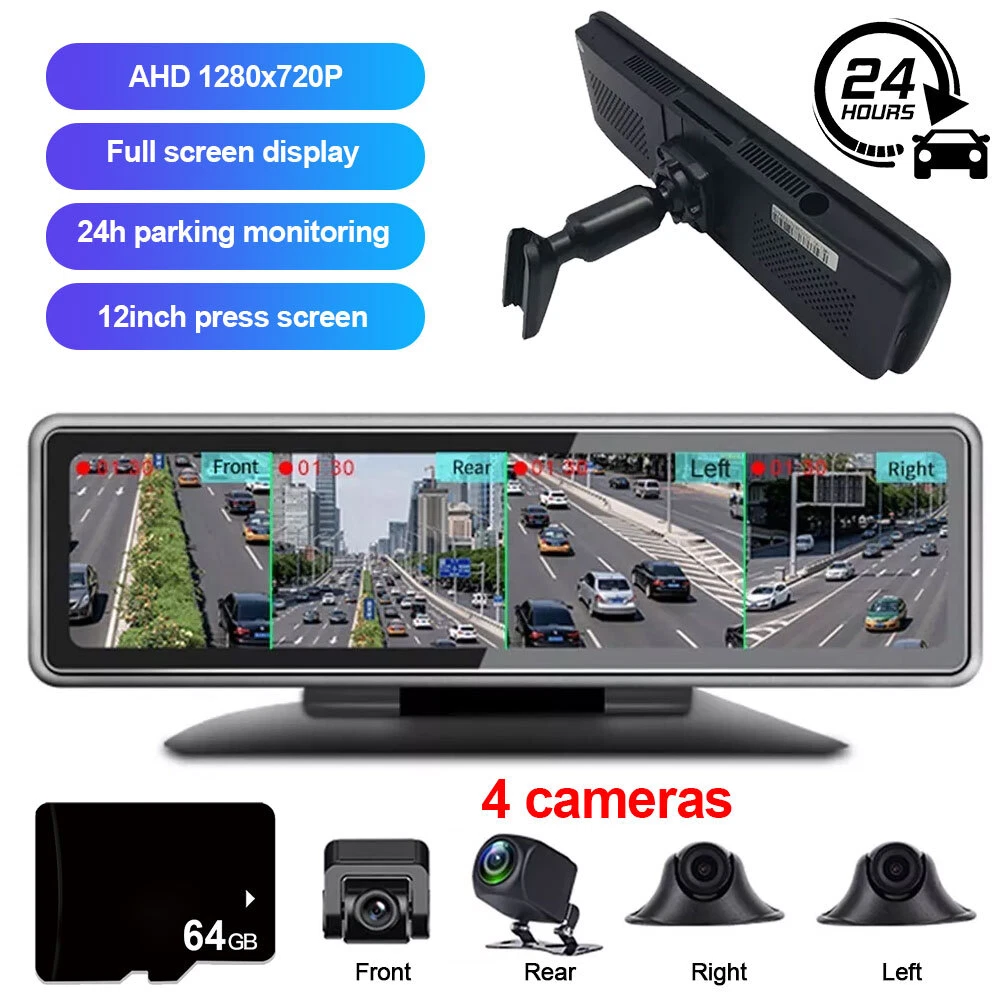 12in Touch Screen 4 Cameras Dash Cam 360° Panoramic Monitoring Recorder w/ 64GB
