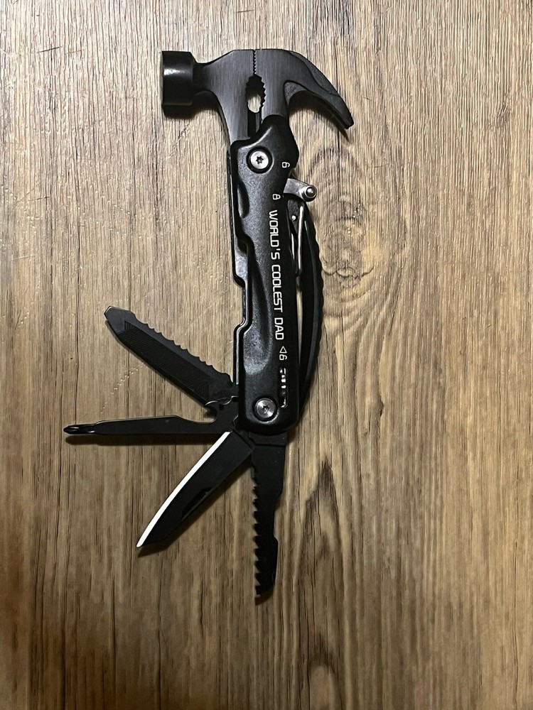 This tool has never been used, it is in like new condition. This 12-in-1 multitool hammer is the perfect gift for your dad. Made of high-quality stainless steel, it is durable and reliable. The tool set includes a plier, hammer, wire cutter, knife, screwdriver, saw, protective cap, and phillips screwdriver. It is compact and easy to carry, making it an ideal choice for camping and hiking trips. The BEST DAD EVER multitool is designed with a stylish black color and a phillips drive system. It weighs only 10 ounces and has a package dimension of 6.3 x 3.19 x 1.42 inches. This multitool is manufactured in China and does not require batteries. It is a must-have tool for any dad who loves outdoor activities.