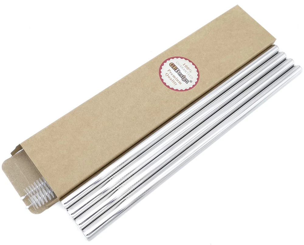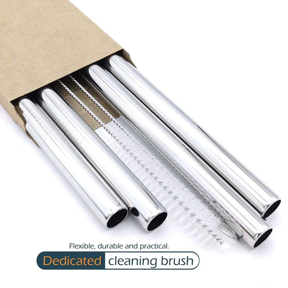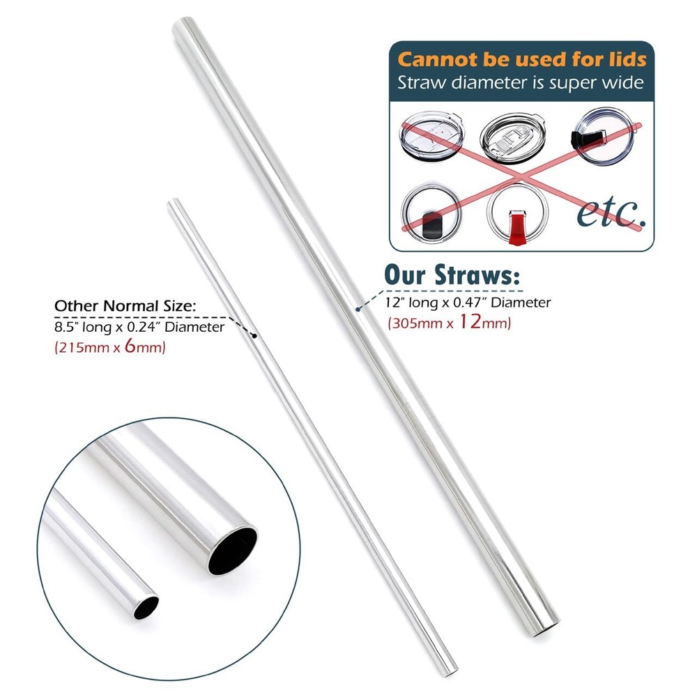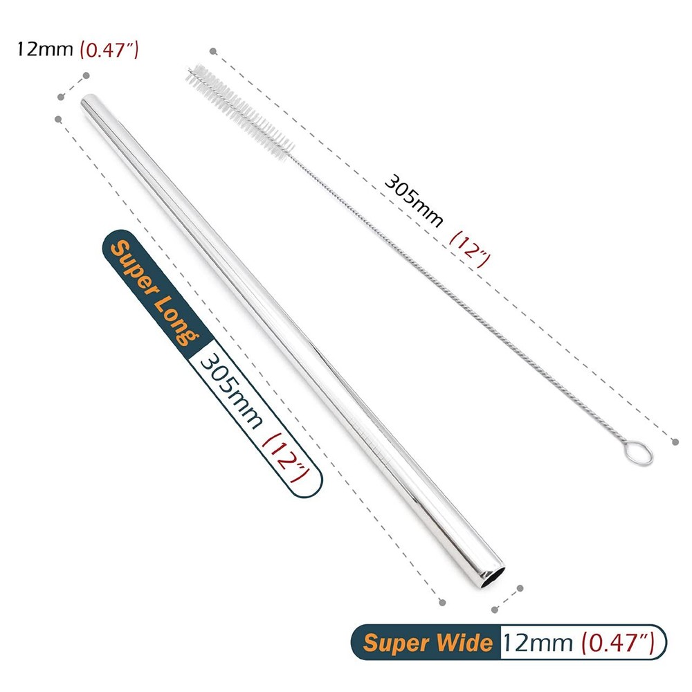 Product Properties: Product Name: Stainless Steel Straws Set Material: SUS 304 Food-Grade 18/8 Stainless Steel Size: 12 x 1/2 inches / 305 x 12 mm Color: Silver Package Included: 4 x Stainless Steel Straws 2 x Cleaning Brushes SUPER EXTRA SIZE - These are the WIDEST Stainless Steel Straws on the market! we've created a beautiful addition to BOBA tea and any thick drink! Enjoy your bubble tea, milkshakes and smoothies on a hot summers day effortlessly! The stainless steel retains the temperature of your cold drink and helps keep it from melting down faster. These stainless steel straws even have the tensile strength to be pushed right into an orange so you can enjoy juice directly from the source! Our straws are free from toxins like Bisphenol A (BPA) found in plastic straws, made of SUS304 Food-Grade 18/8 Stainless Steel, reusable and durable Eco-Friendly design. Dishwasher safe, easy to clean. The straws come with a cleaning brush for fast, effective and hygiene manual cleaning. Best of all, the brush itself is great for cleaning sippy cups, sports bottles, and thermos straws! Clean them with warm soapy water after you receive straws, then you won't feel any smell of steel when you enjoy your juice,or other drinks. Package: 4 x Straws + 2 x Cleaning Brushes.