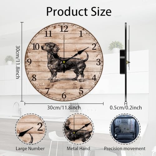 Return Policy Fast Delivery Trusted seller 12inch Sausage Dog Wall Clock Vintage Style Pattern Battery Operated Silent Non Ticking Round Decorative Clock for Office Home Kitchen Decor Product Description Sausage Dog Design: The wall clock is designed with animal elements, incorporating puppies and wooden cracks into your home décor, the perfect colour combination to bring your living room and bedroom to life Silent and Non-ticking: Fiber wood wall clocks do not produce obvious ticking sound when running, can create a peaceful environment for people, suitable for placing in the bedroom, study and other places that need to be quiet Fiber Wood Material: The wall clock is made of fiber wood material. It has a sturdy structure and can be used for a long time with proper maintenance. Which is lightweight and won't damage the wall. The product size is 12 inch/30cm Wide Applications: Fiber wood wall clocks are ideal for college dormitories, kitchens, offices, conference rooms, living rooms, bedrooms, or any space that creates a natural and comfortable living atmosp Exquisite Gift: The battery operated wall clock is best gift choice for, housewarming, anniversaries, Mother's Day, Father's Day, Easter and other festivals. (Powered by one AA battery, battery is not included in the package) Shipping Returns Payment Shipping Shipping is FREE to all addresses other than APO/PO boxes in the lower 48 states. All our stock ships from US-based warehouses. Shipped via USPS or UPS (depending on location and package weight) Unless stated otherwise, all orders will ship within 24-72 hours of your payment being processed. Check our feedback to see the great reviews of FAST shipping we offer. Returns Seller does not accept returns Payment We currently accept payment via eBay managed payments only. Once payment is cleared, we will dispatch your shipment within 1-3 business days. Please refer to the "Shipping" tab for more information regarding shipping speed to your destination.