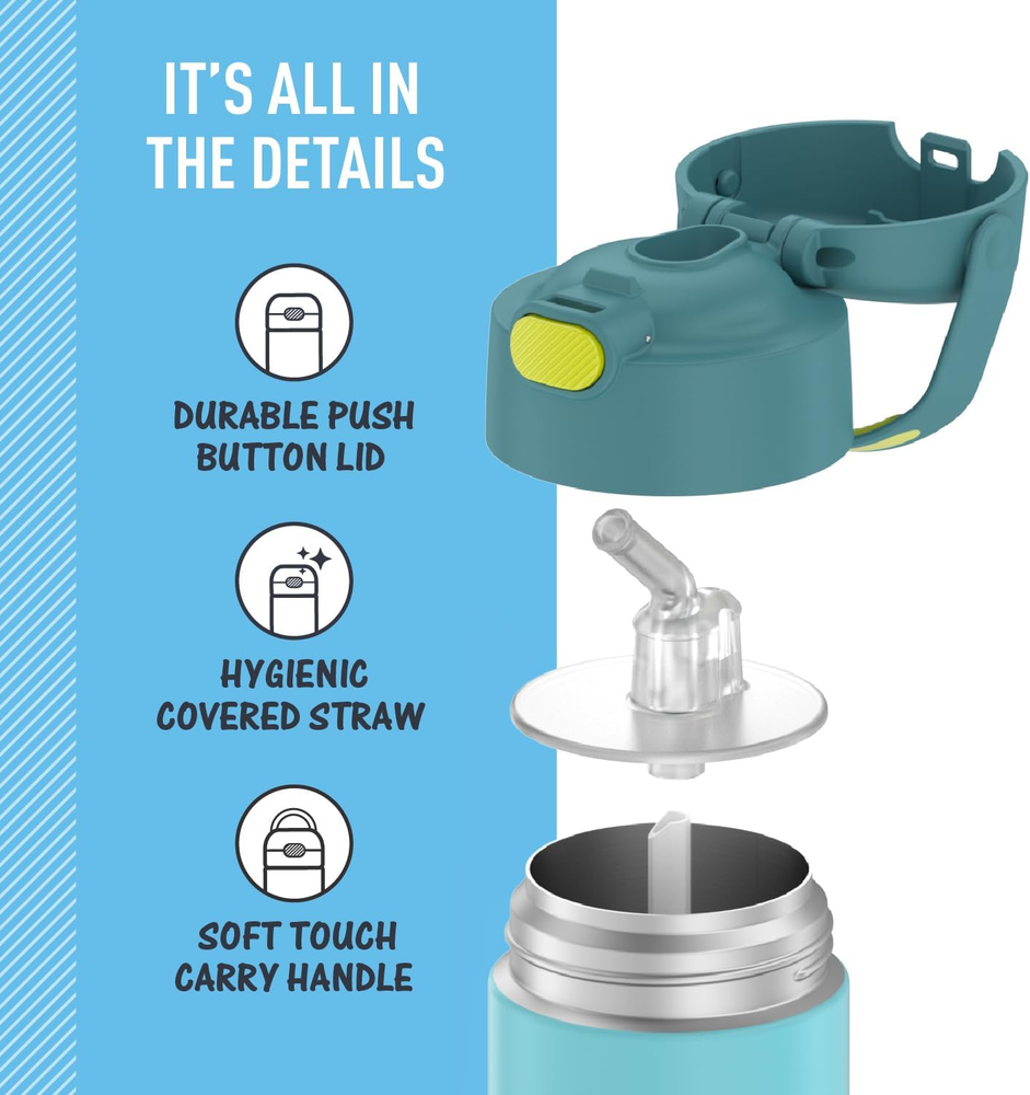 Stays cold: THERMOS vacuum insulation technology keeps drinks cold for up to 12 hours. Our stainless steel water bottles are built so their drinks are as cool on the inside as they look on the outside. Not for hot liquids Kid-friendly design: This reusable metal water bottle is lightweight and compact with a push button lid so it’s easy to carry and open. The integrated carry handle features a soft touch grip Daily durability: Perfect kids water bottle for school and daily use. Made with high-quality 18/8 stainless steel construction to handle drops, dings and provide everyday durability and reliability. Comes in a variety of fun colors and patterns Easy care and cleaning: Help keep germs away with a hygienically covered pop-up straw that’s also removable for easy cleaning. This kids water bottle is dishwasher safe, though washing by hand is recommended Protect what you love: With 120 years of heritage, Thermos Brand food and beverage containers keep things fresh, sealed and protected. Trusted since 1904 because our products help make everyday life a little better, every time The FUNtainer® 12oz Vacuum Insulated Stainless Steel Water Bottle with Straw keeps drinks cold for up to 12 hours. Our kids water bottles are built so their drinks are as cool on the inside as they look on the outside. Kids stay hydrated and parents stay happy. The double wall stainless steel construction is built to handle drops, dings and assorted roughhousing. Includes an integrated carry handle with soft-touch grip, making it easy for kids to carry with them throughout the day. Help keep germs away with the hygienically covered silicone straw which is removable for easy cleaning. To clean, you can pop your FUNtainer water bottle in the dishwasher; however hand washing is recommended. Not for use with hot liquids.