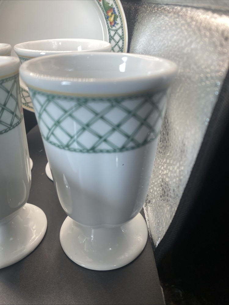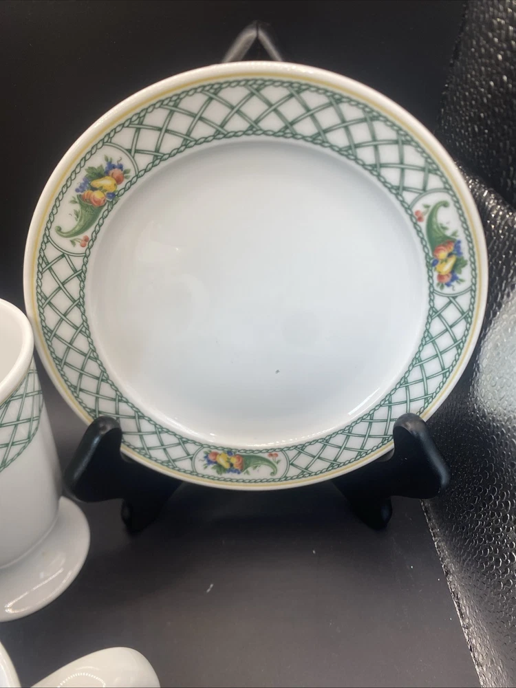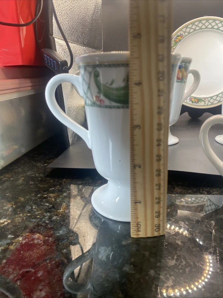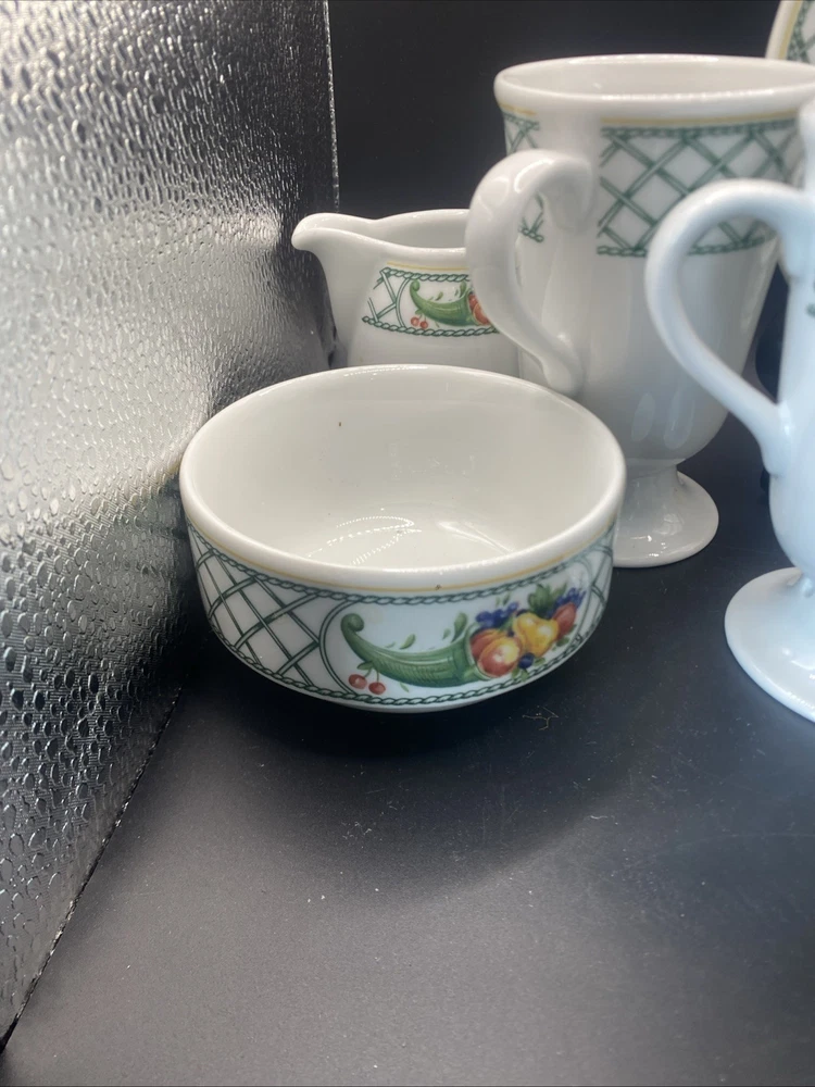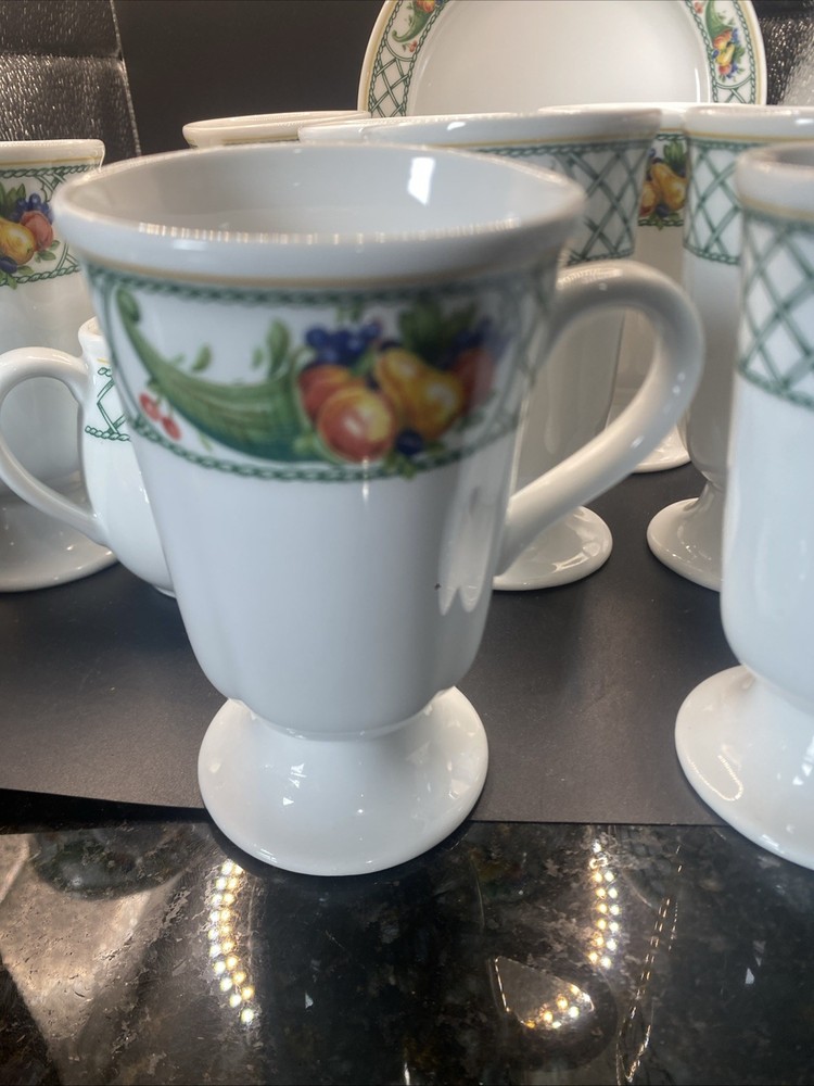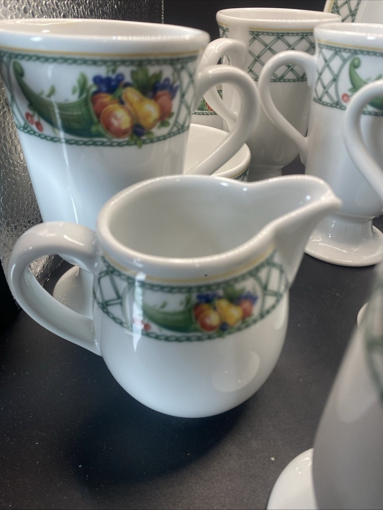 This 12-piece set of Cornucopia-themed mugs, creamer and sugar bowl with plate is perfect for all occasions. The set includes 8 footed mugs, each with a capacity of tea, coffee or hot cocoa. The mugs are made of pottery and have a contemporary style with an oblong vertical design. The set is decorated with the Cornucopia character and fruit from Germany, making it a great addition to any kitchen. The set is from Bavaria, Germany and is ideal for teens, adults and kids. The mugs have a height of 4.75 inches and are great for serving hot beverages. This set is perfect for those who love to entertain and want to add a touch of elegance to their table.