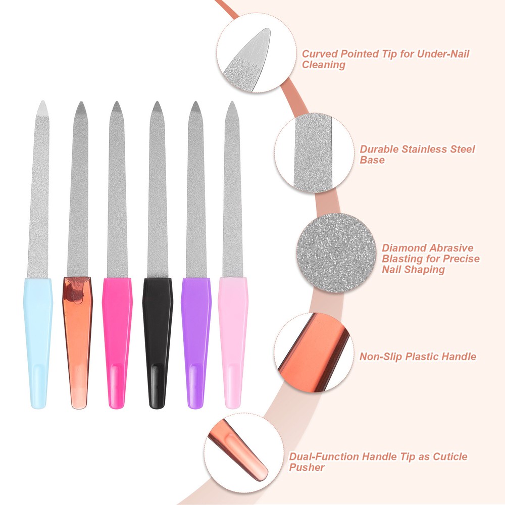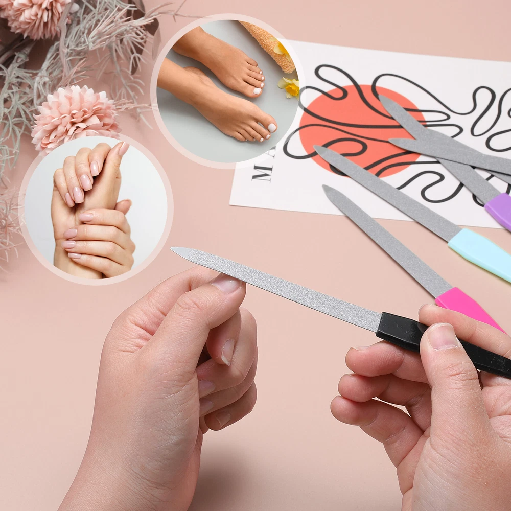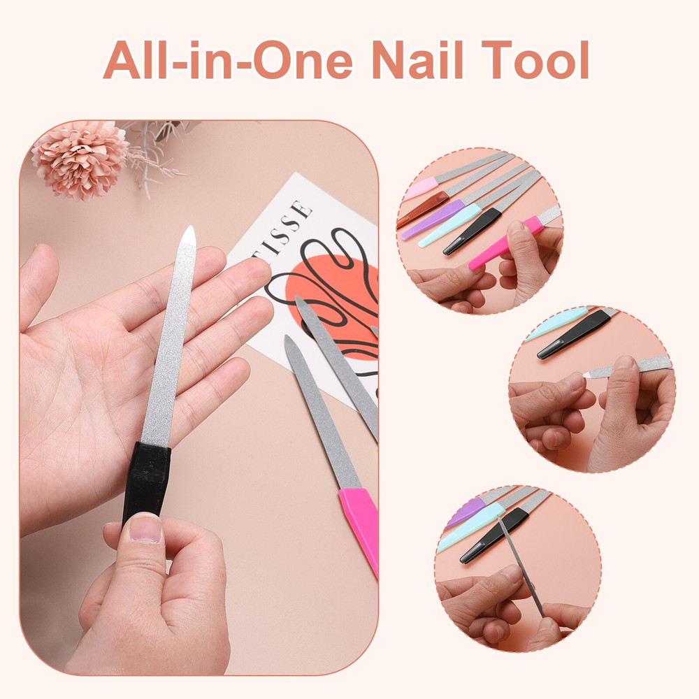 12pcs 180 Grit Metal Nail Files, Double Sided Fingernail File with Handle Our metal fingernail files are crafted from quality stainless steel, which not only enhances their longevity but also provides superior resistance to corrosion and rust, making them good for daily nail care. Additionally, they are easy to clean and maintain, ensuring a safe and effective grooming experience. The durable diamond abrasive blasting is firmly bonded to the blade, preventing the particles from dislodging and providing durability. The non-slip plastic handle is crafted for a comfortable grip and ease of use, while the precision-tipped nail file effectively removes dirt from under the nails. The fine grit surface of the nail file is designed to effortlessly shape and smooth your natural nails, providing a gentle yet effective grooming experience. Our dual-grit stainless steel diamond nail files are practical, great for shaping and smoothing natural nails, as well as acrylic and false nails. They have a wide range of needs, from professional salon use to at-home manicures, suitable for both men and women. Additionally, these nail files make an excellent gift choice for anyone, whether it's for women, men, providing a thoughtful present for any occasion. Use gentle, even pressure when filing your nails to avoid damaging the nail bed. Over-filing can lead to thin, weak nails.