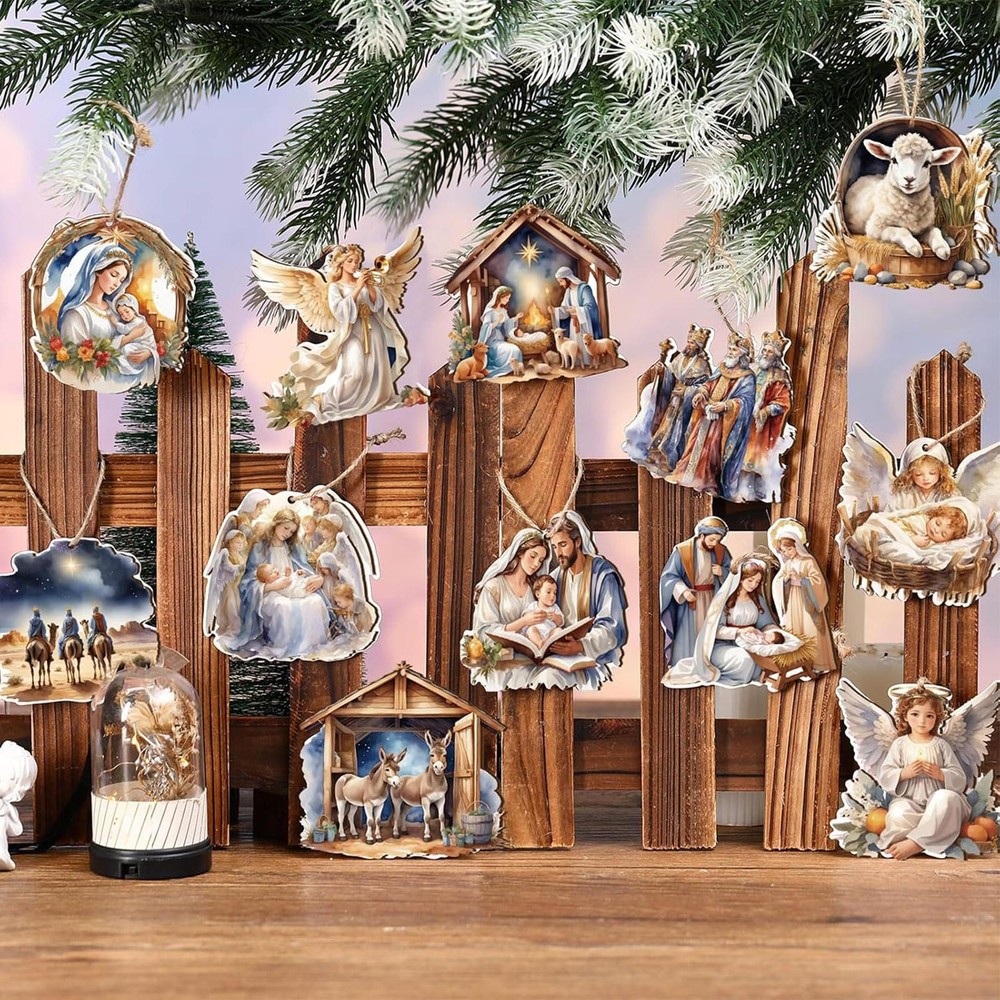 12pcs Hand-Carved Wood Nativity Ornaments for Christmas Tree
