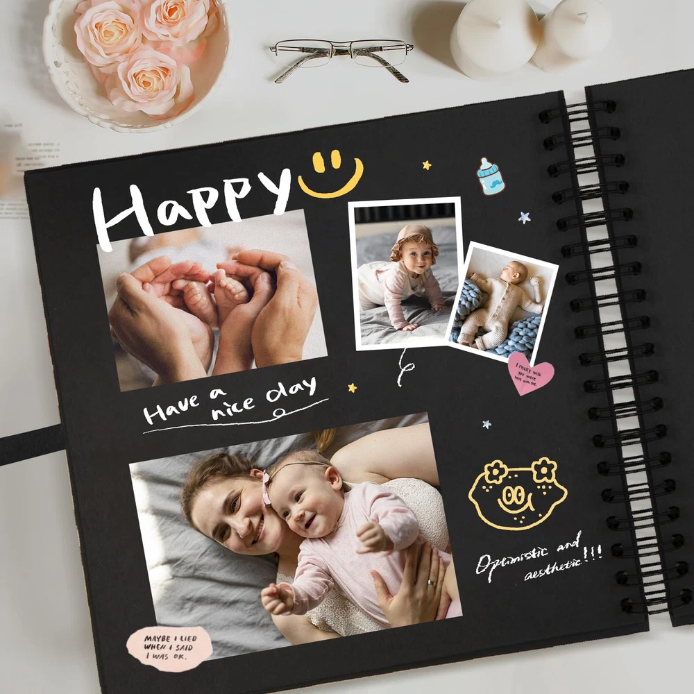 Dimensions: 12x12 inches scrapbook album, 40 sheets 80 pages Great design: 360 degree sheet rotation of spiral bound, convenient for opening and closing, more elegant in whole appearance DIY scrapbook: you can replace the hardcover photo with any picture you want. It will be a ideal photo album for keeping your moments Exquisite workmanship: with hardcovers and thick black paper, not easy to fold, fine material and exquisite details, sturdy inside pages in elegant black Multifunctional use: for family baby wedding birthday travel record and anniversary scrapbook, A memory book of our own adventures or any other special occasions