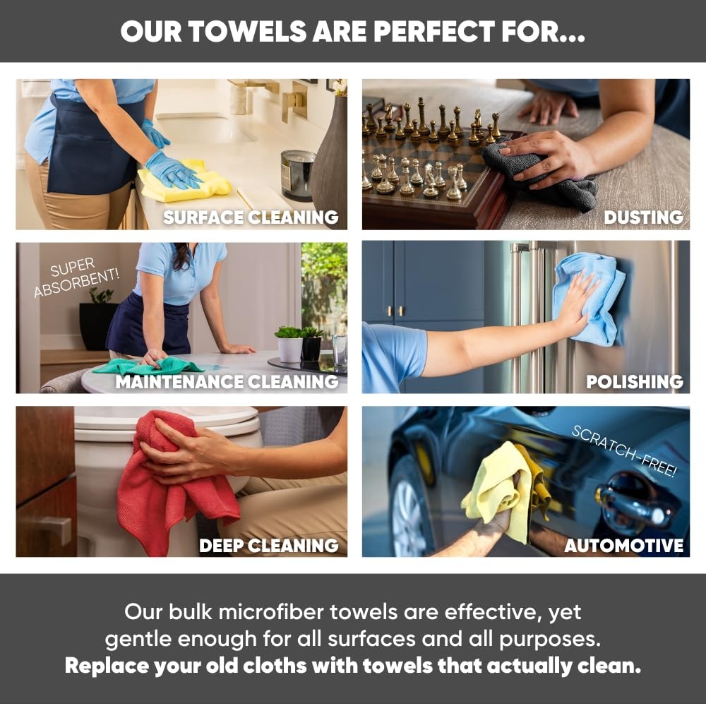 Our 12” x 12” All Purpose Microfiber Towels are versatile and reliable cleaning agents. They effectively clean anything, all the while being easy to wash, and use again at peak performance. Our towels were made to last. With a secure stitched exterior & plush & dense microfiber designs, our microfiber is the most durable all-purpose towel in its class. We ensure it will not fray in the wash, have its corners round, or tear when using. When cared for properly, our microfiber towels are made to last hundreds of washes. MICROFIBER MAGIC — Manufactured with high-quality microfiber to act like a magnet on dust and dirt. Clean surfaces quickly and efficiently without leaving streaks or scratches behind. MULTIPURPOSE USE — Effectively picks up difficult spills and substances, such as oil & grease. Works on almost any type of surface, from light to heavy-duty cleaning! COLOR-CODED CLEANING — Available in several colors so you can confidently color-code your cleaning routine. Use different colored towels for different surfaces in your or your client's home. GREEN CLEANING — Cleans with just water. A greener way to clean that saves you from spending extra on cleaners. DURABLE CONSTRUCTION — Made with firmly stitched edges and proven to last hundreds of machine washings. Save money on replacement towels! Loved by cleaning pros, so we know you’ll love them too. Order Today.