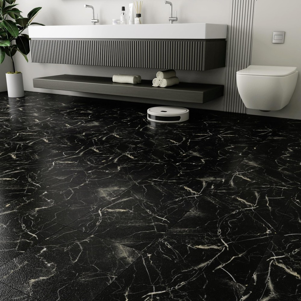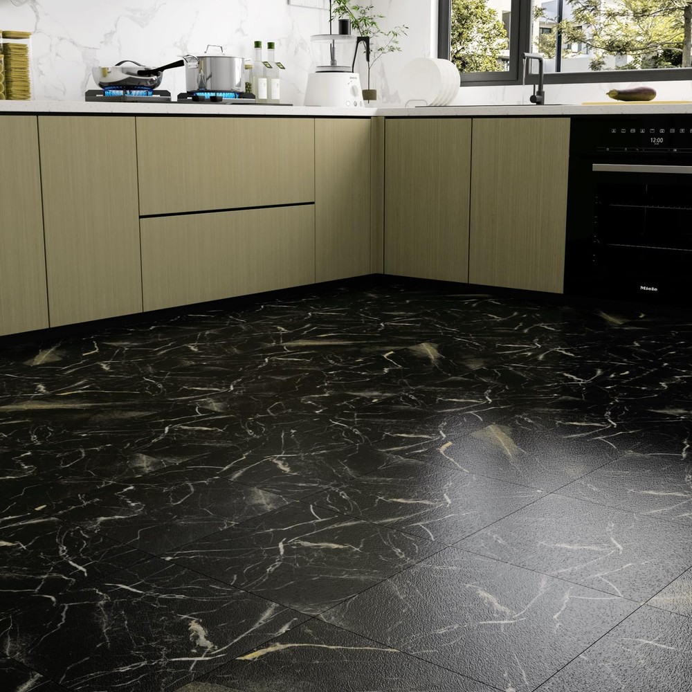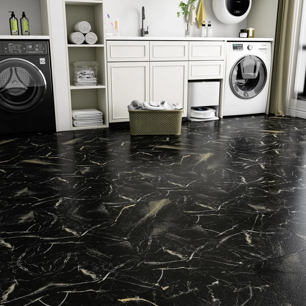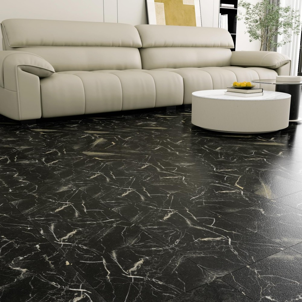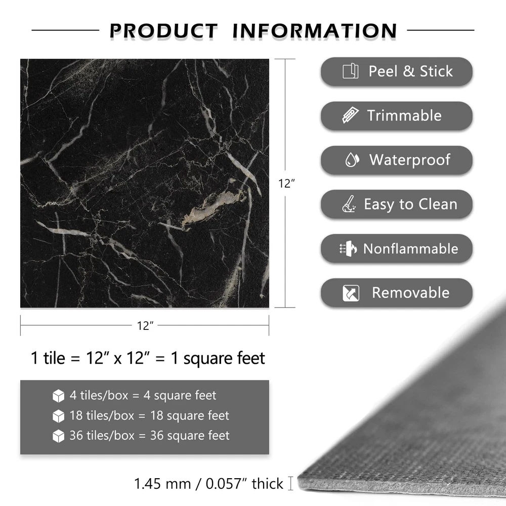[SIZE] Length: 12 inch; Width: 12 inch [THICKNESS] 0.057 inch [MATERIAL] Vinyl Floor Tiles [COLOR] Black Gold Peel and Stick Floor Tile [STYLE] Marble Peel and Stick Floor Tile [DESIGN CONCEPT] Natural marble look brings timeless charming for your floor! [ADVANTAGES] 1. Marble Peel and Stick Floor Tile Waterproof: peel and stick floor tile, self adhesive floor tiles, no extra glue needed. 2. Marble Peel and Stick Floor Tile Waterproof: removable floor tiles without sticky residue, great temporary flooring for renters. 3. Marble Peel and Stick Floor Tile Waterproof: 12 x 12 peel and stick floor tile, vinyl floor tiles, vinyl laminate flooring, linoleum flooring. 4. Marble Peel and Stick Floor Tile Waterproof: Waterproof flooring, stain resistant, moisture-proof, anti-slip, easy to clean. 5. Marble Peel and Stick Floor Tile Waterproof: This peel and stick tile floor can be used as bathroom floor tile, shower floor tile, kitchen floor tile, it also can stick on bedroom floor tiles, living room floor tiles, this sticky floor tiles are suitable for dinning room, laundry, nursery, dollhouse, playroom, cubicle, farmhouse, garage, basement, attic, kitchenette, gym, dorm, classroom, apartment, office and rv flooring. [PRO TIPS] 1. Measure the size of the floor surface before purchase, buy enough rolls at one time to avoid color difference. 2. Clean the surface before pasting. The adhesion will be the best if the surface is clean, smooth, dry and flat. 3. We recommend to avoid leaving too much water on the floor tiles while cleaning within two days after installation, which helps to maintain great adhesion for a long time. ➤ SIZE & MATERIAL: Each marble floor tile measures 12"x12" and 0.057" thick. 4 tiles per box, totally can cover 4 square feet. The sticky floor tiles are made of superior vinyl, wear resistant and nonflammable, safe for your family. ➤ EASY TO INSTALL: Self adhesive vinyl floor tiles, just peel and stick floor tiles to your room, readjust if you need, cut with utility knife or scissors to fit small space, no grout or special tools needed. ➤ EASY TO CLEAN: This black marble peel and stick floor tile is waterproof and washable, oil proof and stain resistant, easy to clean with a wet mop. ➤ REMOVABLE: Just remove the vinyl flooring tiles if you want. It's perfect removable floor tiles and temporary flooring for renters! ➤ MULTI-USE: Stick on floor tiles to any dry, clean and flat floor, such as for bathroom flooring, kitchen flooring, rv flooring, bedroom, living room, laundry room, dining room, basement, entryway, foyers, gym, garage, office, apartment, classroom, etc. ➤ 24/7 SERVICES: Any questions about peel and stick floor tiles, please feel free to contact us or "Ask a Question". Get the black marble tiles for floor, and start to enjoy your DIY time!