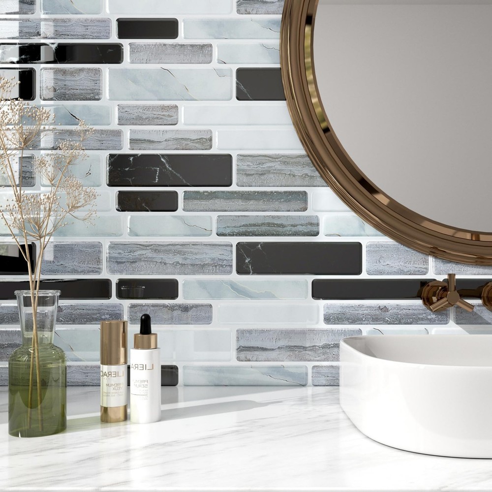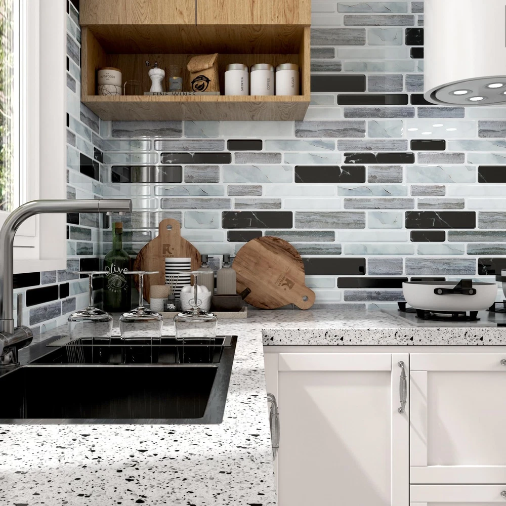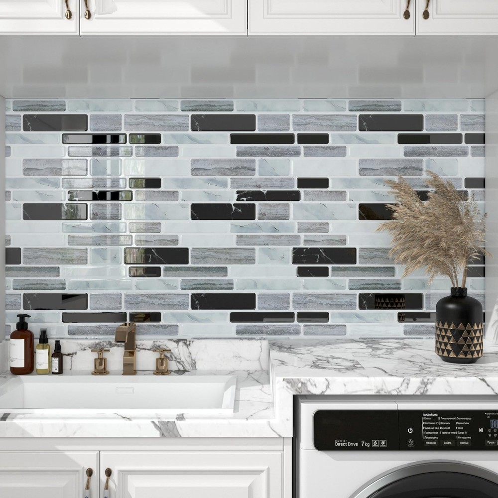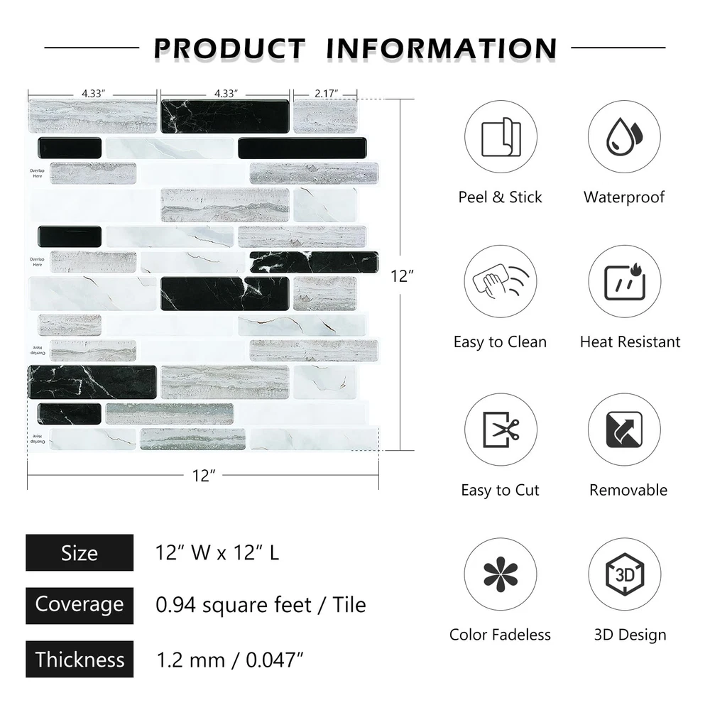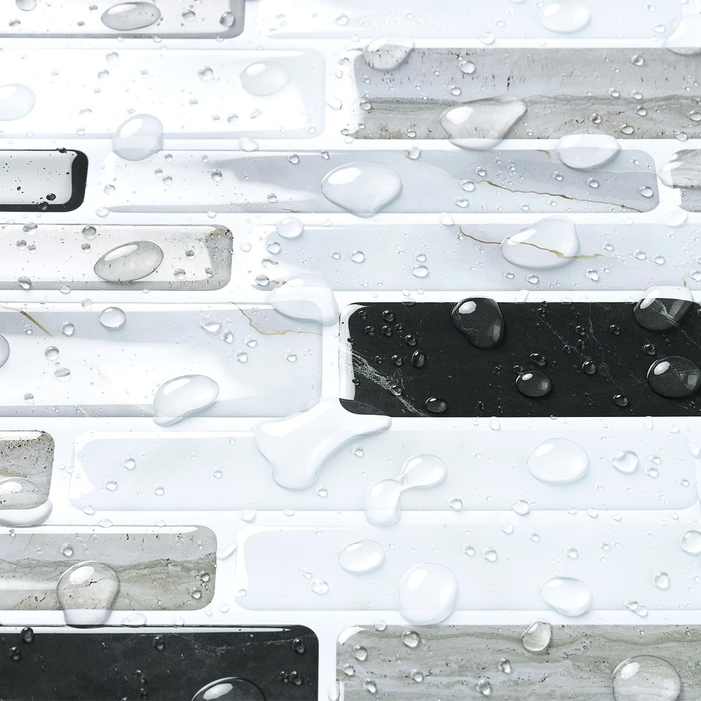 [SIZE] Length: 12 inch; Width: 12 inch [MATERIAL] Peel and stick vinyl backsplash [COLOR] White grey black peel and stick backsplash [STYLE] Marble peel and stick backsplash [ADVANTAGES] 1. Peel and Stick Backsplash: The kitchen backsplash tiles peel and stick is easy to apply, no extra glue needed. The kitchen backsplash peel and stick is easy to cut, no special tools needed. 2. Peel and Stick Backsplash: The kitchen tiles peel and stick backsplash is removable and renter friendly. 3. Peel and Stick Backsplash: The kitchen peel and stick backsplash is waterproof, oil proof, moist resistant, heat resistant and stain resistant, easy to clean with a damp cloth. 4. Peel and Stick Backsplash: The bathroom backsplash tiles peel and stick is peel and stick vinyl backsplash, peel and stick pvc backsplash. 5. Peel and Stick Backsplash: Peel and stick backsplash for kitchen, peel and stick backsplash for bathroom, peel and stick tile for shower walls, removable backsplash for renters, heat resistant backsplash for stove, peel and stick wall tiles for laundry room, peel and stick wall tiles for rv, tile stickers for fireplace, farmhouse peel and stick backsplash tile. [PRO TIPS] 1.Measure the wall size, buy enough stick and peel backsplash tiles at a time to avoid color difference due to different batches. 2.Make sure your wall is completely DRY and CLEAN before applying. 3.For latex or repainted walls, 3M Spray Adhesive is recommended. 4.Make sure all peel and stick wall tiles are pressed firmly, and try NOT to touch the adhesive side as much as you can. 5.backsplash tile peel and stick can be used for any smooth surfaces, such as ceramic tile, glass, acrylic, mirror, metal and painted gypsum surfaces. Other rough surfaces are not suitable, such as oily wall, brick and stone wall, stucco wall, concrete wall and orange peel wall. 6.Please consider 10% cutting loss for irregular designed tiles. ➤ SIZE & MATERIAL: Each marble look backsplash peel and stick tile measures 12"x12" and 1.2 mm/0.047" thick. 18 tiles per box, totally can cover 16.92 square feet. Our black white peel and stick backsplash is made of durable eco-friendly vinyl, 3d white gray black marble look, will not crack or fade over time. ➤ EASY TO INSTALL: Self adhesive backsplash tiles with strong adhesive, just peel and stick, no special tools and no experience needed, no grout, no glue, no mess! Fast and cost-effective way for backsplash update! ➤ EASY TO CLEAN: Waterproof, oil proof, moisture-proof, stain and heat resistant, easy to clean by a wet cloth. This marble backsplash peel and stick is perfect peel and stick backsplash for kitchen and bathroom. ➤ REMOVABLE: Our kitchen stick on backsplash tile is removable so that you can change another style without worries. Use a hairdryer to warm up the adhesive, then peel the tile softly from corners. It's renter friendly backsplash tiles! ➤ MULTI-USE: Stick on backsplash tiles for kitchen island walls, kitchen backsplash, bathroom backsplash, shower wall tiles, laundry back splash, sink backsplashes, bedroom and living room walls, RV, fireplace, behind the stove, and any other smooth and clean surfaces. ➤ 24/7 SERVICES: Any questions about peel and stick wall tiles, please feel free to contact us or "Ask a Question". Please purchase enough tiles at a time to avoid slight color difference from different batches. Get this thick self adhesive backsplash tiles now, and start to enjoy your DIY time!