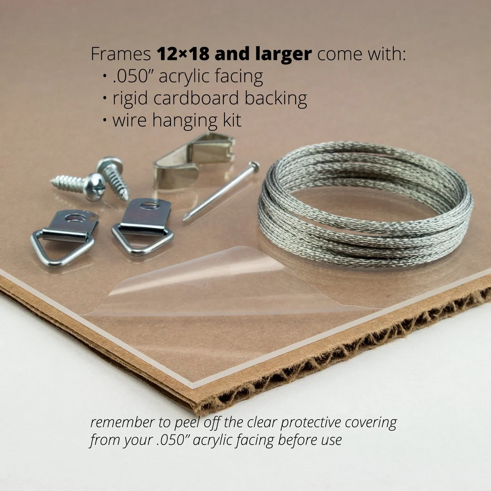 Ornate style, decorative gold facing, darker gold sidewall with beading and wood finish Frame includes: clear styrene facing, rigid cardboard backing and wire hanging hardware kit (some assembly required) Fits a 12x18 Photo/Print/Poster (Viewable area is slightly smaller) Frame molding is 0.75 Inch wide, Real poplar, Solid wood Frame measures 12 Inch by 18 Inch