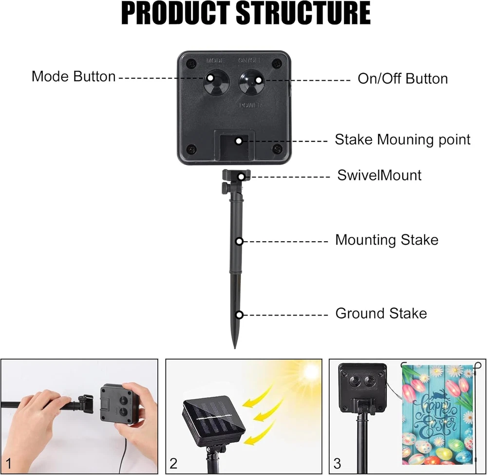 Store New Arrivals Add to Favorite View Feedback Contact Fast deliveries to the customer's home Quality customer service John Make the customers happy! Lighted Happy Easter Garden Flag 12×18 Inch, Solar LED Eater Eggs Yard Flag Double Sided,Small Spring Seasonal Garden Flag, Yard Outdoor Lawn Farmhouse Decoration Description [Light-up Garden Flag]: This Easter egg garden flag is equipped with lights and solar panel. The light automatically turns on at dusk, and off to charge during the daytime as long as the solar panel is exposed to the sunlight. (Note: the flagpole not included.) [8 lighting Modes]: You can choose from 8 different lighting modes to enhance the festive ambience, making your yard colorful during Easter festival. [Premium Fabric]: Made of durable 100% fade-resistant thick linen fabric. This Easter garden flag with lights features a 2-layer design, double-sided with pattern image viewable from both sides.Holds up well in any weather ,and still keep colorful and durable [Adorable Seasonal Decoration ]: Suit for decorate your garden, yard, balcony and patio area.Make you and neighbors happy just looking at this cute eggs garden flag in Easter and Spring season. [Customer Services];We stand behind our products and believe you will love this special Easter garden flag. For any reason you are not satisfied, just contact us. Product Description JUSHEN Solar Lighted Happy Easter Eggs Garden Flag Transform your outdoor space into a festive haven of Easter joy with our charming blinking flag for the yard Unique Features Auto On/Off Easter eggs garden flag automatically turns on at dusk and off at dawn when the button on the solar panel is in the ON position. Energy-Saving The solar panel can charge automatically as long as gains sunlight, and a fully charge takes 6-8 hours. Once charged sufficient, the flag will shine for 8-12 hours. 8 Lighting Modes There are eight patterns for the lights so you can choose the one that best suits your mood. The lights are bright enough to see the eggs. Package Includes : 1* Garden Flag with lights 1* Solar Panel 1* Ground Stake 1* User Manual Specification: Size: 18*12 inch Flag Pattern: Easter Eggs, Rabbit 8 Ligthing Modes Light Color: Warm White Power Source: Solar Powered Charge Hours:8-10 Hours Working Time :8-12 Hours Qaulity Material And Double Sided Designed with delightful motifs and vibrant colors, this decorative Easter flag is the perfect way to welcome the season of renewal and Celebrate Easter with the Garden Flag Cheers to Easter celebrations and blooming joy Add a touch of whimsy and festivity to your outdoor space, spreading joy to all who pass by FAQ: 1. How to charge? It charges automatically as long as the solar panel gains sunlight. But for better charge, please make sure the solar panel is fully exposed to the sunlight. 2. How long does it need to fully charge? Considering the lighting time depends on how long the solar panel was exposed to direct sun-light. So as for charge, we suggest that ensure the solar panel is fully charged for 6-8 hours or longer. And normally, the flag can work for 8-12 hours after a full charge. 3. How do I know if the button is on? First, cover the solar panel. Second, press the on/off button. If the flag is shining, It's ON. 4.How long is the wire from solar panel to flag? The total wire length is 6.6 ft. 5 Flag pole is not included Item model number JS-Easter-Egg-Fg Color Eggs Product Dimensions 18"L x 12"W Material Linen Country of Origin China Fabric Type Linen Item Weight 7 ounces Theme Holiday Specific Uses For Product Outdoor Recommended Uses For Product Garden Occasion Easter Special Feature Double Sided, Lighted, Weather Resistant ABOUT US We offer the best prices around on high quality products. Our E-store includes media such as books, movies, music and games while offering electronics, toys, sporting apparel, clothing, tools, general home, garden items and more. SHIPPING We are always working hard to ensure your package arrives as soon as possible. Please understand that some factors like weather, high postal traffic, and the performance of shipping companies are outside of our control. We offer free shipping to the lower 48 states and ship within 2 business days of payment, usually sooner. We do not accept P.O. Boxes. Please provide a physical address. For shipping outside of the continental USA, we only use eBay's Global Shipping Program. The item is shipped to KY and then sent to the rest of the world. International customers are responsible for all duties and taxes. Continue to 'check out' to calculate costs for shipping the item to your country. Messages regarding eBay's Global Shipping Program MUST be directed at eBay EXCLUSIVELY. RETURNS We offer a 30-Day Return Policy on items in which you are not completely satisfied with. You have the option of a full-refund or an exchange of the item. No returns are available on items shipped outside of the USA PAYMENT We accept PayPal. CONTACT US This page content is yet to come Please ad us to your favorite seller and visit again later Thank You CUSTOMER SATISFACTION We try our very best to make sure every customer is completely satisfied. If there's a problem, message us! We're happy to help. WE ACCEPT