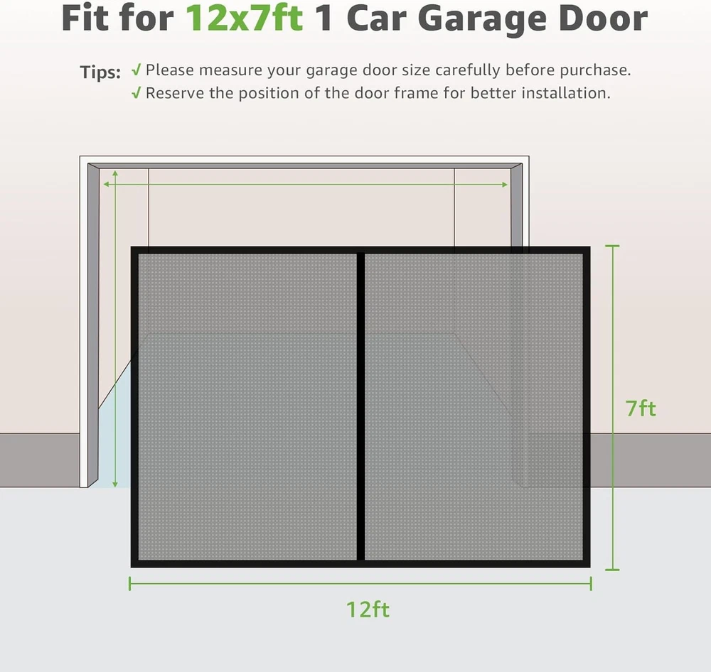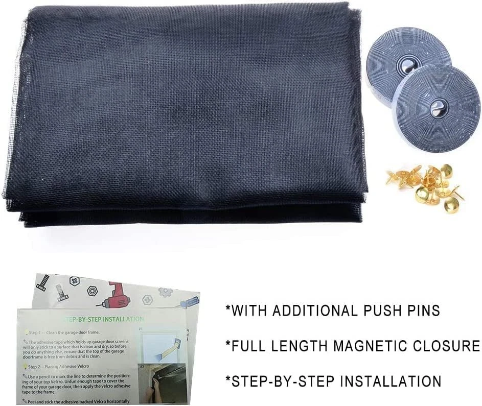 Garage Door Screen 1 Car - 12x7Ft Magnetic Closure Heavy 12 ft x 7 ft, Black Product Details Brand: PICK FOR LIFE Color: Black Material: Fiberglass Style: American Assembly Required: No Manufacturer: PICK FOR LIFE Part Number: garage door screen 12x7 ft Item Weight: 4.71 pounds Product Dimensions: 1 x 192 x 84 inches Country of Origin: China Item model number: garage door screen 12x7 ft Size: 12 ft x 7 ft Item Package Quantity: 1 Included Components: Garage Mesh Screen x 1, Hook and Loop Strips x 2, Install Instruction x 1 Batteries Included?: No Batteries Required?: No Brand: PICK FOR LIFE Color: Black Material: Fiberglass Style: American Assembly Required: No Garage Door Screen 1 Car 12 X7 Ft ENJOY BREEZE: The screen net helps keep pesky animals out and brightens your garage. It seals around the entire edge of the garage door, ensuring that no debris, random leaves sneaks in through the sides, transforms your garage into an extra living space free from little make you crazy animals and dust. DIY EASY INSTALLATION: Installs in minutes with the included hook&loop strips, very easy, instant. Extra push pins for added security and strength. The screen mesh is retractable, frameless, detachable, can be folded up for temporary off-season storage. UNIQUE DESIGN: Strong magnetic and extra gravity sticks closure, directly walkthrough screen doors no matter for human or pets. Extra 16 gravity sticks were added to the bottom sides, which helps with wind resistance. And the strapping tapes at the top allow you to roll up the screen and secure it to the top. PREMIUM FIBERGLASS QUALITY: Made with super-durable fiberglass 18*16 mesh, which is tear-resistant, fireproof, transmitting, corrosion-resistant, good shape, comes with thumbtacks and hook&loop adhesive strips for extra security. Full reinforced edges survive the test of time. FITS GARAGE SIZES UP TO 12x7FT: The screen can be used as a replacement for a fixed screen door and fits front, rear, interior or exterior, entry, patio, deck, porch, balcony, glass, and more. IMPORTANT: Measure your garage twice before ordering.