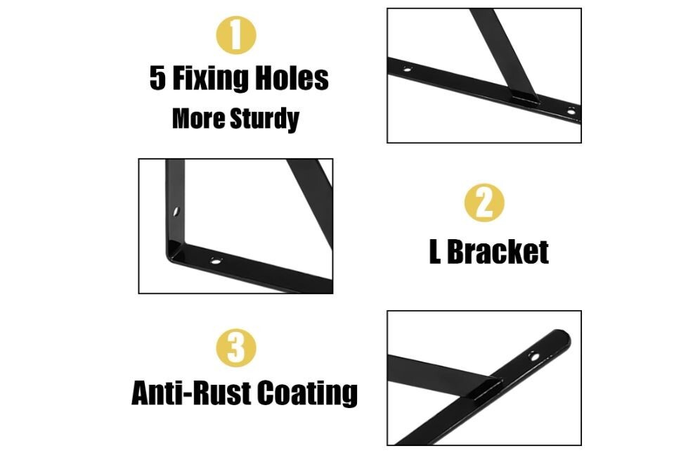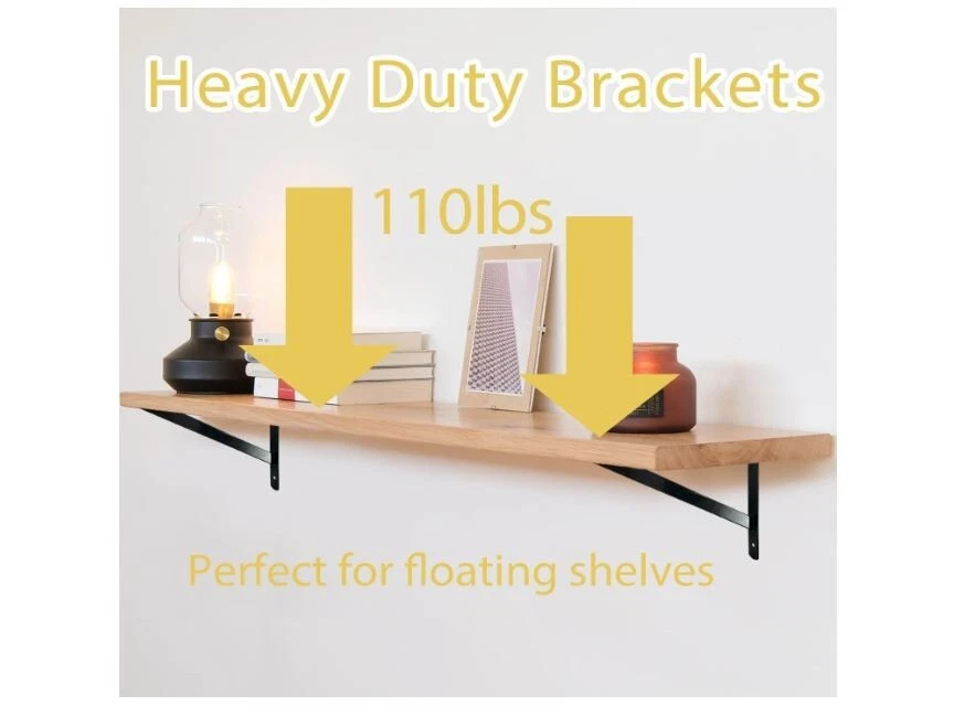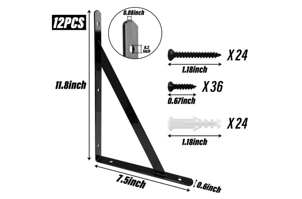 12" x 8" Heavy Duty Shelf Brackets with Screws Metal Shelves Supports Wall Mo Color Black Item dimensions L x W x H 11.8 x 0.6 x 7.5 inches Item Weight 2.27 Kilograms Finish Type Powder Coated About this item Package includes 12 x Brackets , 24 x Long Screws and Anchors, 36 x Short Screws. Made of high quality steel with black powder-coating finish, our brackets are durable, water and corrosion resistant. Pre-drilled fixing holes on each side and included screws are convenient for installation. Heavy duty design with max weight capacity per pair is up to 110lb/50kg. Perfect for DIY floating shelving for your home, office, garage and kitchen etc.