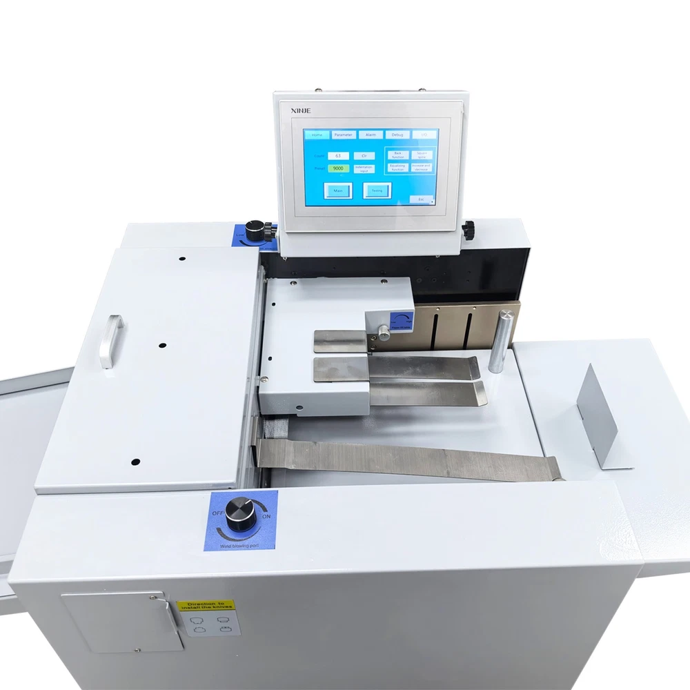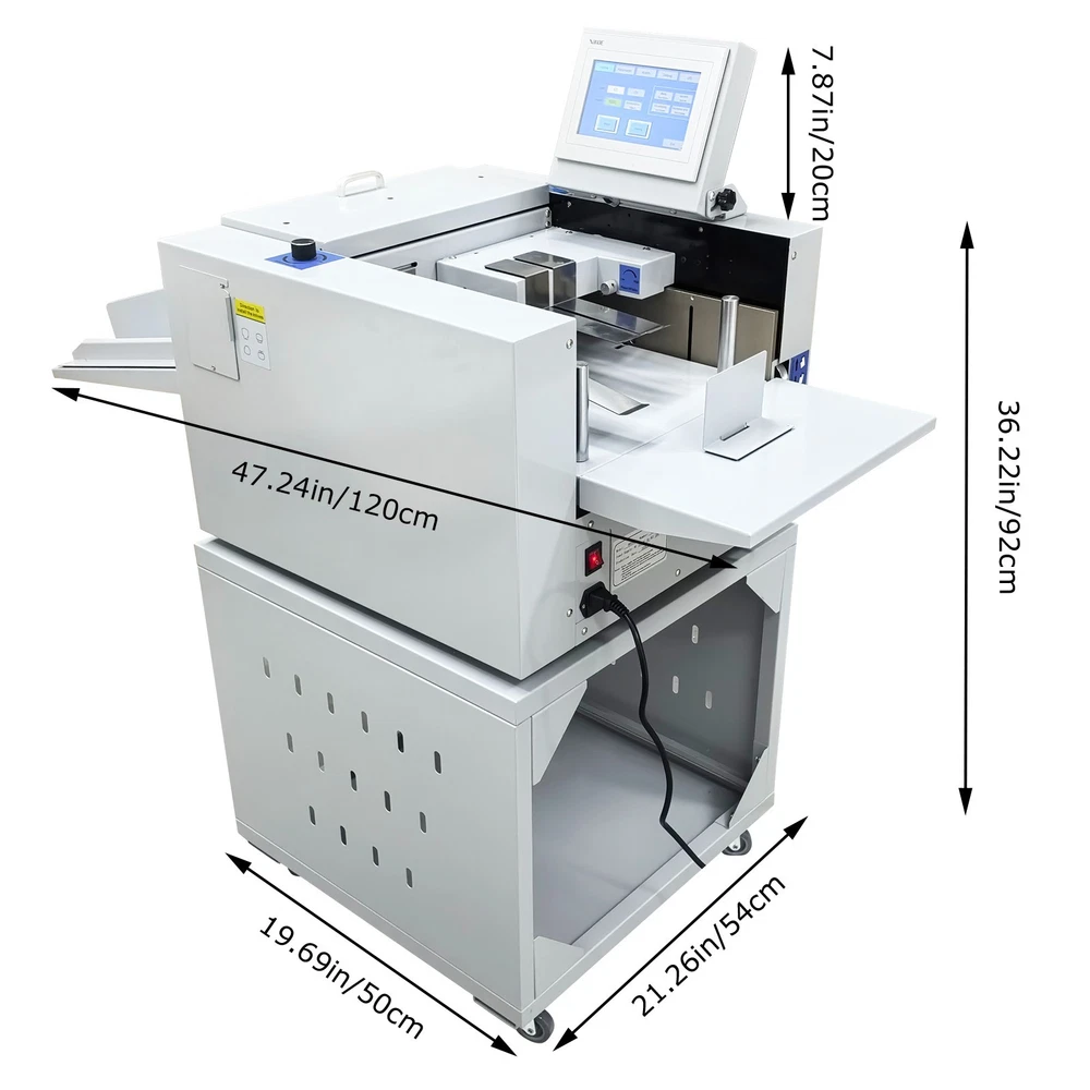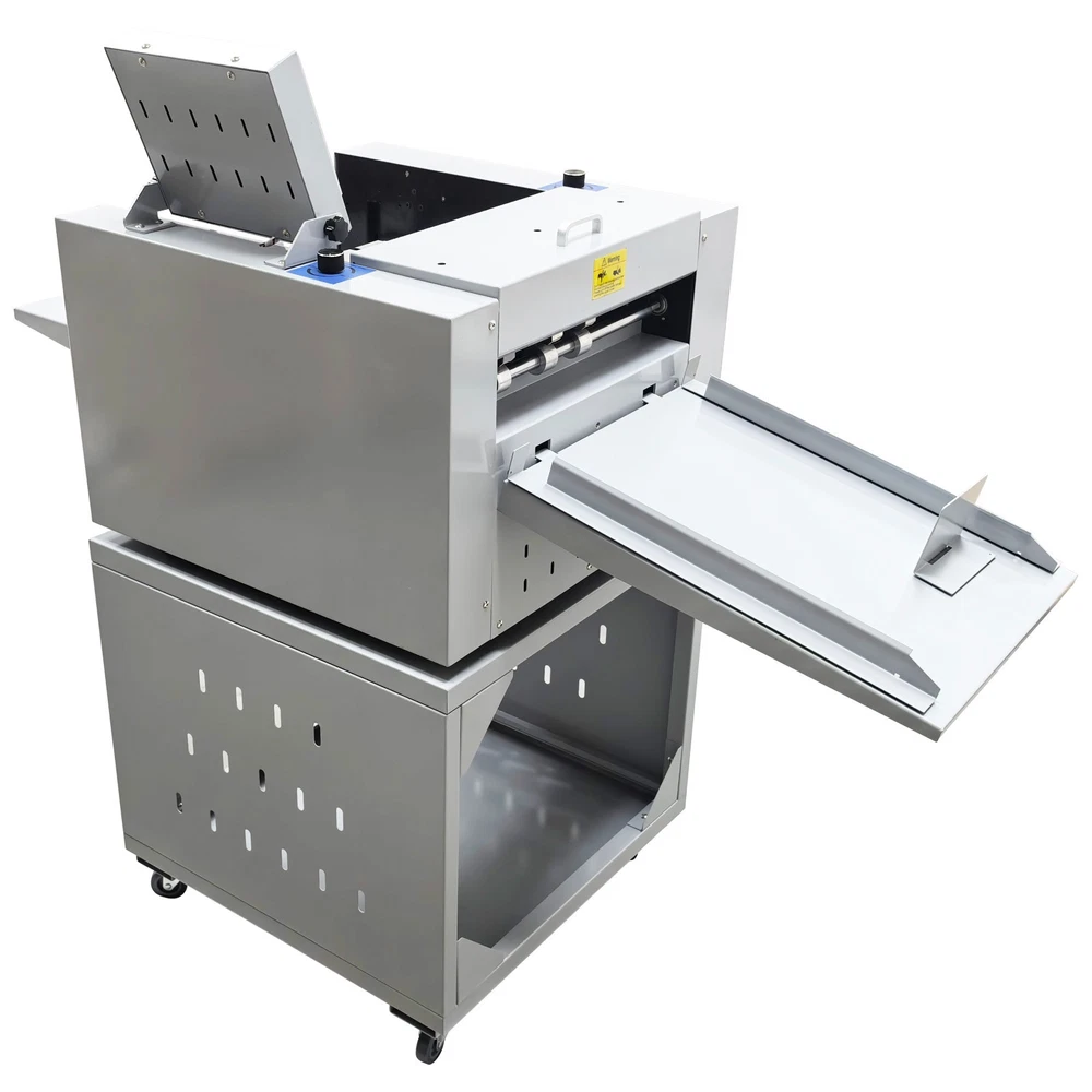 330mm/13'' Full Automatic Electric Digital Touch Control Creasing and Perforating Machine 110V Product Overview The full automatic digital creasing machine is a professional device for forming creases and dotted lines on different paper sheets such as coated paper, laminated paper and varnish paper. The machine has the advantages of achieving automatic feeding of paper sheets, perfectly integrating the transverse creasing and perforating function and the longitudinal perforating function, saving time and labor, reducing the energy consumption and improving the working efficiency. The electric creasing machine can be widely used in various places such as the printing houses, packing houses and office buildings, and is an ideal product for customers. Product Parameters Power supply AC110V 60Hz 200W Paper size 210*297mm-330*900mm (8.27''*11.69''-12.99''*35.43'') Paper type Coated paper, laminated paper, varnish paper, etc. Paper loading capacity 60mm (2.36'') Creasing width 1.0mm standard configuration Working precision ± 0.3mm Working speed 2600 sheets/h (A4/one crease) Creasing/perforating times 0-32 times Paper thickness 0.1-0.35mm (creasing), 0.1-0.2mm (transverse perforating) Operation interface Touch screen Paper feeding mode Top air suction automatic paper feeding Net weight 74KG (163.14LB) Tool 3 tool sets (Transverse creasing tool set*1, transverse perforating tool set*1, longitudinal perforating tool set*1) Attention 1. The power supply must be grounded safely and securely. 2. The operator must read the operation manual carefully and be trained before using the machine. 3. Only professionals are allowed to disassemble and repair the machine. 4. Keep the machine away from the inflammable and explosive substances. 5. Ensure that the machine stops before the tool sets are replaced. 6. Do not stop the machine during operation. Do not touch the running parts during operation. Do not put the hands into the machine. Do not allow people or objects to be located next to the running parts of the machine. Product Features Convenient Touch Control The 5'' intelligent touch screen is designed for setting and adjusting the multiple technical parameters, so the color screen touch control and display are well achieved, and different parameters can be tested and adjusted according to the actual condition. The inclination angle of the touch screen can be easily adjusted by the black screws as required, operation is easy and effortless, and the good adaptability is achieved. Automatic Paper Feeding The top air suction automatic paper feeding system is used for automatically feeding paper instead of manual feeding, thereby greatly reducing the manual labor, and improving the working efficiency. The wind blowing port can be controlled to be opened and closed, and the air volume can be freely adjusted through the touch screen to ensure that various paper sheets with different thicknesses can be smoothly fed. Precision Creasing & Perforating The automatic creasing machine is equipped with 3 tools for transverse creasing and perforating and longitudinal perforating operation, thereby achieving the purpose of accurately completing the transverse and longitudinal dotted lines at a time and simplifying the complex operating procedure. The creasing and perforating tools are conveniently installed and stored in a hidden mode, so the safety protection is enhanced, and the service life of each tool is well prolonged. Accurate Skewing Adjustment The knurled rolling wheel is used for adjusting the skewed paper fed by the feeding platform in the working process. When the paper sheets deviate, the operator can rotate the rolling wheel to correct the paper feeding deviation according to the specific skewing direction, so the feeding deviation can be effectively eliminated, and the normal feeding of paper is guaranteed. Effective Paper Separation Control By the use of the paper separation adjusting knob, the paper feeding baffle piece can be accurately adjusted to control the paper feeding number, thereby effectively avoiding simultaneous feeding of multiple paper sheets and ensuring that the paper sheets are fed one by one. The paper separation adjusting effect is better, and precision feeding of paper is greatly facilitated. Stable Paper Pressing & Limiting The automatic creasing machine is equipped with a long paper pressing parts for A3 paper and two short paper pressing parts for A4 paper, so the paper sheets of different specifications can be stably pressed and prevented from moving after being lifted, and the adaptability is enhanced. The paper baffle parts are also designed for limiting the position of paper, thereby facilitating the paper suction and feeding operation. Orderly Paper Collection A large paper receiving tray is detachably hung below the paper outlet and used for receiving and collecting the finished products neatly and orderly. The baffles on the three sides can effectively limit the paper and prevent the paper from scattering after the creasing or perforating operation is accomplished. Independent & Combined Use The automatic creasing machine is composed of a machine body and a cabinet which can be used independently or cooperatively according to the working environments. The stable supporting legs are designed for the machine body so that the machine body can be stably supported and placed on the cabinet. Operation Method 1. Unpack the box, check whether all accessories are intact, and assemble all the accessories. 2. Select the appropriate creasing/perforating tool set as required and install the tool set at the tool chamber. 3. Connect the power cord to the 110V power socket with reliable grounding, and turn on the power switch. 4. Set the technical parameters on the touch screen as needed, and test the creasing/perforating effect. Conduct normal operation if the creasing/perforating effect meets the demand. Adjust the parameters and different adjusters if the creasing/perforating effect i