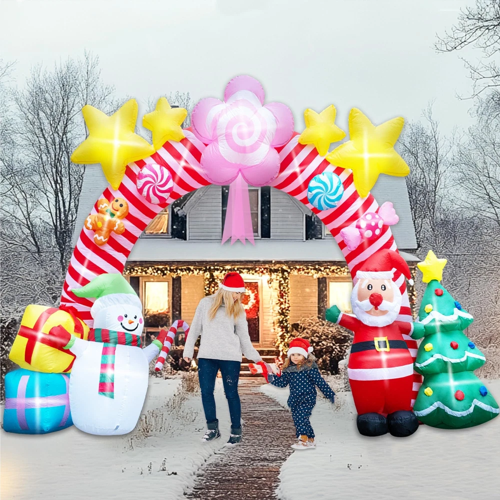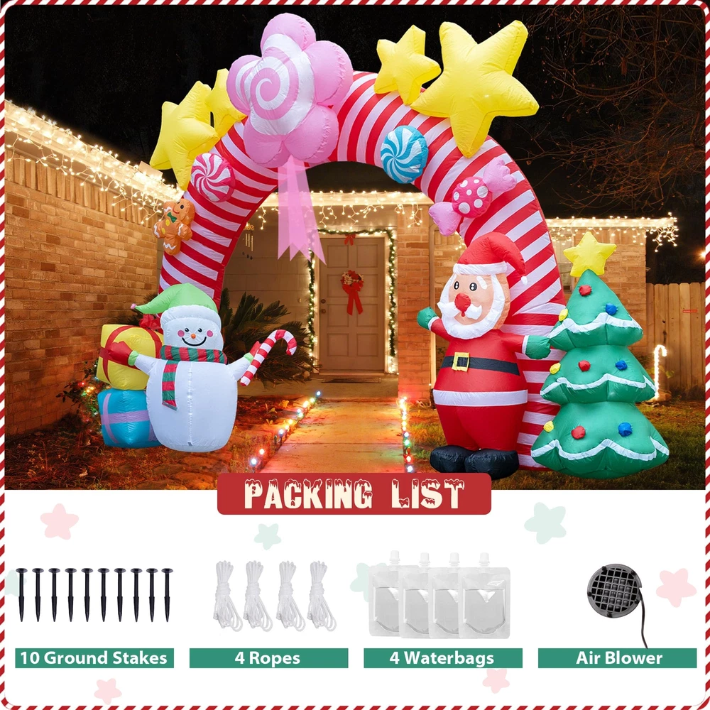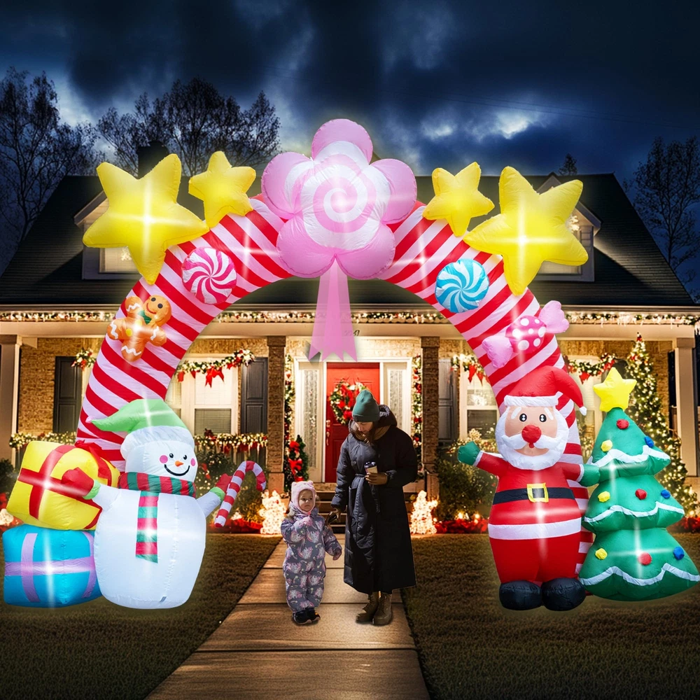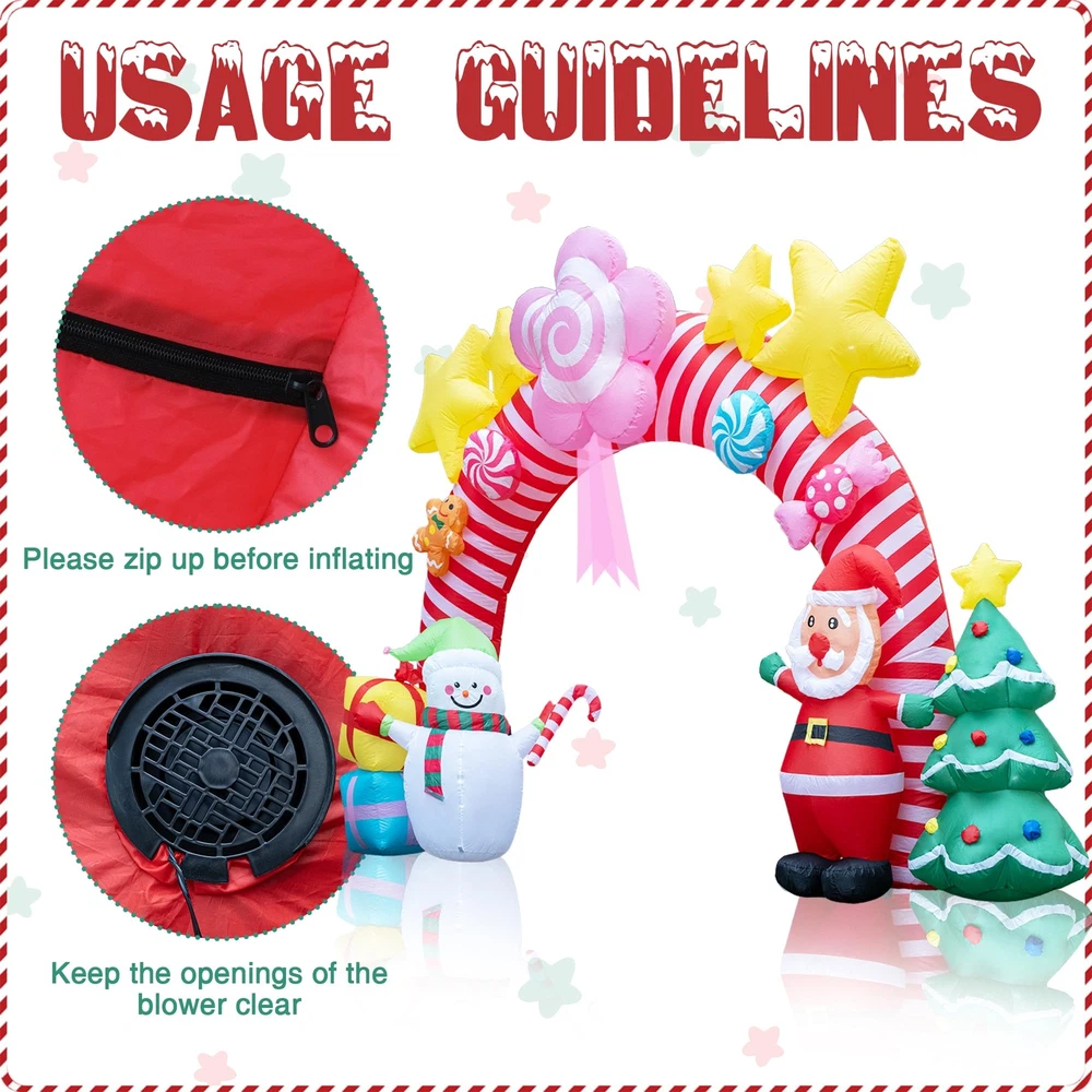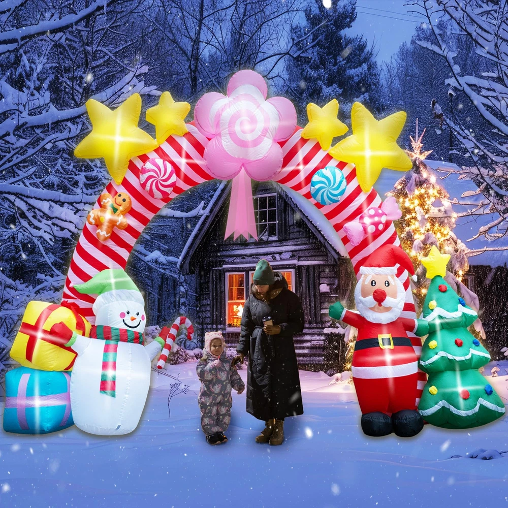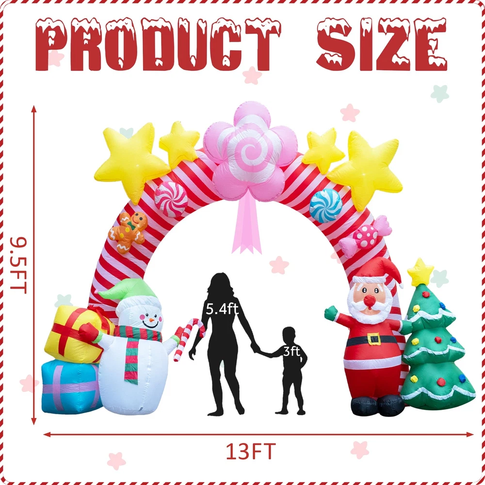 🎄 Large Christmas Inflatable Arch: Standing at an impressive 9.5 feet tall and 13 feet wide, this unique Christmas candy inflatable archway brings a festive spirit to your home and yard. It’s the perfect addition to your outdoor Christmas décor, creating a stunning focal point that will delight guests and passersby alike. ☃️ Creative Design with Multiple Christmas Elements: Exclusively designed for Christmas, this inflatable features a delightful archway adorned with pink candy shapes, elegant ribbons, playful gingerbread people and glittering yellow stars at the top. Underneath the arch, charming holiday characters like Santa Claus, snowmen stand alongside gift boxes and a decorated Christmas tree, capturing the joyful essence of the season. Perfect for adding a touch of fun and whimsy to any setting! ✨ Joyful LED Lighting: Add a magical glow to your holiday nights with built-in LED lights that bring the candy archway to life. The soft lighting creates a warm, inviting atmosphere, making it perfect for evening gatherings, family Christmas parties, or simply enhancing your yard’s holiday charm. It’s especially appealing to children, turning your yard into a festive wonderland they’ll love! 💖 Easy Setup with Powerful Air Blower: Setting up your holiday decorations is hassle-free with the included high-power built-in 2A air blower and 1.5A power adapter. Simply plug it in, zip it up, and watch it inflate in minutes. The package also includes ground stakes, ropes, and water bags for secure setup, ensuring stability in any outdoor space. 🎅 Sturdy and Wind-Resistant for Outdoor Use: This Xmas candy arch inflatable is designed to withstand outdoor elements, with strong ground stakes, durable ropes, and water bags to keep it securely anchored. Whether it’s windy or calm, your inflatable Christmas tree carousel will stay upright and ready to spread holiday joy all season long.