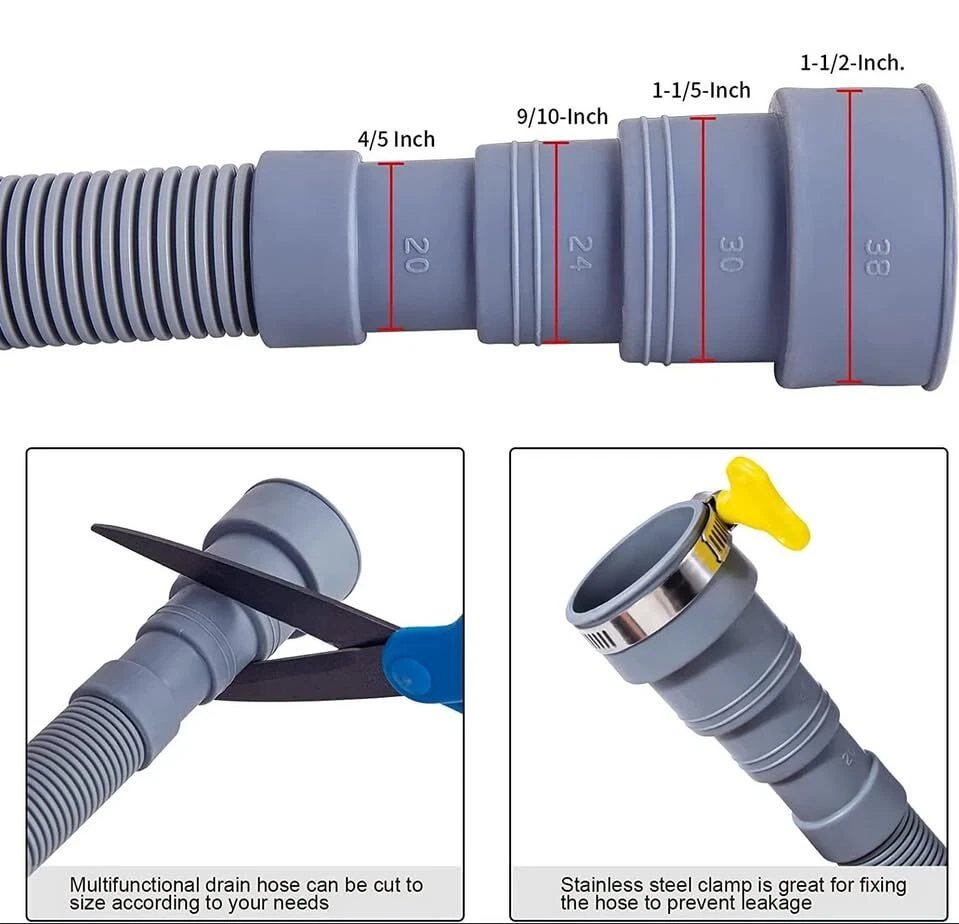 1. Compared with the drain hose made from common materials on the market, our discharge hose is more remarkable. With corrosion resistance, good flexibility, high strength, resistance to extreme pressure and strong bearing capacity, it is more durable and has longer service life. 2.The installation is simple, if it is directly used in the water outlet of the washing machine, then directly insert the hose into the water outlet of the washing machine; if it is to extend the drain pipe, connect the two hoses with the adapter, you can not add the card hoop, but for added strength, you can add. 3. Washing machine drain pipe can be a good fit with the adapter, no water leakage. 4. Formed outlet end fits 1-Inch to 1-1/5-Inch stub outs on automatic front load washing machines. Insert directly into the floor drain or wall mounted discharge outlet pipe if available, it’s better to hang over desired overflow area. The Perfect Combination: The end of the washing machine drain hose fits perfectly with the washing machine outlet. The extended adapter also allows the two tubes to be perfectly combined, without tools, and can be safely connected without worrying about leaking or flooding. Easy to Install: just insert the forming outlet into the end of the hose without any tools. If you are using it for extended hose, simply connect the adapters and connect them without removing the previously connected drain. For even more fixing, you can also add a clamp. Universal Size: 13 feet washer drain hose for automatic front loading washers with outlet diameters from 1-1 / 5" (30 mm). The adapter has a diameter of 21 mm and is suitable for all water pipes that are directly 20 mm inside. Fitted with 18-32 mm clamps for a stronger connection. Premium Material: This durable, ultra-flexible drain hose is made of premium EVA, high pressure resistant, non-toxic and anti-aging. Extended Drain Hose Kit: The drain hose kit includes a 6 feet hose, extension adapter and two clamps. If your home washing machine drain and dehumidifier hose are not long enough or you need to replace the drain, you can choose our drain hose.