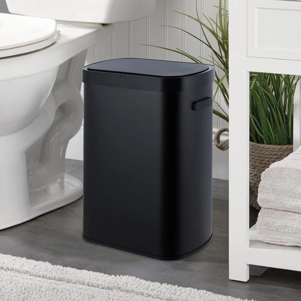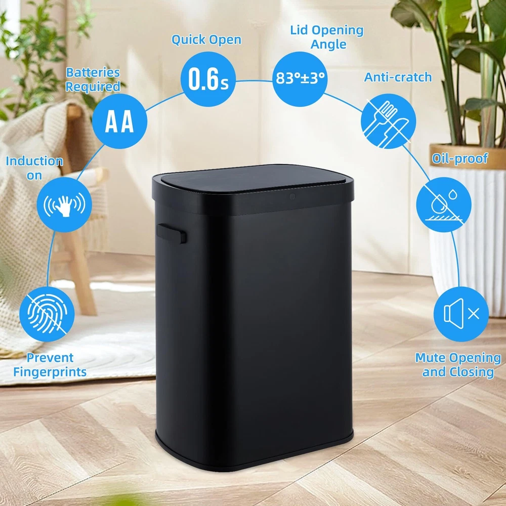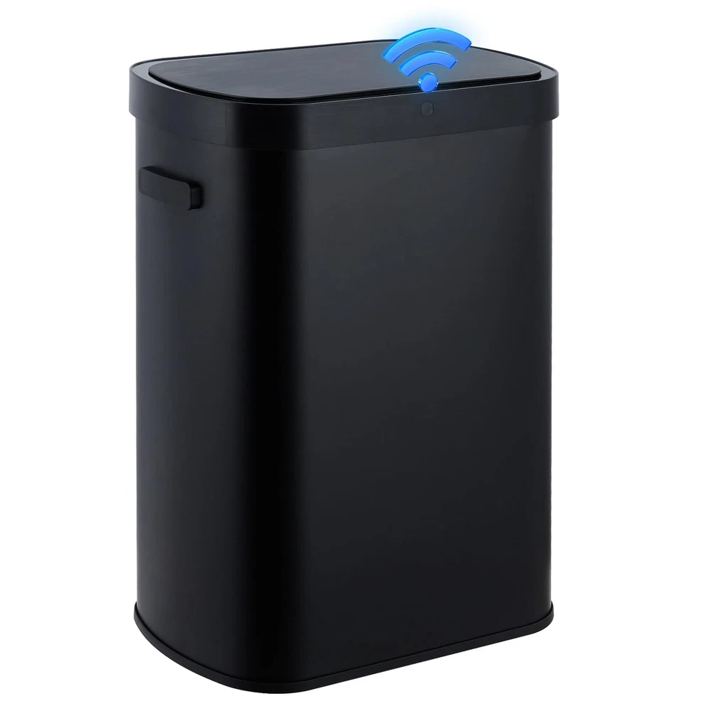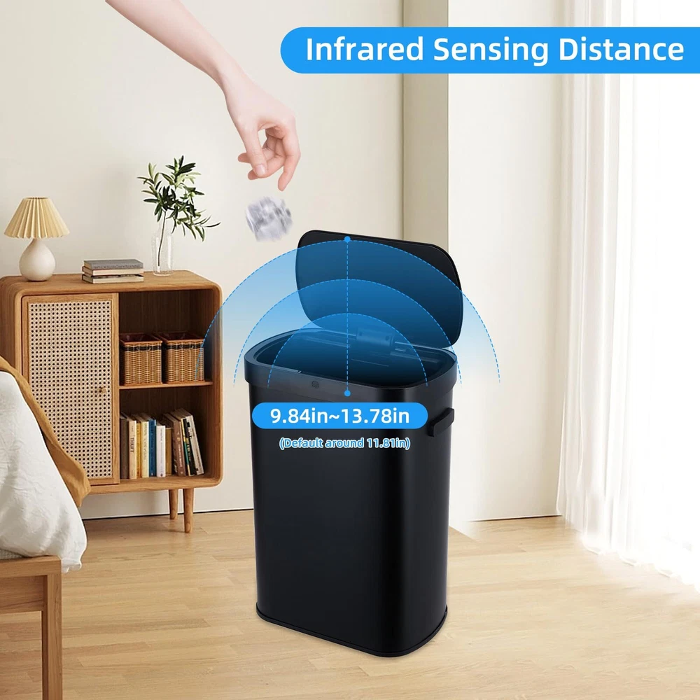 13 Gal/50 L Kitchen Trash Can With Lid, Automatic Garbage Can Touch Free High-Capacity Brushed Stainless Steel Waste Bin, for Kitchen Bathroom Bedroom Home Office, Black Stylish & Spacious: This stainless steel trash can boasts a contemporary and elegant design that enhances any setting while being easy to clean. With a generous 13-gallon capacity, it offers plenty of space for waste disposal and is with standard 13-gallon trash bags available at supermarkets, making it functional and convenient for everyday use. Easy to Clean: Crafted from sturdy and durable stainless steel, this trash can features a smooth surface that simplifies the cleaning process, saving you valuable time. Any dirt on the surface can be easily wiped away with a cloth. Additionally, as long as the lid remains closed, its effective sealing helps to isolate unpleasant garbage odors, keeping your space fresh and odor-free. Motion Sensor: This trash can features a highly sensitive smart sensor that opens the lid within 0.3 seconds upon detecting movement within 25 cm above. The lid will automatically close after 5 seconds. Additionally, if your hand moves back into the sensor area during the closing process, the lid will intelligently reopen, ensuring ease of use and preventing any accidental closures. High-Quality Materials: Constructed from premium stainless steel, this trash can features a brushed finish that is both waterproof and rust-proof. The waterproof motion sensor protects against moisture and any accidental overflow, ensuring the trash can remains durable and functional over time. This design not only enhances longevity but also maintains a sleek appearance in any setting. Wide Application: Our automatic trash can is designed to fit seamlessly into almost any environment. Whether placed in the kitchen, bedroom, bathroom, office, or study, this trash can serves as an effective and aesthetically pleasing solution for waste disposal. Its modern design and functionality make it a versatile addition to your home or workspace.