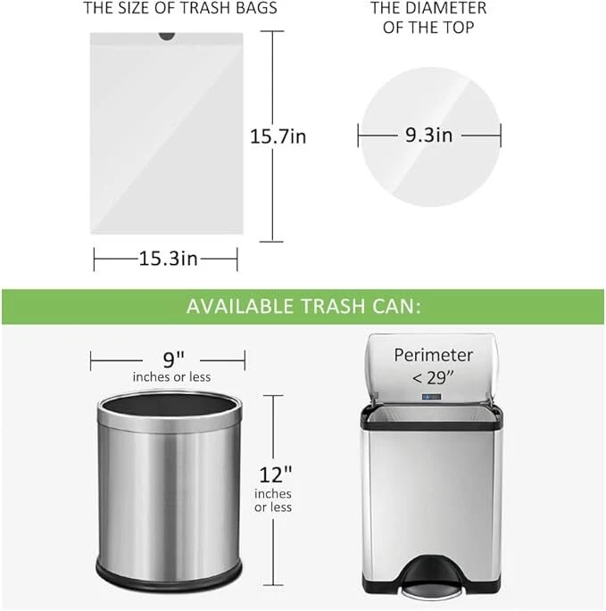 1.3 Gallon 100 Counts (Fit 1.3-1.5 Gal) Mini Drawstring Trash Bags Garbage Bags Premium Quality: Our trash bags are made of newest pure HDPE material which has proper thickness and perfect for lightweight materials and has excellent resistance to puncture and moderate resistance to tearing, leakproof and odor control. Convenient Drawstring Handles: The strong drawstring let a tight grip on trash cans , so there is no messy bag overhang or bunching. Multipurpose: Our trash bags are suitable for use in bathroom, bedroom, living room, dining room, office or cleaning pet’s litter and baby diapers.