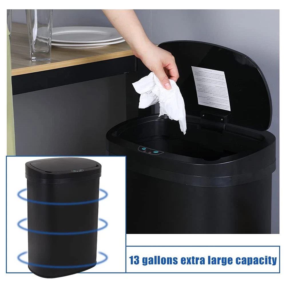 SPECIFICATIONS: Name: Automatic Trash Can Material: Stainless Steel Over Size: 11” x 16” x 23” Capacity: 13 Gallon / 50 Liter Battery: Type C Battery *4 (Which is not include) Applicable Place: Kitchen / Living Room / Bedroom / Bathroom / Office / etc... FEATURES: ✔ Subverting the traditional way of throwing garbage, our auto-sensing non-touch trash can automatically senses the approach of human hands or garbage, and automatically opens the lid. After the garbage is thrown in, the lid is automatically closed to isolate odors. ✔ Durable stainless steel material and appearance not only good looking but also easy to maintain and clean, won’t left any fingerprint, this garbage bin is waterproof and mute, which does not limit its applicable using occasion. ✔ Without complex design, this waste bin is very easy to use, after install the batteries, you only need to press the switch to “ON”, and if you want to change the garbage bag, you only need to lift the top part, the capability will match your daily need. ✔ Shipped from US, the delivery time usually between 3-7 days, you don’t need to wait for a long time to receive your package. 🚮【Large Capability】The 13 Gallon (equal to 50 Liter) capability garbage bin can absolutely meet your daily need. The regular 13 gallon garbage bag in the supermarket can be used in our waste bin perfectly. 🚮【High-Tech Induction Device】Our touch free trash can used high technology induction device, whether it is sensing the proximity of a human hand or an object, it can respond quickly to open the lid of the trash can, and automatically close the lid within 5 seconds after the trash is thrown in. 🚮【Easy To Clean & Isolate Odors】:The trash can’s stainless steel wire drawing is fingerprint-resistant and easily cleaned after sustained use, while the sealed exterior and infrared technology ensures odor is contained. 🚮【Adapt to Various Occasion】You can put it near the cooking table in the kitchen to make it easier to thrown the food waste, and with the waterproof design, you can also put it in the bathroom, it also suitable for living room, bedroom, and office or other various occasion. The classic and simple design will never out of fashion. 🚮【After-Sale Service】If you have any problem with the product or meet any question during the usage, please feel free to contact with our customer service, we promise we will provide you the most professioal technical support and best solution.