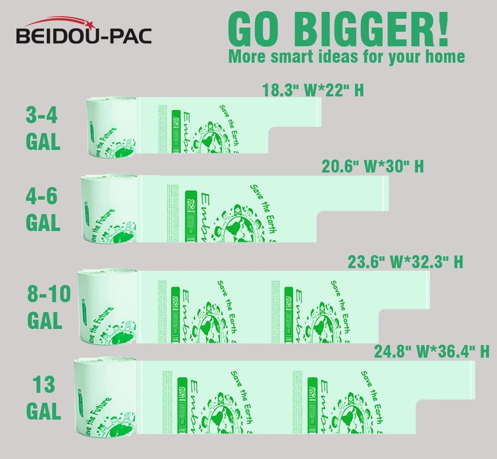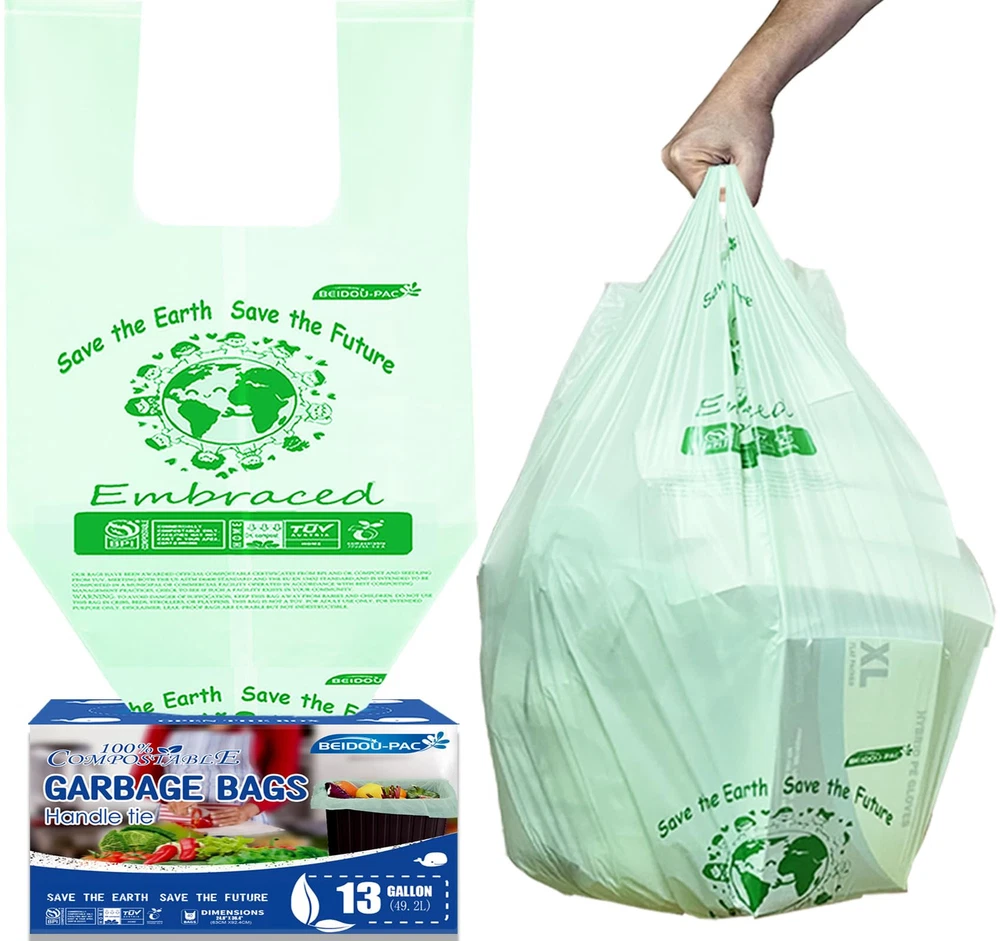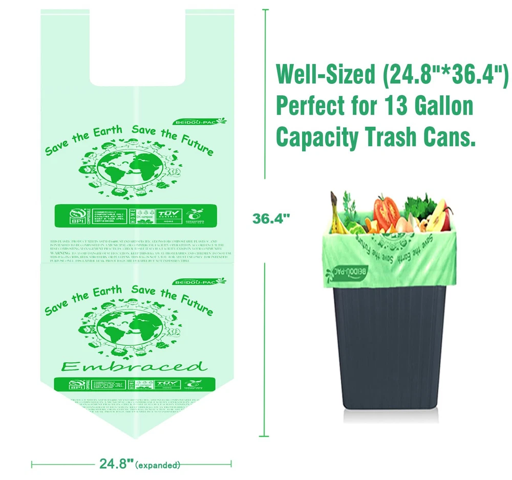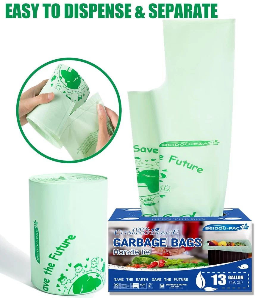 [TALL KITCHEN COMPOST BIN ] -- Compostable Bags, 13 gallon (49.2 liters) 24.8" x 36.4" x 0.9 mils, 30 bags per roll, home compostable and biodegradable are with a backyard compost system. Our compost trash bags can perfect for 13-gallon under-the-sink kitchen trash can. [SAFE & NO PLASTIC RESIDU] -- 100% Certified Compostable Kitchen Food Scrap Bags, Kitchen Compost Bin , are safer for the environment, which are mainly made from PBAT & PLA & Vegetable starch like corn, and completely degrade into biomass, water and CO2. after 1 year when placed in both home and commercial composting facilities. 100% compostable food waste bin bags are made from plant vegetable and 100% return back to earth. [U.S.&EUROPE 100% COMPOSTABLE CERTIFICATION] -- These compost garbage bags meet the requirements of municipal compost programs and ASTM D6400 and Compost Bin Bags Certified by BPI Meeting ASTM D6400 Standards in the USA. and compostable kitchen trash bags Certified OK Compost Home under European standard EN 13432 by Vinçotte and Tüv Austria. [CONVENIENT & DURABLE] -- 100% Compostable Bags came just in a big roll and pre-set break point design help you dispense and seperate easily, handle tie and the star seal at the bottom can increase the load carrying capacity, leak-proof Compost Bin Liners does not break or tear easily in your compost containe, Note: Dispose of product within 7 days when bag is holding wet waste. [MORE RESPONSIBLE CHOICE] -- It has never been easier to do your part and contribute to a better environment with compostable garbage bags. Biodegradable bags wastebasket liners are perfect for kitchen waste, table food scrap, daily trash and outdoor dinner parties or office, home, bathroom, bedroom, car, dog Pet. We are all responsible for saving the earth and feel less guilty anymore. It's an excellent for plastic trash bags!