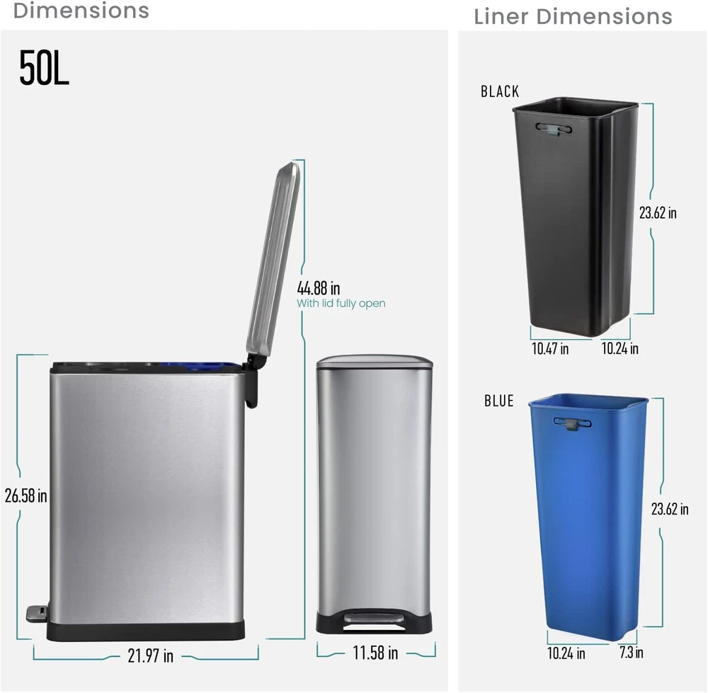 Store New Arrivals Add to Favorite View Feedback Contact 13 Gallon Kitchen Trash Can, Dual Removable Liners for Recycling and Trash, 50 Liter Slim Stainless Steel Shape (8 + 5 for 13 Gallons Total) Description Item model number VA41833A Capacity 13 Gallons Number of pieces 1 Country of Origin China With Lid Yes Unit Count 1 Count Room Type Office, Kitchen Batteries required No Material Stainless Steel Pattern Name 50L Trash Can Finish Type Brushed Included Components Kitchen Trash Can, 8 Gallon Liner, 5 Gallon Liner Item Weight 16.5 pounds Opening Mechanism Step-On Special Feature Slim Shape, Dual Compartment, Compatible with Liner Codes 20R and 30R, Slow Close Lid Color 13 Gal Brushed Silver Global Trade Identification Number 00889526300647 Shape Rectangular Recommended Uses For Product Recycling, Trash Finish types Brushed Product Dimensions 22.09"L x 11.61"W x 26.61"H Size 13 Gallon Dual Compartments: Simplify your recycling process with separate bins for waste and recyclables; managing household waste has never been easier for you Space-Saving Design: Its slim profile fits easily in tight corners; making it ideal for any room at home, even those with limited space Easy Bag Changes: Install your trash bags quickly and easily with the included rubber band on the removable inner buckets; helping prevent spills and overflow when you are taking out the trash Quiet and Convenient: The smooth, quiet operation of the foot pedal and the soft-close lid create a peaceful environment in your home Custom Fit Trash Bags Available: Compatible with our Liner Codes 20R and 30R; offering a seamless fit for your trash bags Hands-Free Operation: The foot pedal allows for easy and hands-free waste disposal, even when your hands are full Enjoy Peace of Mind: Our commitment to your well-being extends beyond the product itself. Should you have any questions or require assistance, our dedicated support team in the USA is readily available to assist you via our website or social media platforms Product Description What are the benefits of having dual compartments? Dual compartments simplify recycling by providing separate bins for waste and recyclables, making household waste disposal easier Is this trash can suitable for small spaces? Yes, its slim profile and space-saving design fit easily in tight areas, making it ideal for placements in between cabinets, against the wall or kitchen island. How easy is it to change the trash bags? You'll love how easy it is to change the bags. The included rubber band keeps everything in place, so no more messes to clean up. Is the trash can noisy? No, the trash can is designed to be quiet. The foot pedal is smooth and the lid closes softly, so it won't disturb you. What type of trash bags should I use with this trash can? It is compatible with Liner Codes 20R and 30R, offering a seamless fit. ABOUT US We offer the best prices around on high quality products. Our E-store includes media such as books, movies, music and games while offering electronics, toys, sporting apparel, clothing, tools, general home, garden items and more. SHIPPING We are always working hard to ensure your package arrives as soon as possible. Please understand that some factors like weather, high postal traffic, and the performance of shipping companies are outside of our control. We offer free shipping to the lower 48 states and ship within 2 business days of payment, usually sooner. We do not accept P.O. Boxes. Please provide a physical address. For shipping outside of the continental USA, we only use eBay's Global Shipping Program.The item is shipped to KY and then sent to the rest of the world. International customers are responsible for all duties and taxes. Continue to check out in order to calculate costs for shipping the item to your country. Messages regarding eBay's Global Shipping Program MUST be directed at eBay EXCLUSIVELY. RETURNS We offer a 30-Day Return Policy on items which you are not completely satisfied with. You have the option for a full-refund or an exchange of the item. No returns are available on items shipped outside of the USA. PAYMENT We accept PayPal. CONTACT US This page content is yet to come Please ad us to your favorite seller and visit again later Thank You CUSTOMER SATISFACTION We try our very best to make sure every customer is completely satisfied. If there's a problem, message us! We're happy to help. WE ACCEPT Copyright © 2021 AutoDS. | All Rights Reserved
