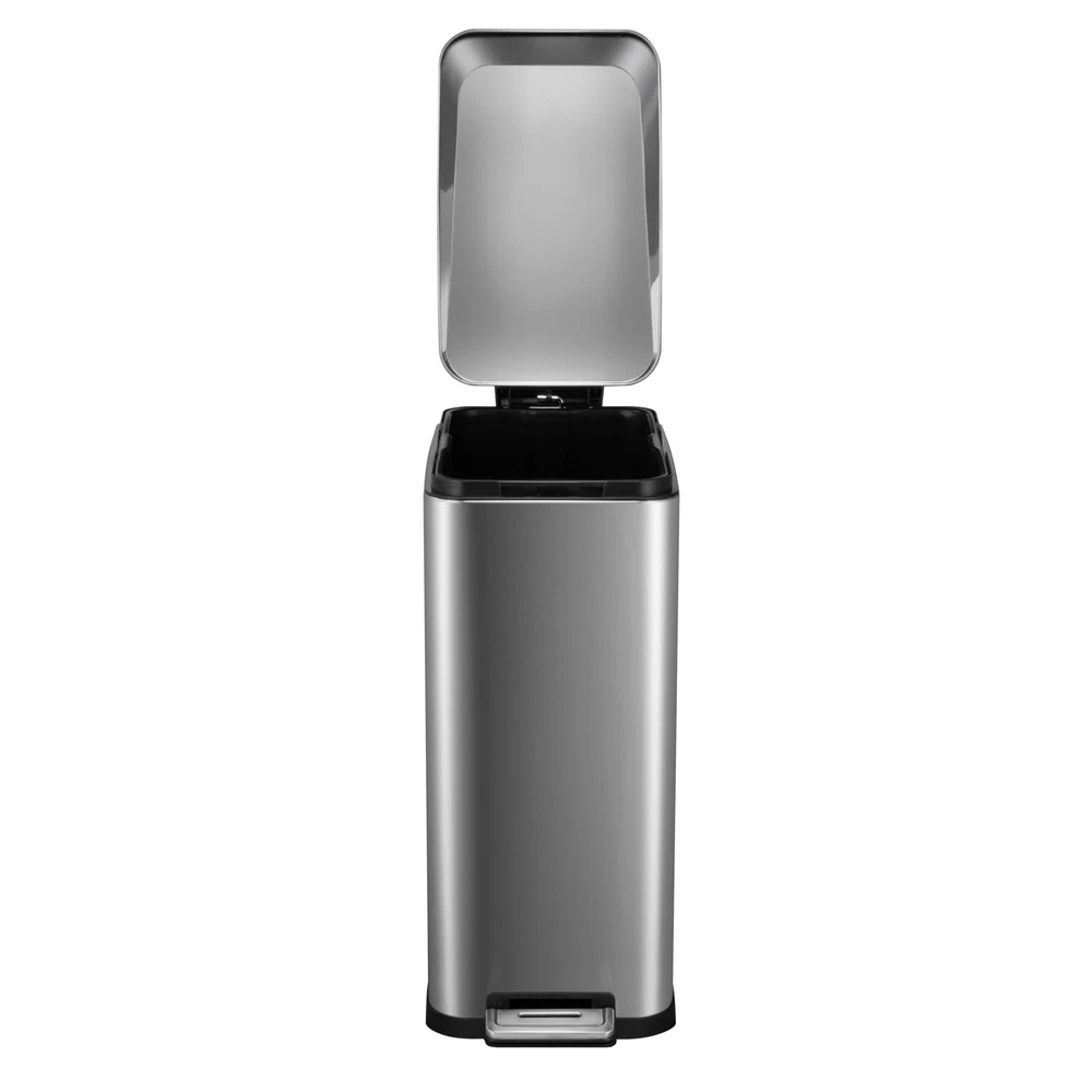 13 Gallon Tall Kitchen Garbage Can, Hands-Free Stainless Steel Trash Can with Lid Soft Close, Step Pedal, Slim Rectangular Fingerprint-Resistant Kitchen Trash Can with Removable Inner Bucket Hands-Free Convenience: The strong steel pedal in the bathroom trash can enables hands-free operation, making waste disposal effortless, especially when hands are occupied or dirty. This feature adds convenience and ease of use to the trash can, enhancing the overall user experience. Functional and Safe Design: The standing function of the trash can allows the manual cover to open at an angle greater than 90 degrees, which is particularly useful for kitchen use. This design feature ensures safe and convenient usage, enhancing the practicality and usability of the trash can. Noise Reduction: The soft-close lid of the trash can set prevents loud slamming noises, creating a peaceful environment. The internal hinge design further reduces noise by preventing the lid from bumping against the wall, contributing to a quieter and more pleasant user experience. Easy Waste Disposal: The inclusion of a removable wastebasket in the trash can set simplifies trash disposal and makes it easy to replace trash bags. The rectangular design of the set is tailored to fit well in various areas, maximizing functionality and space efficiency for convenient waste management. Clean and Durable Construction: Crafted from stainless steel, the trash can set is resistant to fingerprints and dirt, maintaining its natural sheen and luster. The bottom seal of the trash can further enhances cleanliness by preventing spills and leaks, ensuring a clean environment and extending the durability of the product.