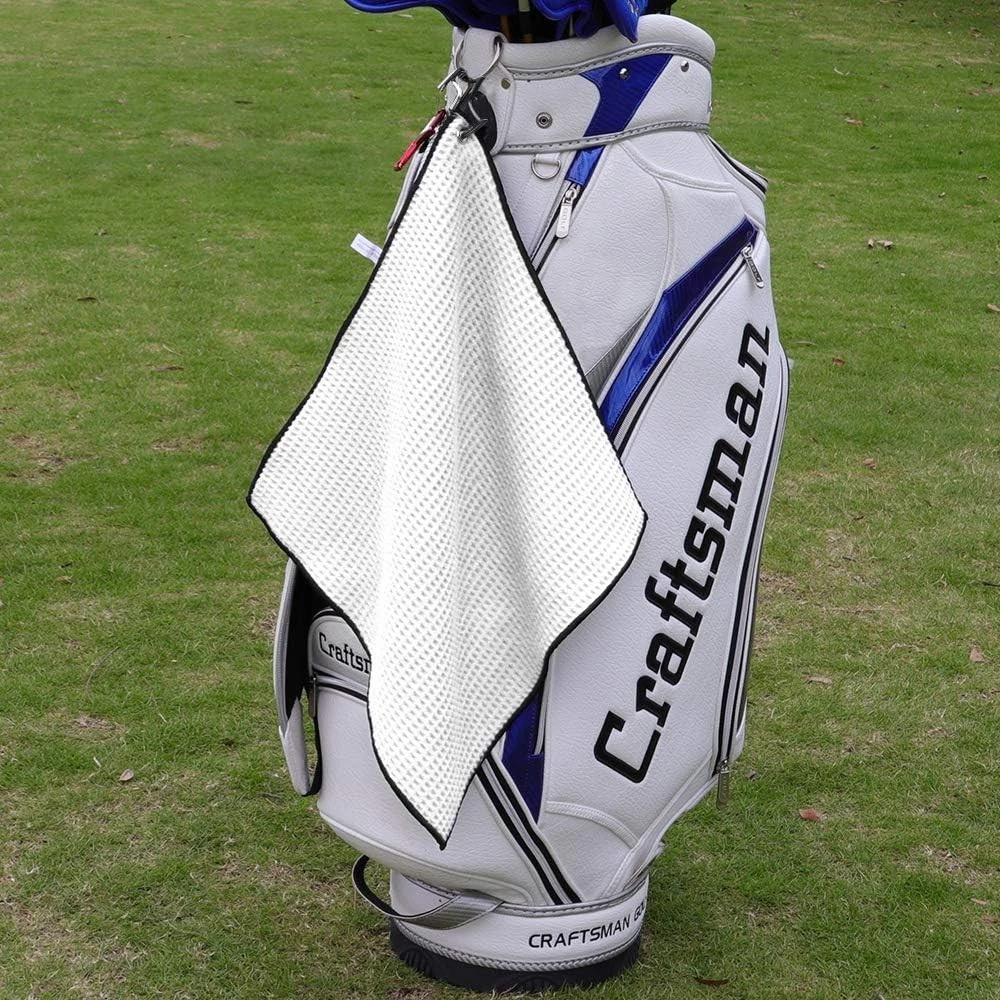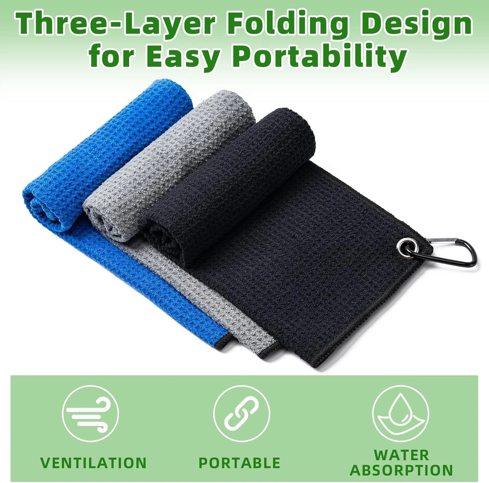 Blue/Black/Gray BRAND NEW Convenient Golf Towel:Each golf towel has dimensions of 16 inches by 16 inches, providing sufficient area for cleaning while still being small enough to conveniently fit in your golf bag without occupying excessive space. Microfiber Fabric Golf Towel:Crafted from microfiber material, our trifold golf towel is not only soft and highly absorbent but also effectively removes dirt, ensuring that your golf clubs, balls, and hands stay dry quickly during your game. Versatile Carabiner Clip: Each golf towel is fitted with a useful clip, which enables effortless attachment to either your golf bag or belt loop for prompt accessibility. This aspect boosts the towel's adaptability and ease of use during your time on the course. Stylish Waffle Weave Design:Stylish Waffle Weave Design:The waffle weave design not only contributes a stylish element but also expands the towel's surface area, improving its ability to clean effectively. This unique pattern can be rubbed into grooves on golf balls and grooves on clubs, and it can clean your sunglasses without leaving streaks. Great Value 3 Golf Towels:We've carefully selected three stunning color combinations that are not only the ideal size but also highly resistant to stains: black, blue, and gray. This gives you more options to coordinate with your golf bag! These make for excellent golf gifts! White 16" x 16" Microfiber Material. The Waffle Pattern helps clean balls and club heads better. Microfiber Material absorbs less water than cotton, easier to wash and carry. Clip conveniently attaches to your golf bag and prevents lost towels. Golf towels come in many styles to match your bag, club, and favorite team. THANK YOU