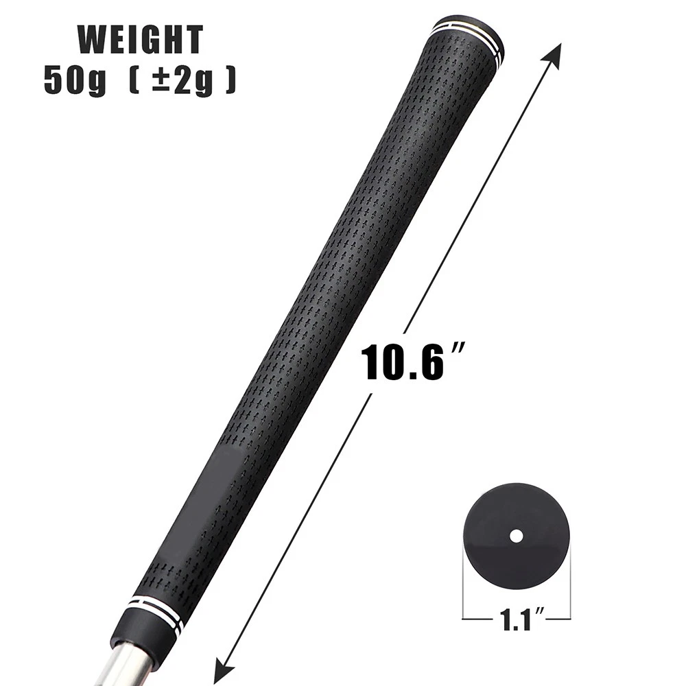 Features: The most popular grip in golf today combines an exclusive, state-of-the-art rubber-blend compound non-slip surface pattern for maximum playability, comfort, and confidence Specifications: Color: Black Size: Standard/Midsize Material: All-Rubber+Brushed Cotton Cord Caliber: 60R Standard Size: - Length: 270mm - Weight: 50 (±2g) - Caliber: 60R Midsize Size: - Length: 270mm - Weight: 60 (±2g) - Caliber: 60R Package Includes: 13 PCS golf grips