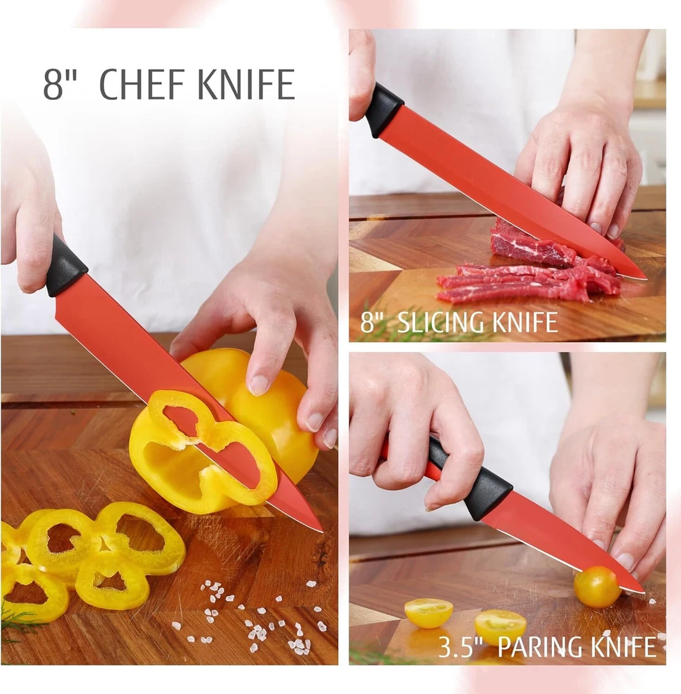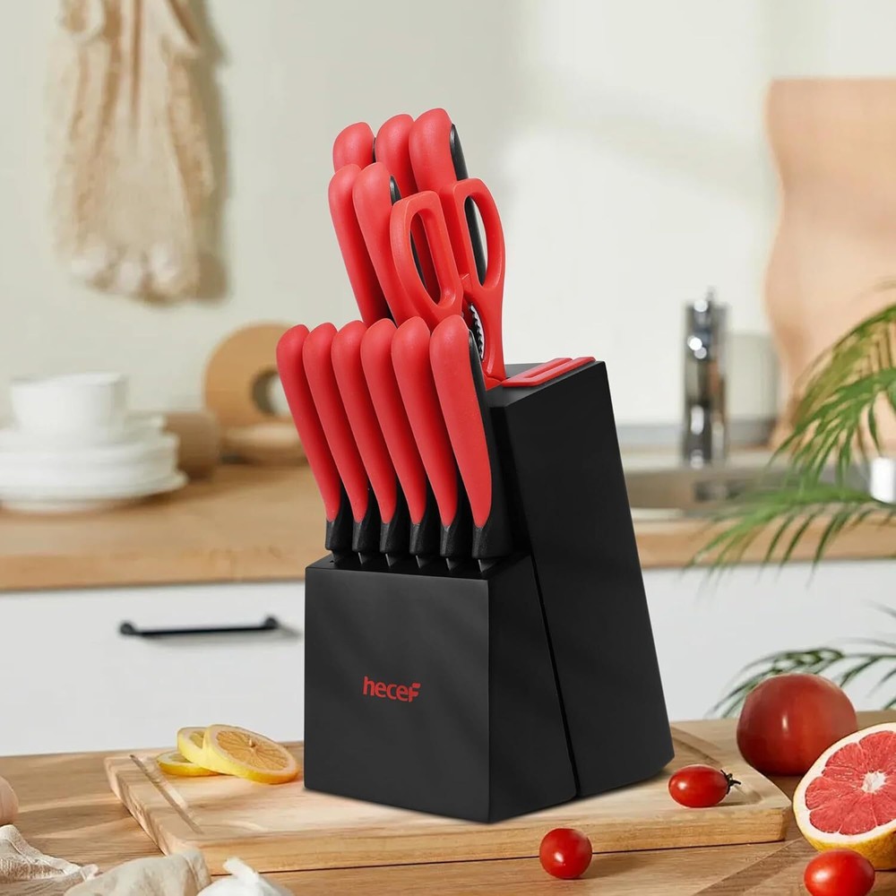 Product Description 13 Pieces Kitchen Knife Set with Built-in Sharpening Wooden Block, High Carbon Stainless Steel Knife Block Set with Steak Knives, Kitchen Scissors, Red ALL-IN-ONE KNIFE SET: The set includes an 8" chef's knife, an 8" bread knife, a 8" slicing knife, a 5" utility knife, a 3.5" paring knife, a pair of kitchen scissors, a 6 pcs steak knife, and a knife block for all of your everyday cutting tasks. PREMIUM MATERIAL/QUALITY KITCHEN KNIFE SET: Our blades are carefully forged from premium martensitic stainless steel for higher corrosion resistance and exceptional durability. BUILT-IN SHARPENER: The knife block comes with a built-in sharpener, saving you from honing blades on a sharpening steel and keeping your knives sharp for a long time. In addition, knives can be stored in knife block, freeing up countertops and saving space. NON-STICK AND ANTI-CORROSION BLADES: The blades are coated with a food-grade red coating that enhances the non-stick performance of the blades so they won't stick when cutting ingredients. It also effectively prevents corrosion and rust. ERGONOMIC HANDLE: This streamlined handle is injection-molded from PP+TPR material, sturdy and durable for a great kitchen experience. The handle has a frosted surface with a non-slip feature that is safe to use and feels comfortable. No fatigue even after prolonged use. About Us We are a reputable seller with many years of experience selling on eBay. Our goal is to provide high-quality products and excellent customer service. Shipping Items will be shipped within 1-3 business days when we received payment. (Orders are not processed on weekends & holidays) Tracking information will be sent once item is shipped. Delivery time depends on destination and other factors Item is shipped to ebay address. Leaving correct address can minimize delay. For international shipping and shipping to Guam, Hawaii and Alaska, Please contact us before placing the order. International buyers please note: Import duties, taxes and charges are not included in the item price or shipping charges. These charges are buyer’s responsibility. We will try our best to reduce the risk of the custom duties. Local pick-up is unavailable at the moment. Contact Us We reply any email messages within 1 business / working days(off-duty at weekend). If you do not get a response from us, then please check your junk or spam mailbox. Our Business hours: Mon-Fri 9:00-18:00, UTC/GMT +8 hours. Please contact us either by clicking "contact seller" in the "purchase history" section or simply click "ask a question" at the bottom of this page. If you are unsatisfied with our item or service, please contact us before leaving any feedback. We are committed to resolve all issues in a friendly and satisfactory manner.
