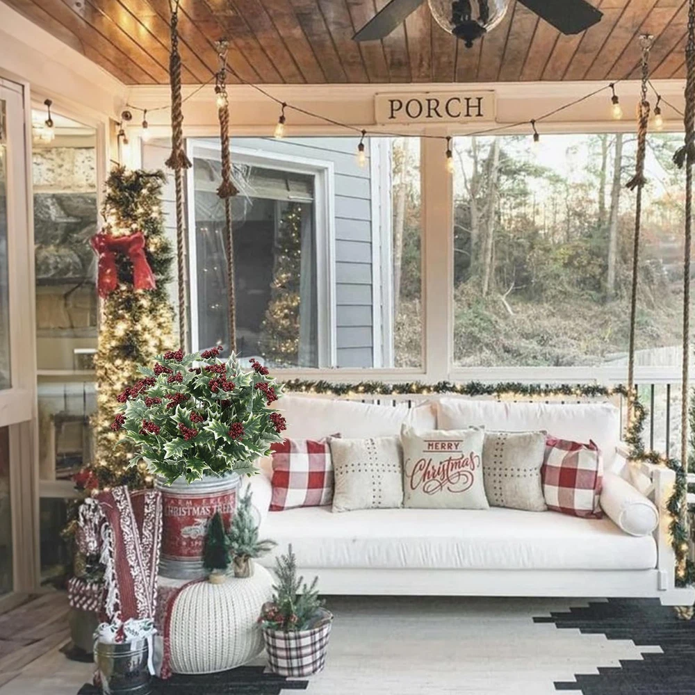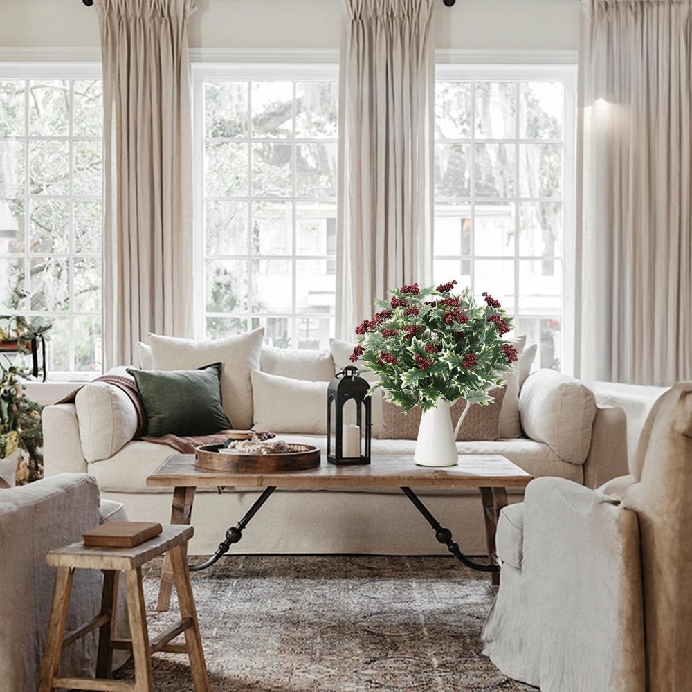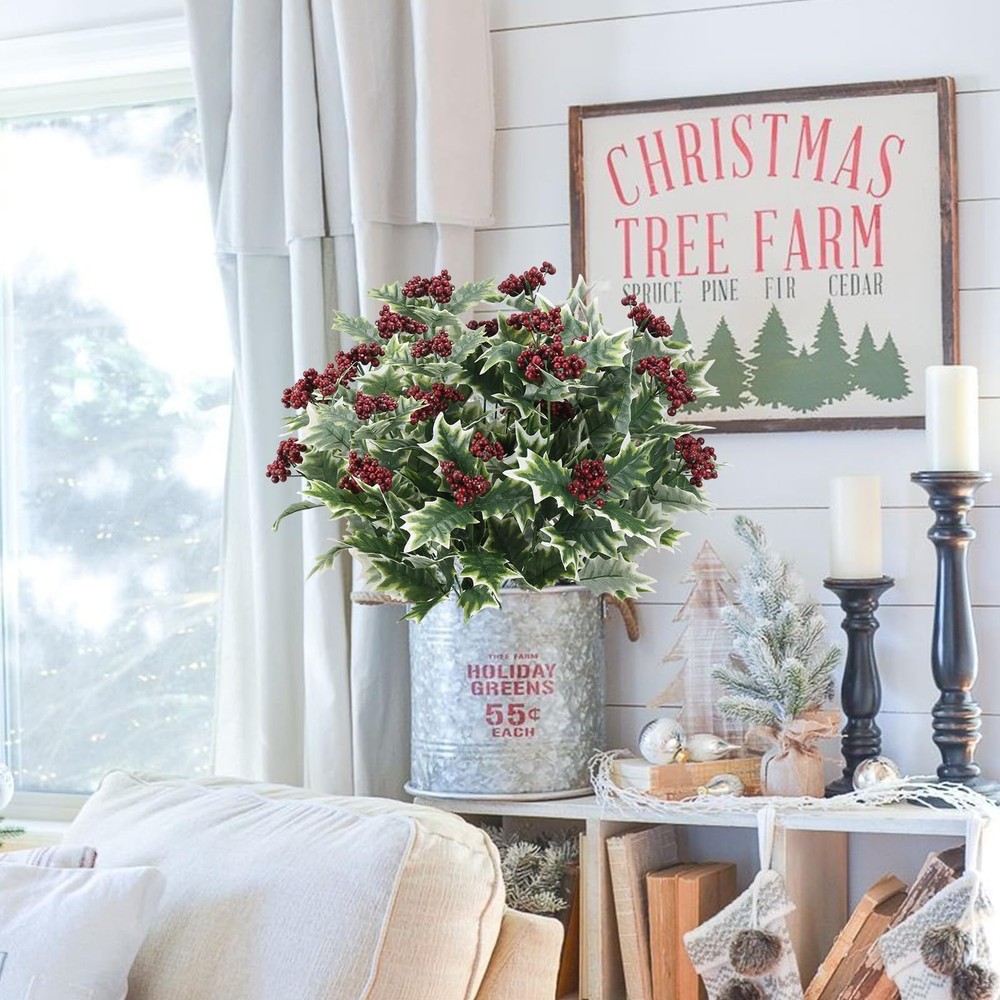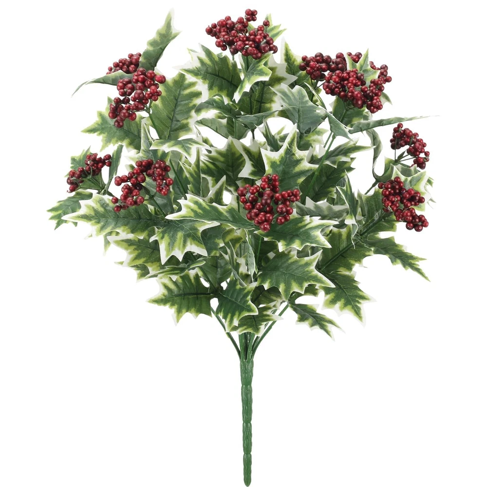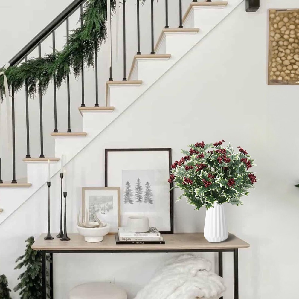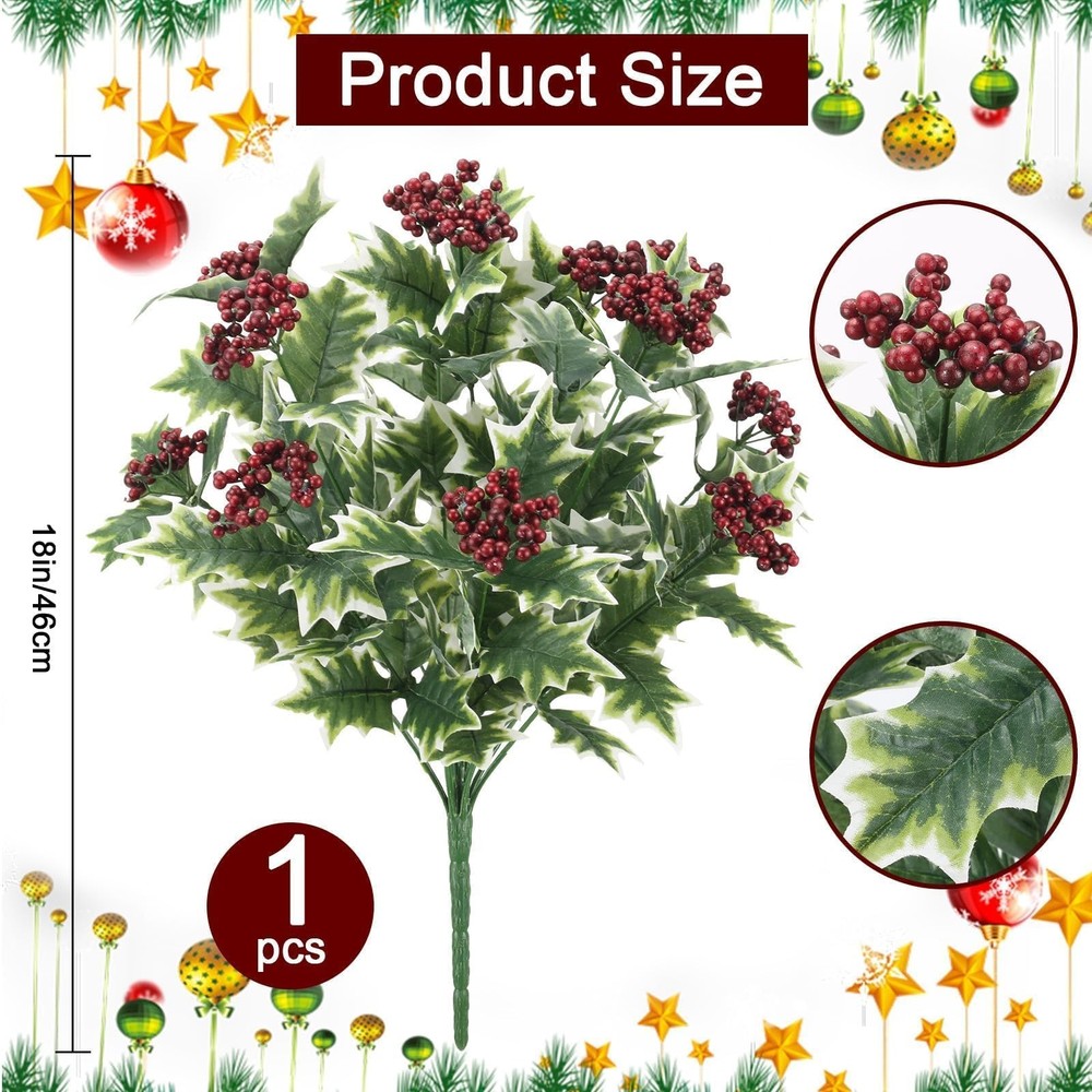 Bring the timeless charm of Christmas to your space with our 13-stem artificial holly leaves featuring vibrant red berries. Crafted with meticulous detail, these holly leaves look remarkably lifelike, capturing the beauty of real holly without the hassle of maintenance. Their durable construction ensures they'll stay vibrant and beautiful for many holiday seasons to come, making them an essential addition to your Christmas decor collection or a thoughtful gift for fellow holiday enthusiasts. Whether you're decorating a Christmas tree, crafting a beautiful wreath, or adding festive accents to your home or office, these versatile holly leaves are perfect for the job. Their durable construction ensures they'll stay vibrant and beautiful for many holiday seasons to come, making them an essential addition to your Christmas decor collection or a thoughtful gift for fellow holiday enthusiasts. Lifelike Appearance: 13 lifelike christmas holly leaves paired with vibrant red berries look just like the real thing, lasting for several holiday seasons. Holly stems is an excellent choice for Christmas, winter, festive, and seasonal decorations, adding rich holiday ambiance to any space. Packaging and Dimensions: Each set contains 13 holly leaves. These artificial Christmas branches measure approximately 18 inches in length and are exceptionally lush and full. You can adjust Christmas flowers artificial to the perfect height to complement a wide variety of holiday decorations and suit your diverse needs. Premium Materials: These christmas bouquet artificial flowers are crafted from high-quality silk and foam. The foam berries feature a glossy lacquer coating with vibrant colors and a bright surface. The realistic holly leaves are durable, fade-resistant, and exceptionally lifelike, ensuring long-lasting use across multiple holiday seasons. Wide Applications: Fake winter flowers branches and faux flower stems are suitable for vases, DIY crafts, floral arrangements, table centerpieces, weddings, parties, Christmas trees, and home decor. Artificial Christmas flowers can be arranged with other flowers in vases or used to create beautiful wreaths. These vibrant Christmas floral arrangements will enhance the festive atmosphere. Easy to decorate: Christmas stems blend seamlessly with other Christmas decorations, making them simple to incorporate into your existing setup. Lightweight and flexible, Christmas flowers for vase can be easily adjusted to achieve your desired height and arrangement. Plus, they require no water and can be reused year after year.