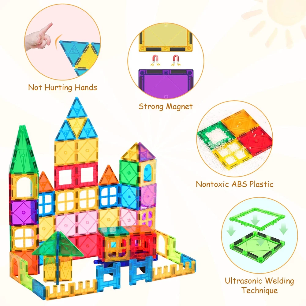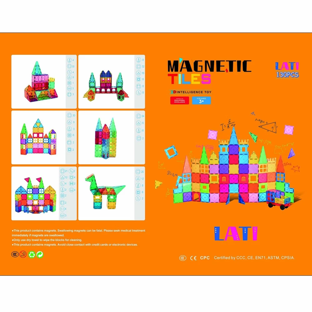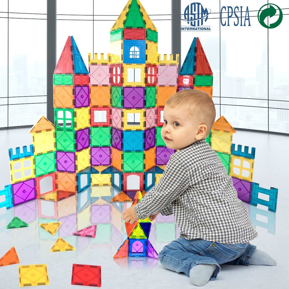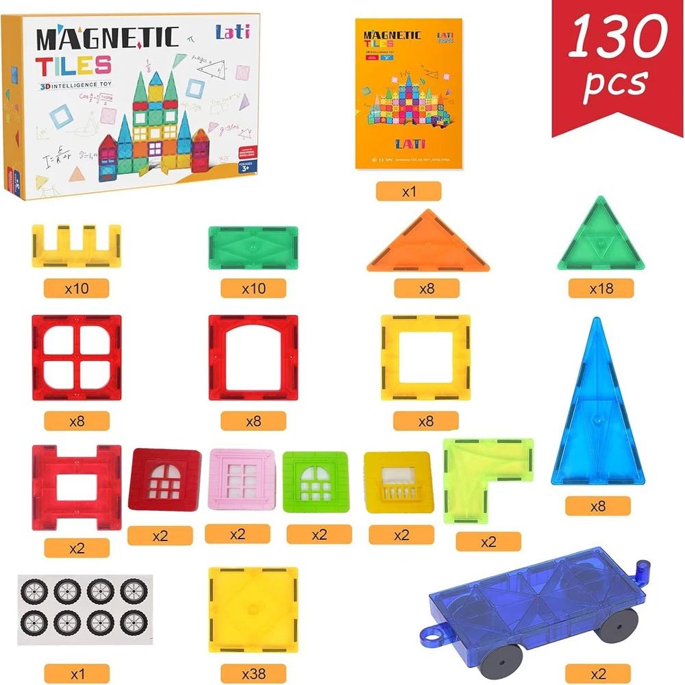 More pieces,More choice-These 130 PCS magnetic Blocks can be combined into a house, castle, bridge, animails, airplane, etc.3D color Magnetic Building Playboards can be constructed easily.Super Magnet tiles for you,more fun to play.Fully compatible with other brands. Fabulous toys for kids: Rainbow colors of magnetic tiles with high transparency,fully compatible with other brands.Looks like crystal & makes colorful shadows under the sun. Magnetic toys highly entertains all ages little boys & girls by playing with magnet tiles building set, hold them attention for a long time away from electronics! Safe & Durability: These magent toys are made of high-quality plastic, which complies with American toy standards. The surface is smooth and will not hurt the child's skin. Ideal toddler toys for age 2-4. The car wheels are finely crafted, there are no corners, don't worry about scratching your wooden floor. Fun & educational at the same time – Let your children imagination run wild and be creative.Let your children have fun while practicing their accuracy skills, hand-eye coordination and collaboration skills! Enhances the ability of logical thinking for your kids. Perfect Item for Children - Our magnetic building blocks STEM toys are made of high-quality and durable plastic pieces which would make the STEM toys a worthy choice for your children. They are especially created for teens boys and girls which are suitable for most children age 3 4 5 6 7 8 +. A great item for surprise in daily life, party, birthday, and holidays such as Christmas!