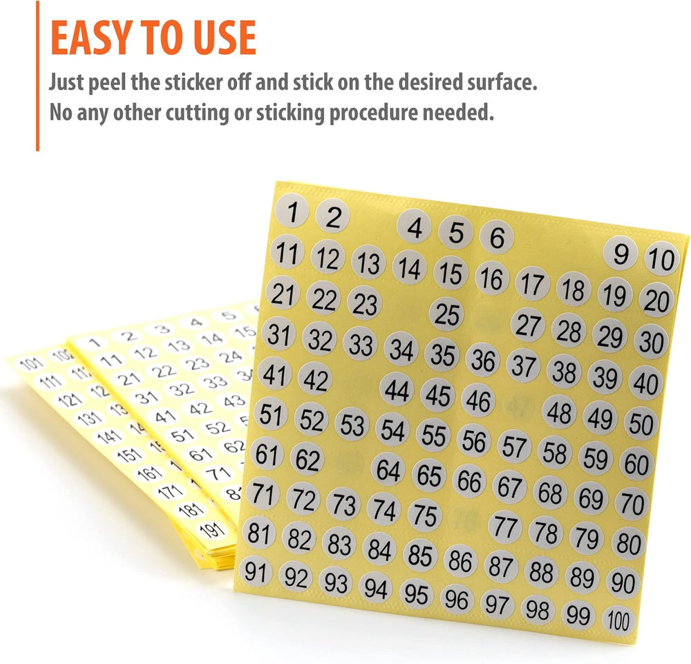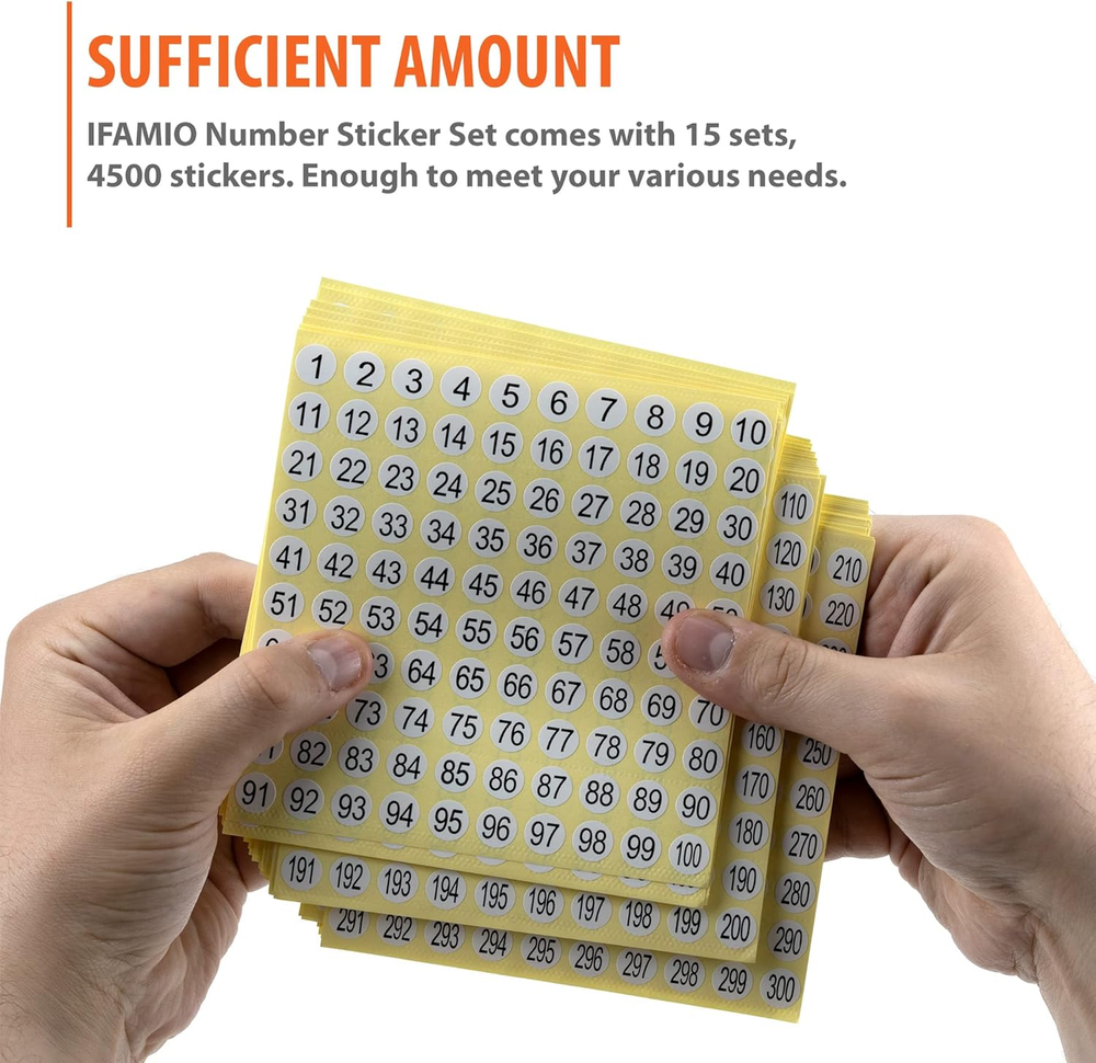 NUMBERS INCLUDE: Each sticker set has 300 round number labels, small numbers starting from number 1 to 300. PACKAGE INCLUDES: 15 sticker sets of self-adhesive number stickers, 4500 number small round stickers in total. SIZE: Small round number sticker, each of these circular stickers has a diameter of 1cm. You can stick them on boxes, bottles, files, etc. They will save you a lot of time and energy. PREMIUM QUALITY: These label stickers are easy to peel off and stick firmly on a flat surface. Perfect for home, office, and inventory storage. USEFUL: These number decals can be used as key markers, classroom labels, toolbox labels, keyboard number stickers, book bin labels, breaker box labels stickers, organizing stickers, inventory labels, etc. IFAMIO ROUND NUMBER STICKERS TINY NUMBER STICKERS FROM 1 TO 300 Suitable for home and office organizing, these adhesive number labels can be used as inventory stickers, breaker panel labels, planner number stickers, calendar number stickers, number stickers for planners, etc. You can easily stick these tiny letter stickers on any flat surface, such as a box, bottle, paper file, etc. You can also use these number stickers for the classroom. These stick on numbers will be your favorite small number decals. Using these self-adhesive small numbered stickers makes it easy for you to locate the target, they will save you a lot of time and energy! Size of small sticker numbers: These black and white decals have a diameter of 1 cm. Premium quality, these sticker numbers are easy to peel off and stick firmly on a flat surface. The package includes 15 sets of number stickers, each set starting from 1 to 300 mini circle stickers. The package comes with 4500 self-adhesive individual stickers in total. What Makes Our Inventory Sticker Labels The Best? NUMBERS INCLUDE: Each sticker set has 300 round number labels, small numbers starting from number 1 to 300. PACKAGE INCLUDES: 15 sticker sets of self-adhesive number stickers, 4500 number small round stickers in total. SATISFACTION GUARANTEED We want you to be happy with your number sticker decals, and we're committed to making sure you're happy with your purchase. If for any reason you're not satisfied, just let us know and we'll gladly offer a refund. So what are you waiting for? Get IFAMIO 4500 round number labels right now!