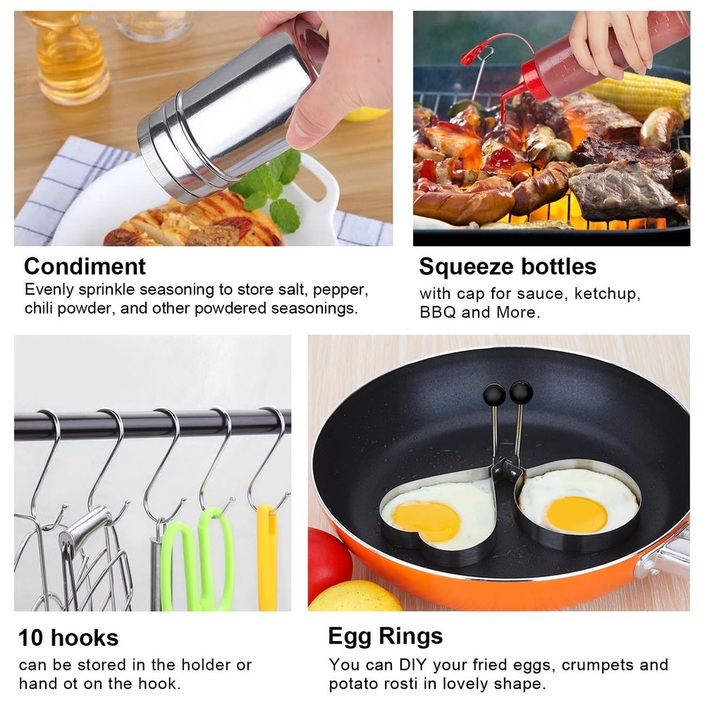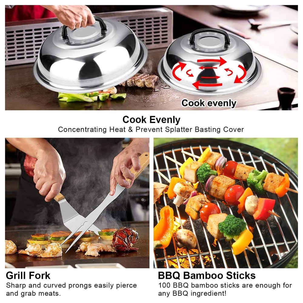 130Pcs Griddle Accessories Kit for Blackstone Wooden Grip Stainless Steel Barbecue Tool Sets with Basting Cover Spatula Scraper Egg Ring Gill Fork Hooks and Tray for Outdoor Barbecue --130PCS Griddle Accessories Kit for Blackstone, Compatible with Camp Chef & Hibachi Style – Flat Top Grill Spatula Set, BBQ Tools, Scraper, Tray, Utensils for Outdoor Cooking 【Perfect 130pcs Barbecue Accessories】This griddle accessories kit includes: 4 Griddle Spatula,1 griddle dome, 2 Egg Rings,1Scraper,1 Grill Tongs,3 Squeeze Bottles,3 Spice Shakers,1 grill fork,2 grill glove,100 grill stick ,1Slotted Turner,10 hooks,4 Griddle Spatula. Perfect for camping cooking and outdoor blackstone griddle . 【Premium-Grade Stainless Steel】Made from food-grade 304 stainless steel, this griddle accessory set is rust-resistant, heat-resistant, and built to last. BPA-free and highly durable, it's perfect for delivering top grilling performance with griddles compatible with Blackstone and other flat top grills. 【Dishwasher Safe & Portable Storage】Cleaning is a breeze with these dishwasher-safe griddle tools. The set includes a convenient storage bag, making it easy to keep everything organized and travel-ready—no more misplaced tools or cluttered drawers. 【Professional-Grade Tool Set for Any Cook】This complete griddle spatula set includes everything you need for flipping, chopping, and scraping. Perfectly compatible with flat top griddles and designed for those who enjoy precision cooking, from burgers to stir-fry. Teppanyaki lovers rejoice - with this complete griddle tools set, you can now make your favorite Japanese dishes at home or on the go. It also makes a great gift for your favorite outdoor chef.