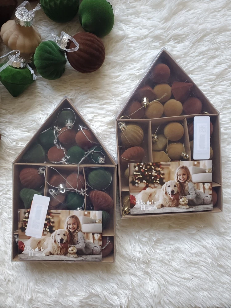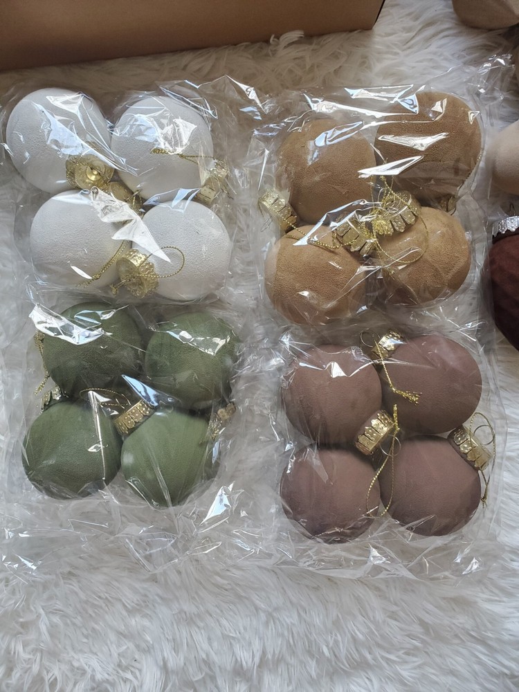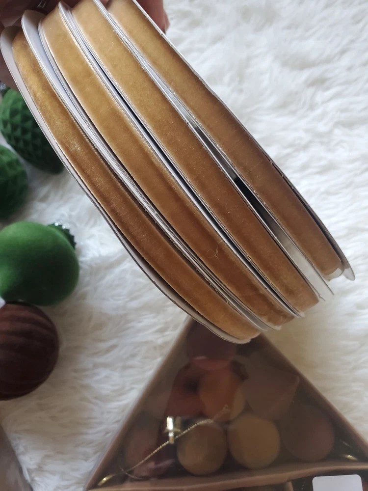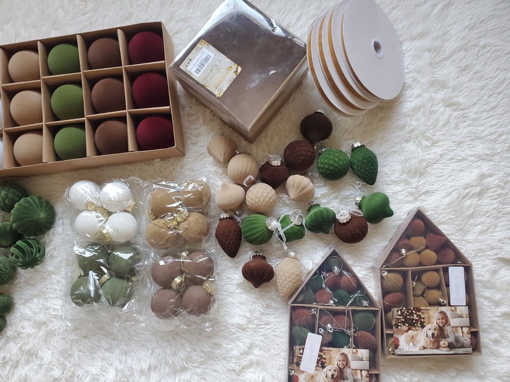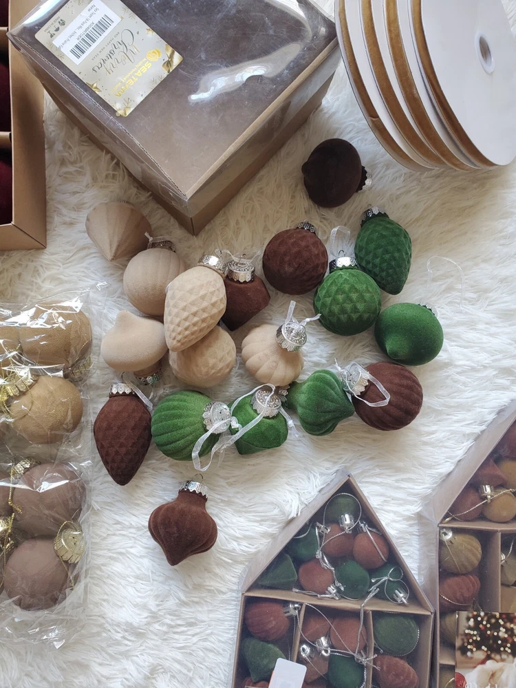 Enhance your holiday decor with this elegant, flocked velvet ornament set. Featuring a blend of green, brown, gold, copper and white colors, these ornaments add a festive touch to any home. Perfect for creating a warm and inviting atmosphere. 126 ornaments in total plus 4 - 25 yard spools of velvet ribbon.