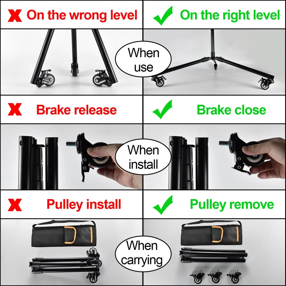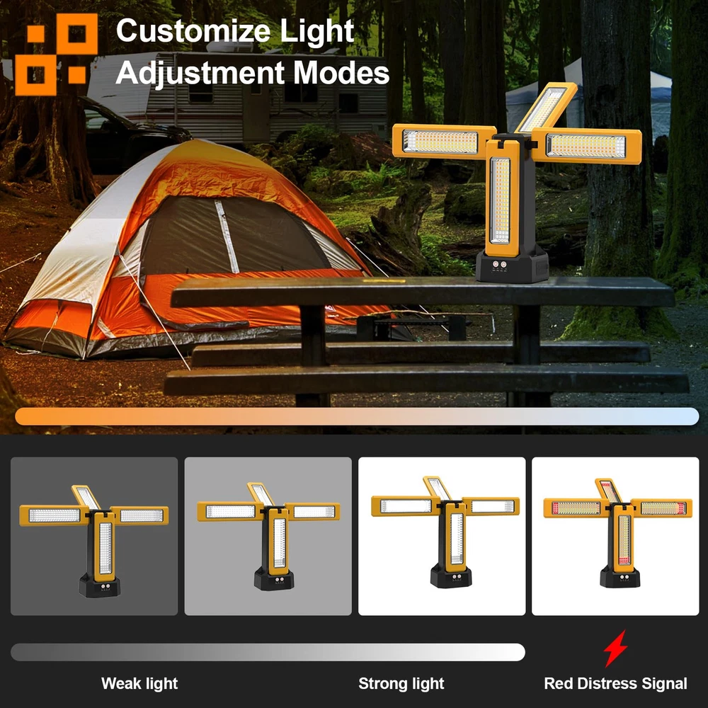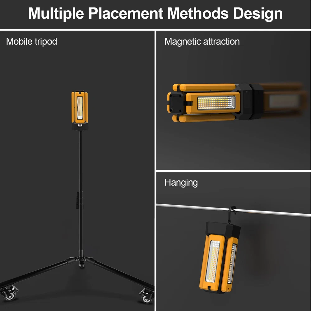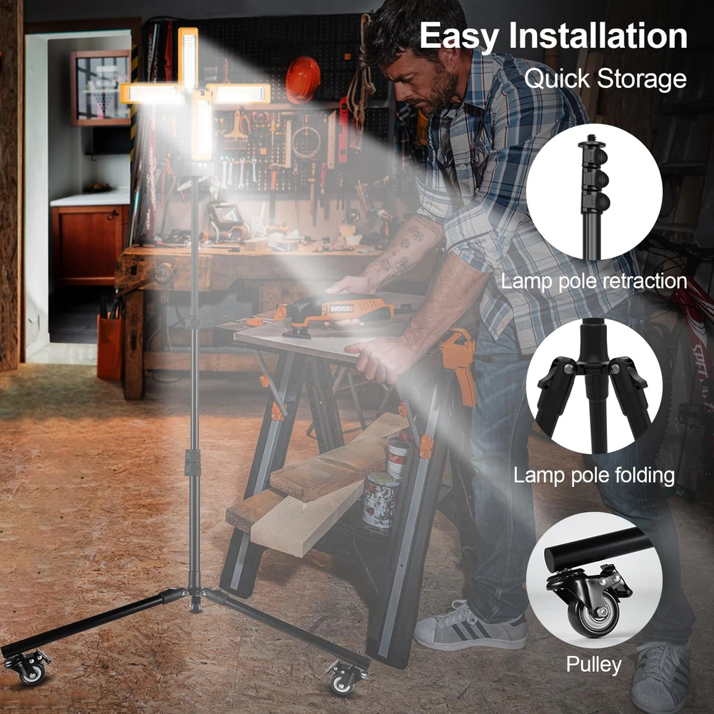 1 ⚠️ ATTENTION ⚠️ 1.The pulley can only be used when the bracket is extended to a parallel position with the ground ⚠️ 2.When installing the pulley, the pulley brake needs to be closed (default closed state)⚠️ 3.When using the storage bag, the pulley needs to be removed 【Powerful brightness and stepless dimming】Included 4X 2000 Max Lumens,you can also stepless dimming to the brightness you want.White/Warm/Nature White/RED(SOS) 4 light modes can help you deal with any situation.Long press the left button to infinitely adjust the brightness, short press the left button to switch between dual light on/4 light on modes, short press the right button to switch between four modes: white light, warm light, warm white light, and red flashing. 【Improved high capacity battery】13200mAh high capacity could keep working OVER 15 hours in normal use and work in lowest lumens OVER 30 hours ,also could charge for your phone or other electric device through the usb port. 【NOTE】Due to the genuine 13,200mAh large capacity battery in our lamp, it will take over 8 hours to fully charge when the battery is depleted. Please be patient. 【IP64 Waterproof】 Our work light features an IP64 waterproof rating, ensuring complete dust protection and resistance to water splashes from any direction. Perfect for outdoor use, it guarantees durability and reliable performance in challenging environments. 【Freedom rotating lights blades】 Featuring by quadruple led lamp heads, it assures a better coverage of illumination. With adjustability of vertically 180°and horizontally 270°rotation,could lights up any corner you want. 【Multi section adjustable folding bracket】Come with a folding bracket,3 height controllers in main pole , three adjustable buckles at the foot joints,you can adjust the bracket to any angle you want. 【Convenient carrying bag】Come with a high quality carrying bag could hold the lights and bracket,also could be a normal bag to carry the little things when you go out working or traving. 【After-sale service】If you encounter any issues after receiving the product, please visit the store page and send us a message to notify us. We have professional customer service available 24/7 who will quickly resolve your issues and provide you with a perfect free after-sales experience.