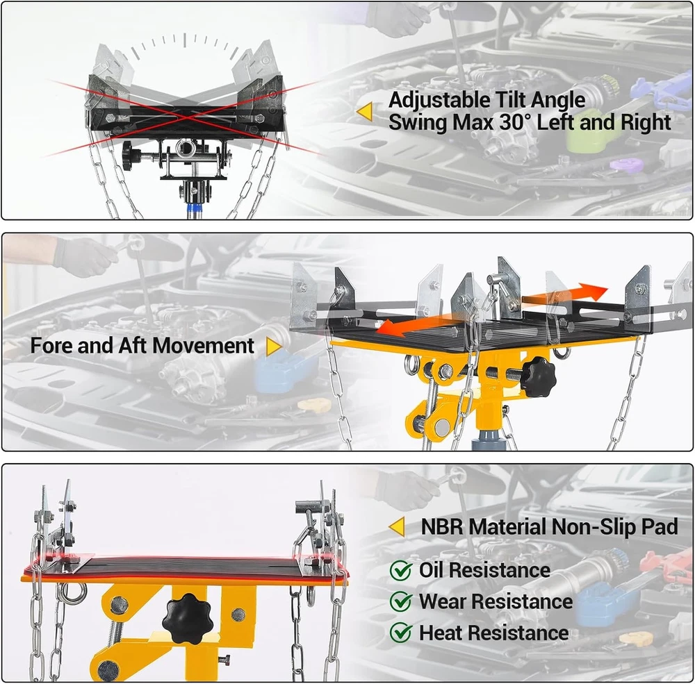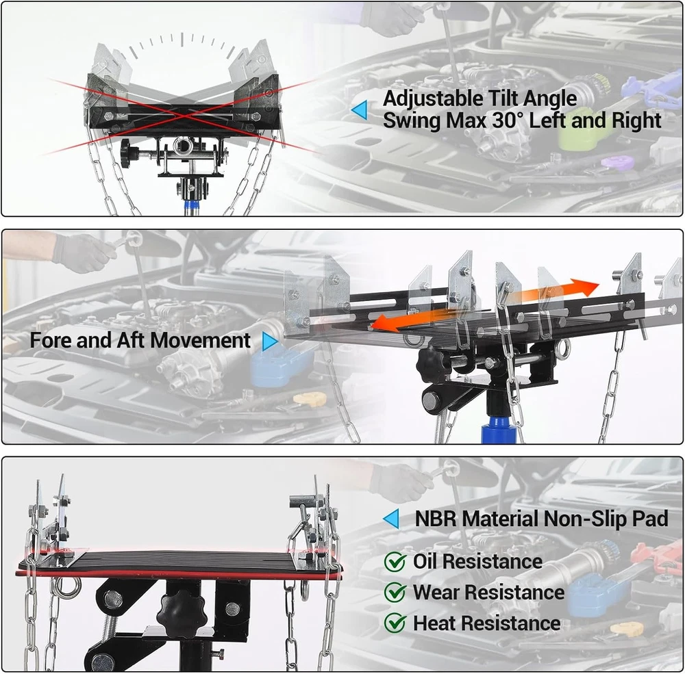 Specifications: Style: 1322 lbs Lifting range:33.5"-69" Material:Carbon Steel Vehicle Service Type:Car Features: 【Advanced Dual Plunger Hydraulic System】- The Hydraulic transmission jack features an innovative dual plunger design, enabling it to reach maximum lifting height in just 20 seconds—significantly faster than traditional single plunger jacks. This efficiency helps streamline the removal, installation and transportation of transmissions and transfer cases on vehicles supported by lifts, saving you valuable time in your automotive tasks. 【1322 LBS Load Capacity】- This hydraulic transmission jack is engineered from robust carbon steel, ensuring exceptional durability and strength, and maximum load capacity is up to 1322lbs. Its wide base provides enhanced stability, while the two heavy-duty safety anchor chains securely hold the load in place, allowing for safe and efficient transmission service. In addition, it comes with an 8MM thick anti-slip pad to ensure safe load. 【33.5"-69" Adjustable Lifting Height】- Featuring a two-stage telescoping design, our transmission jack adjusts effortlessly from 33.5 inches to 69 inches. This versatility is complemented by a convenient foot-operated pedal and a 30° tilting tray, accommodating various vehicle models and transmission sizes for optimal usability. 【Stable & Precise Control】- Our dual hydraulic lifting system utilizes a foot pedal mechanism, providing superior control compared to manual options. When the handle is released, the foot pedal enables slow and controlled descent of the transmission, ensuring precise positioning during repairs and minimizing the risk of damage to components. 【Effortless Mobility】- Our professional hydraulic transmission jack is equipped with four swivel casters, two of which have brakes, facilitating smooth movement and security between vehicles. An auxiliary ring located at the center of the jack enhances mobility, allowing for easy pushing or pulling by hand during transport. 【Versatile Applications】- This heavy-duty hydraulic transmission jack is ideal for America's automotive professionals and enthusiasts alike, perfect for the installation and removal of various automotive and light truck transmissions, making it a must-have tool for any workshop or garage. Payment Delivery Returns Feedback We accept Payoneer only. All major credit cards are accepted through secure payment processor PayPal. Payment must be received within 7 business days of auction closing. If you have bought multiple items from me, you can send me one payment for all the items instead of paying for them individually. When you click the Pay Now button, eBay will automatically determine if there are other items you have won or purchased from me and will combine them for your review. NOTE: Import duties, taxes and chargers are not included in the item price or shipping charges. These charges are the buyer's responsibility. Please check with your country's customs office to determine what these additional costs will be prior to bidding buying. 1. We will delivery out at the handing time when we receive the payment. 2. The delivery time is 3-5 business days to US by usually time.The parcel maybe delay 1-2day of the weekend.Due to the bad weather,Holidays,Hot Season ect.the parcel maybe delay,If you have any problems,mssage us,we will try our best to solve it. 3. We ship to your eBay address. Please make sure your eBay address is correct before you pay. 4. If you want to change the shipping address,message us before our send out. 5. We cannot deliver your order if your state is PR. 1. If you donot receive the items at the delivery time,the parcel has broken/missing,Please message us before you open case/return,we will try our best to solve it. 2. We offer a 30 day return policy from checkout winning date. 3. An RMA number is required for all returns. Message us for return instructions. Items Returned without a RMA number will not be processed. 4. Items defective upon receipt must be packaged in their retail packaging as if new and returned with a detailed description of the problem. 5. Return shipping fees are not refundable.We reserve the right to decline any returns if the above guidelines are not followed. If you are not satisfied with the item for any reason, please do not quick to leave negative/neutral feedback even open request and case without any communication with us. We devote ourselves making EVERY CUSTOMER in 100% Satisfactory and resolve any problem. Thank you for your understanding and recognition,we are always leave positive feedback to all our customers. About Reply: All replies will be sent to your email box, if you do not get response within 24 hours (Sat. & Sun. excluded) please check your eBay My Messages in case that our emails will be filtered automatically by your settings.