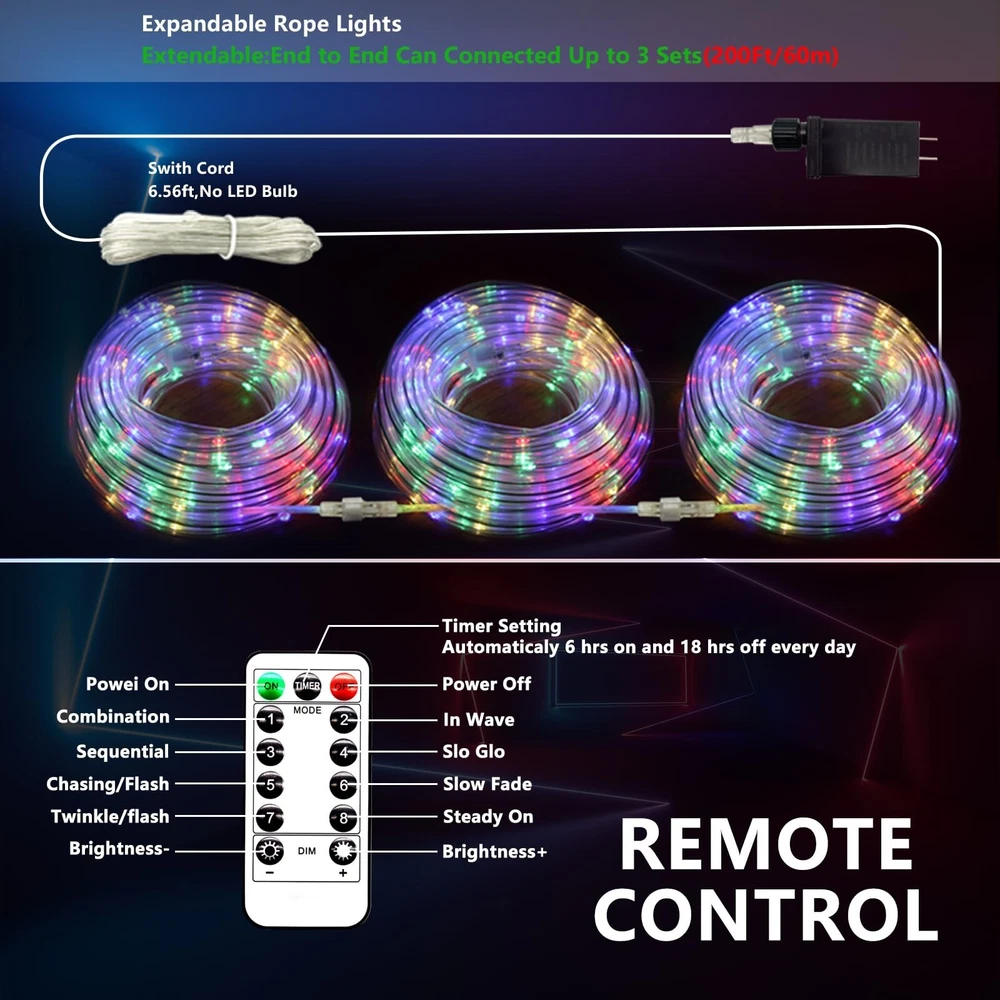 132FT Rope Lights for Outside,2 Pack 66FT Connectable String Lights Outdoor Waterproof IP67,8 Modes 400 LEDs Rope Lighting for Garden,Party,Indoor Bedroom,Christmas Eaves Decor,Coloured Product Details Size: 132FT Brand: Cattlite MPN: 132Ft rope light-Multicolor UPC: Does not apply EAN: Does not apply Color: Multicolor Brand: Cattlite Indoor/Outdoor Usage: Outdoor Special Feature: Corded Light Source Type: LED Power Source: Corded Electric Light Color: Multicolor Theme: decoration Occasion: outdoor and indoor Style: Multicolor Package Dimensions : 6.81 x 6.77 x 4.49 inches; 1 Pounds Item model number : 132Ft rope light-Multicolor Batteries : 1 Lithium Ion batteries required. (included) Date First Available : December 6, 2022 Manufacturer : Cattlite Customer Reviews: 4.0 4.0 out of 5 stars 83 ratings Color: Multicolor Brand: Cattlite Indoor/Outdoor Usage: Outdoor Special Feature: Corded Light Source Type: LED Power Source: Corded Electric Light Color: Multicolor Theme: decoration Occasion: outdoor and indoor Style: Multicolor Material: 132FT(2x66FT) Controller Type: button Number of Light Sources: 400 Included Components: 2x66Ft rope lights, 1x power adapter, 1x remote control, 1x user manual Item Weight: 16 ounces Number of Items: 2 Control Method: Remote Water Resistance Level: Waterproof Number of Batteries: 1 Lithium Ion batteries required. (included) Seasons: winter or multiple seasons Manufacturer: Cattlite Part Number: 40m Item Weight: 1 pounds Package Dimensions: 6.81 x 6.77 x 4.49 inches Item model number: 132Ft rope light-Multicolor Batteries: 1 Lithium Ion batteries required. (included) Special Features: Corded Batteries Included?: Yes Batteries Required?: No Date First Available: December 6, 2022 Indoor and Outdoor Decorative Rope LightsLED Rope Lights have 400 LEDs, coloured lights, cannot adjust single colour.8 kinds of blinking effects, auto loop/wave/sequence/lo-glo type/chase/blinking/slow fade/flashing/full brightness. Perfect for parties, weddings, bars, gardens, patios, balconies, porches, windows, trampoline,gaming,canopy tent,deck,camping and so on, brings a romantic and joyful atmosphere to your space in just a few seconds! Super Flexible Our rope lights for outside can be easily bent into any shape you like, and the soft plastic tube prevents the string lights from getting tangled (don't worry about spending hours untangling the strings!). . The rope light has cuttble signs,we can cut it there.Perfect for your creative DIY projects, ready to meet your decorative needs. Auto Timer & Memory FunctionOutdoor rope Lights also come with a timer function, The timer keeps 6 hours On and 18 hours Off once activated. Build in Memory chip save your last modes setting and no need to reset mode every day.Please note that you cannot plug or unplug the light string and turn off the power after setting the timer mode. Otherwise the timer mode will be cleared. Super Flexible Our rope lights for outside can be easily bent into any shape you like, and the soft plastic tube prevents the string lights from getting tangled (don't worry about spending hours untangling the strings!). . Perfect for your creative DIY projects, ready to meet your decorative needs.It fits many festivals,such as Engagement, Christmas, Wedding, Anniversary, Halloween, Valentine's Day and so on. About Packaging ,Quality&ServicePackage includes 2x66Ft rope lights, 1x plug in power adapter, 1x remote control, 1x user manual. Turn any space into an enchanting wonderland with our charming decorative string lights. Perfect for patios, gardens, lawns, staircases, front doors, pool shades, roofs, ceilings, trees and fence decorations. If you have any problem with this product, please don't worry, contact us immediately, we will be responsible for any quality issues."