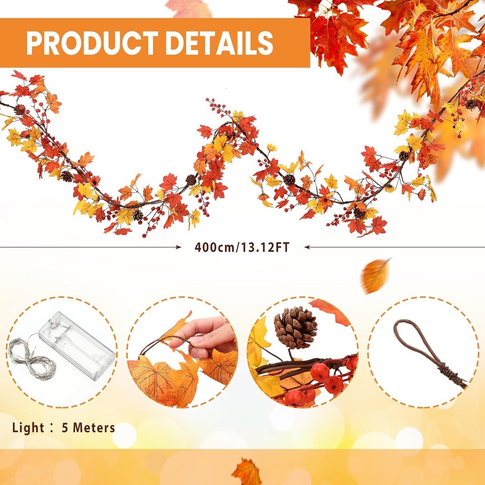 Jutom Fall Decor 13.2 ft Garland with 50 Lights Autumn Maple Leaf Orange LuxeFusion Product Description Features: Nice for the autumn and especially befitting for Thanksgiving, this garland is a warm, inviting touch to any room. As an autumn thanksgiving garland, it delivers a rich, full, and quality look to complement the occasion. This isn't just a typical fall garland but a piece coupled with twinkling lights. The lights intertwined among the leaves bring a magical, warm glimmer to your decor, turning your space into an autumn spectacle everyone will adore. Specifications: Color: orange Size: 13.2 ft / 4mPackage includes: 1 x fall garland with lightsNotes: Manual measurement, please allow slight errors on size. The color may exist a slight difference due to different screen displays. Features Package Content: each package includes a fall garland with lights; This is a 13.2 ft autumn garland adorned with sunflower, pine cones, and a variety of leaves; Just arrange it as you please and let the festivity envelop your home Realistic Maple Leaves: the quality of our festive garland is top notch, made from materials that are carefully Choose; Additionally, the pumpkins and pine cones are firmly attached ensuring they won't fall, giving you a product you can rely on; This fake fall garland in autumn provides ample length for winding around columns, draping over doorways Brilliant Autumn Colors: the mix of autumnal elements makes this garland the ideal accent for fall home decor; The stunning color blend epitomizes the essence of fall, adding a heartwarming touch to your home Versatile Thanksgiving Decor: this versatile Thanksgiving autumn garland is nice for an array of uses including as a fall wedding arch, door decor, mantelpiece, and even for Thanksgiving and Halloween decorations; You can also incorporate it into your garden decor, table centerpiece, swings, and stair railings Warm Tips: due to the journey, the garland may arrive slightly crushed or deformed; However, you can effortlessly restore it to its original form simply by using a hairdryer Product Details Is Artificial Garland: Yes Is Lighted: Yes Shape: Rectangular Manufacturer: Jutom Item Weight: 2.1 pounds Package Dimensions: 13.23 x 12.6 x 3.7 inches Country of Origin: China Brand: Jutom Color: Orange Material: Resin, Plastic Item Length: 13.2 Feet Plant or Animal Product Type: Maple, Sunflower, Pine Cone Free Shipping All orders ship free and fast to your doorstep. Easy Returns Satisfaction guaranteed. 30-day returns, no questions asked. 24/7 Support Contact us anytime; we’re here to help, day or night. Brought to you by LuxeFusion – Quality you can trust.