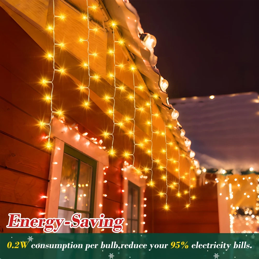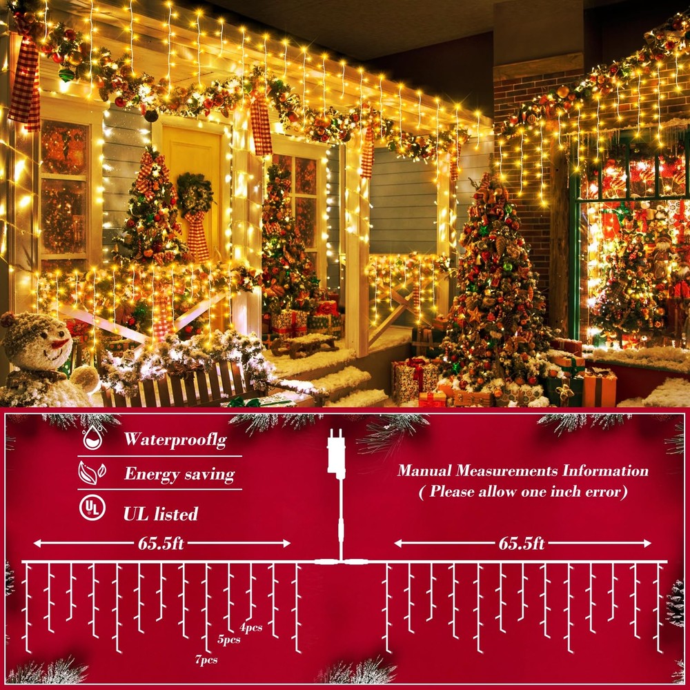 Christmas Decoration Ice Lights: These Ice String Lights are 132ft long with 240 drops, and they feature 1280 quality crystal clear led lights.HANGING FROM ROOF LINES, PORCHES FENCES AND RAILINGS,IT WILL INSTANTLY TRANSFORM YOUR DECORATED SPACE INTO FUN, RELAXING, COZY AND FESTIVE. 8 Lighting Modes: You can choose from 8 different lighting modes (Combination, In Waves, Sequential, Slo-glo, Chasing/Flash, Slow Fade, Twinkle/Flash, and Steady On.) for an extra festive display.CUSTOMIZE YOUR OWN MOOD LIGHTING,MAKING THE HOLIDAYS SPECIAL THIS YEAR WITH SOME BRIGHT LIGHTS AND COLORFUL CHEER. Timer and Memory Function: The outdoor Christmas lights built in timer function:6 hours on 18 hours off.Memory function can recover from the previous setting mode when you restart. Plug the led outdoor christmas lights into an outdoor timer, preferably one that automatically turns on when it gets dark out. UL Listed For Outdoor: brand Christmas fairy string lights are IP44 waterproof and built to stand up against harsh environmental elements while maintaining safe connections.NOVEL AND CLASSIC DESIGN,IT’S PERFECT FOR DECORATING CHRISTMAS,NEW YEAR,ANNIVERSARY, BIRTHDAY ,VALENTINE'S DAY, WEDDING,ETC. High-End Christmas lights: The 8 modes are carefully designed to provide a variety of choices while greatly reducing energy consumption. The timer function precisely controls the time of use, realising the efficient use of energy and contributing to sustainable development.